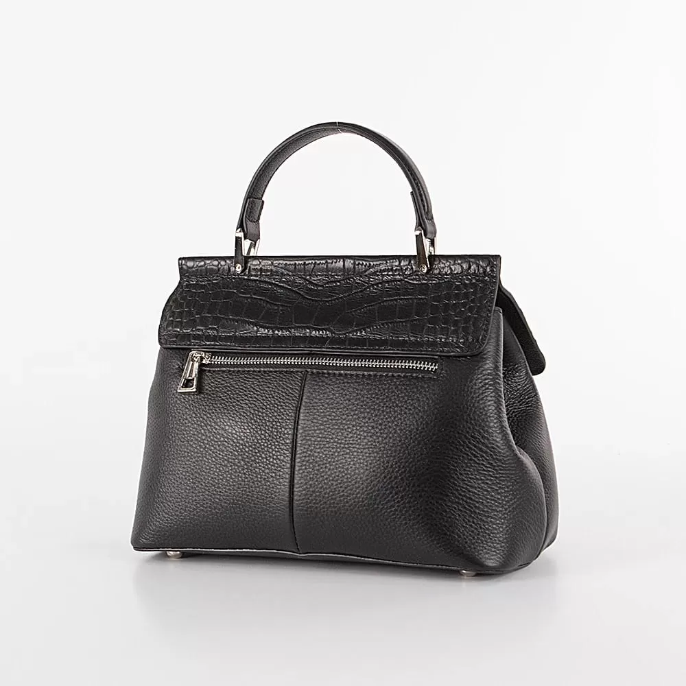 Сумка закрывается клапаном на двух магнитных кнопках, который украшен тиснением под крокодиловую кожу. Внутри имеется отделение на молнии. Подкладка выполнена из фирменного материала, а также есть внутренний карман на молнии. На задней стороне сумки расположен ещё один карман на молнии.
