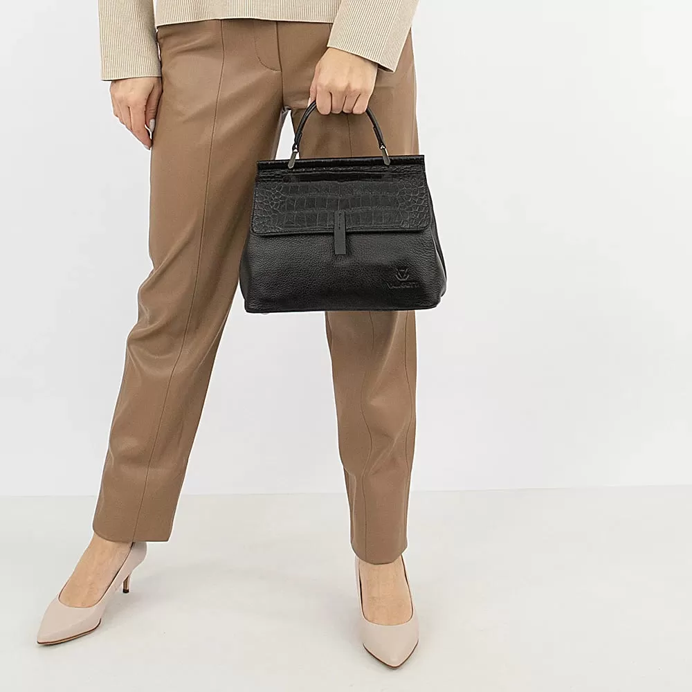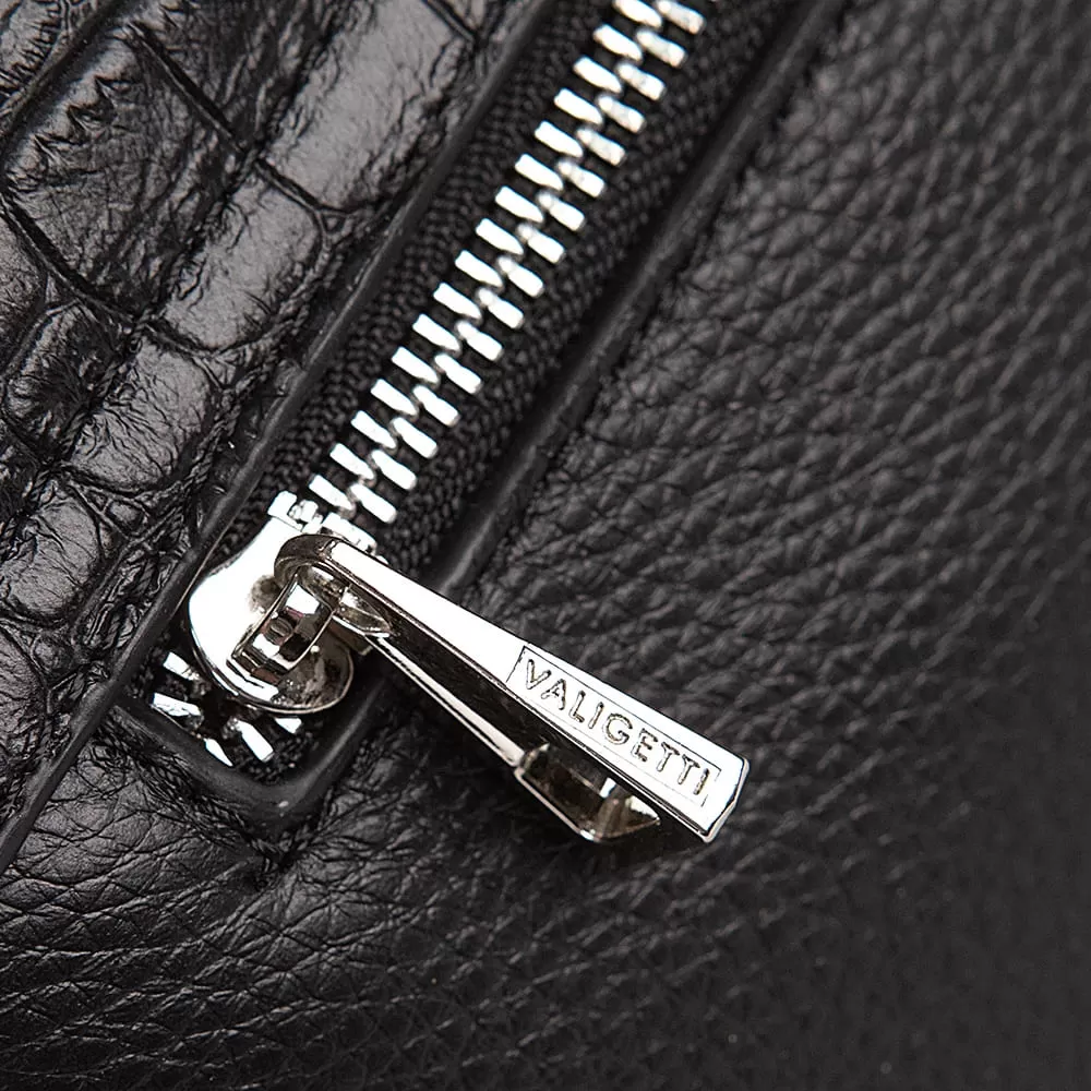 Сумка от Valigetti выполнена из натуральной кожи черного цвета. Она оснащена одной короткой ручкой и двумя съемными регулируемыми плечевыми ремнями, один из которых изготовлен из текстильного материала.