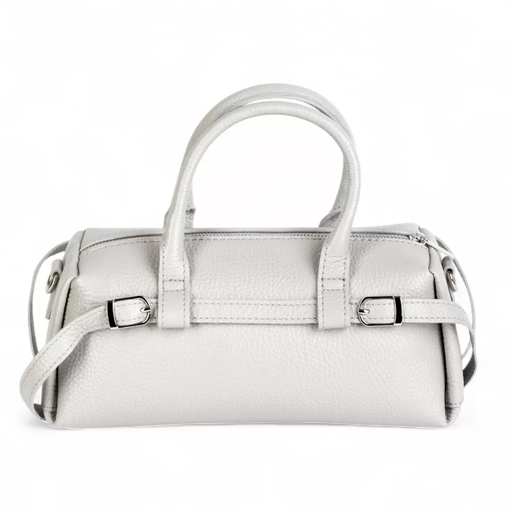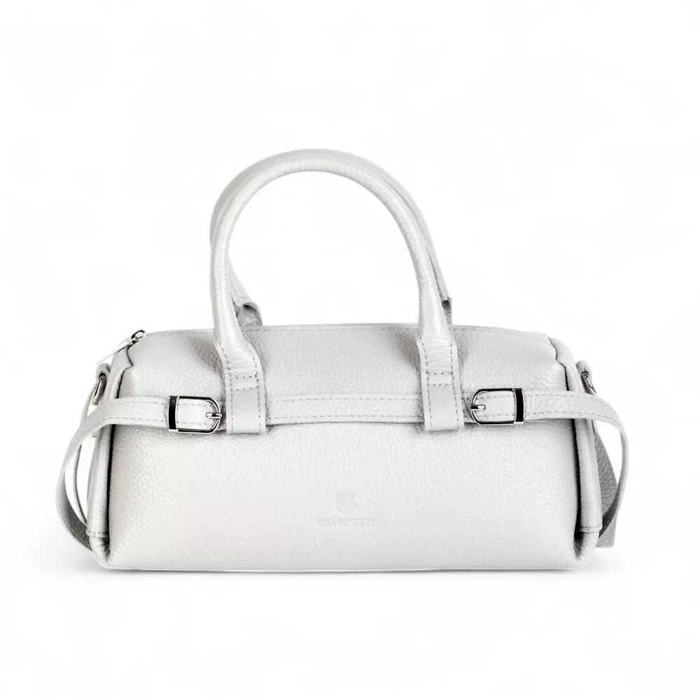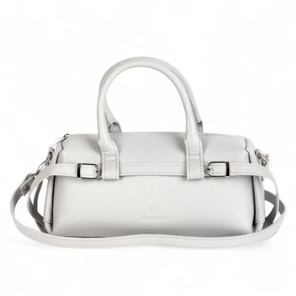Сумка из натуральной кожи бренда Valigetti. Она оснащена съёмным плечевым ремнём. Внутри одно отделение на молнии с карманом и текстильной подкладкой. Украшена серебряной фурнитурой.