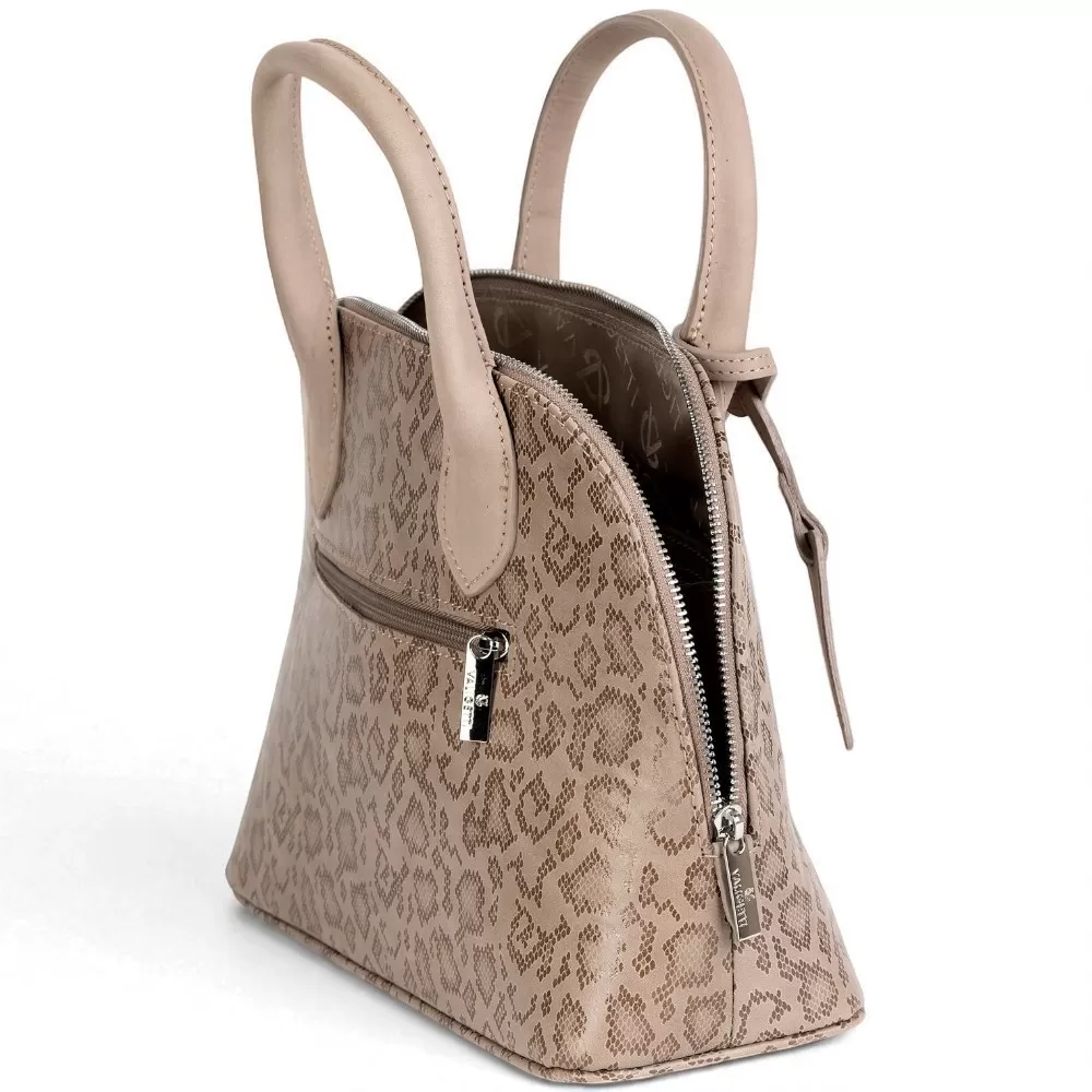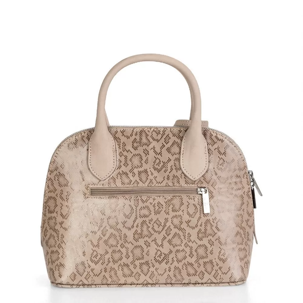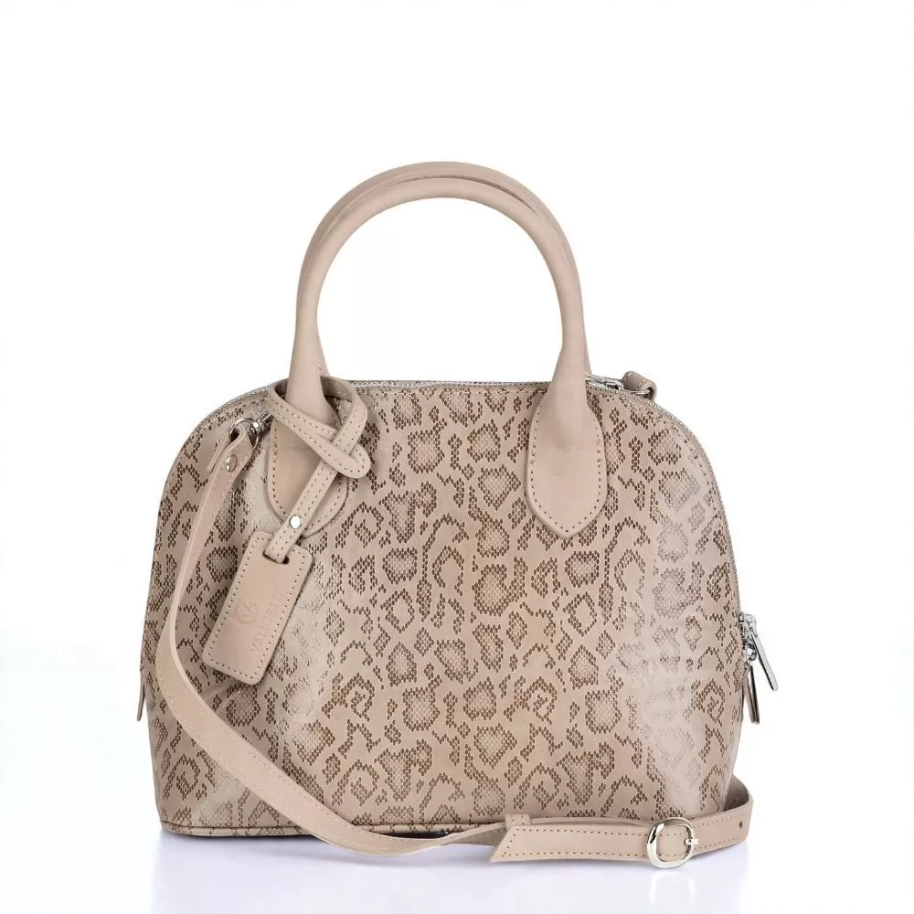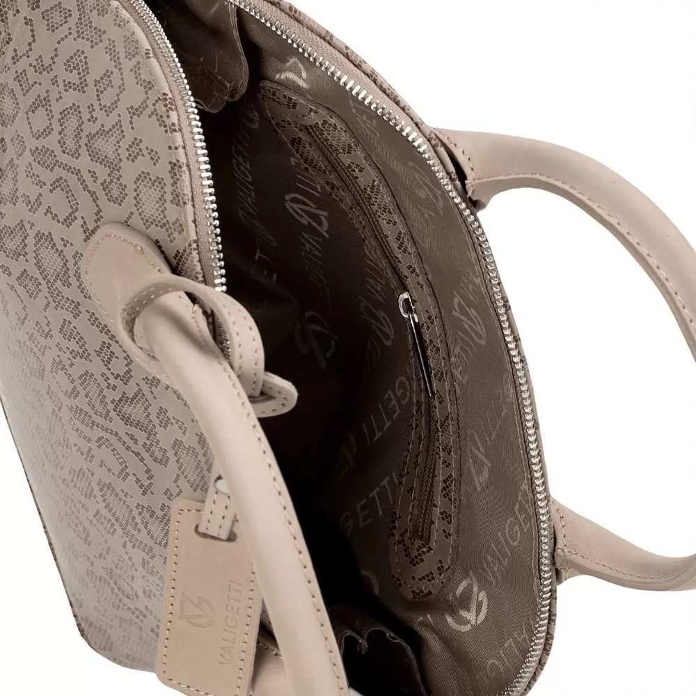 Сумка от бренда Valigetti из натуральной кожи выполнена в бежевом цвете. Модель с двумя ручками и съемным плечевым ремнем. На задней стороне карман на молнии для быстрого доступа. Внутри одно основное отделение с фирменной подкладкой, накладной карман и карман на молнии. На дне сумки ножки для защиты от износа и загрязнений.