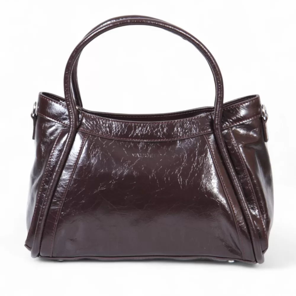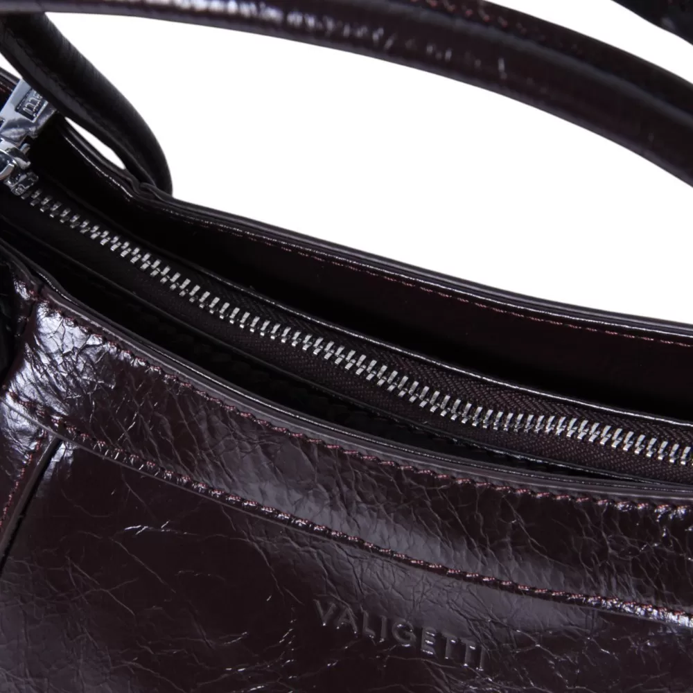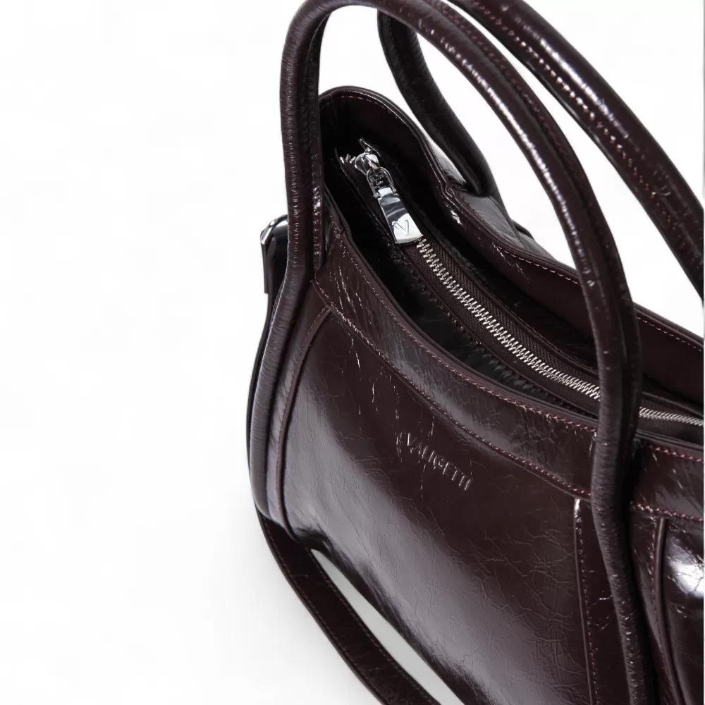 Сумка Valigetti изготовлена из натуральной кожи темно-бордового оттенка. У модели длинные ручки (40 см) и съемный плечевой ремень (120 см). На задней стороне сумки расположен горизонтальный карман с молнией для быстрого доступа. Внутри есть одно основное отделение с молнией, фирменный подклад, накладной карман и отдельный карман на молнии. У сумки есть ножки для защиты от загрязнений и износа.