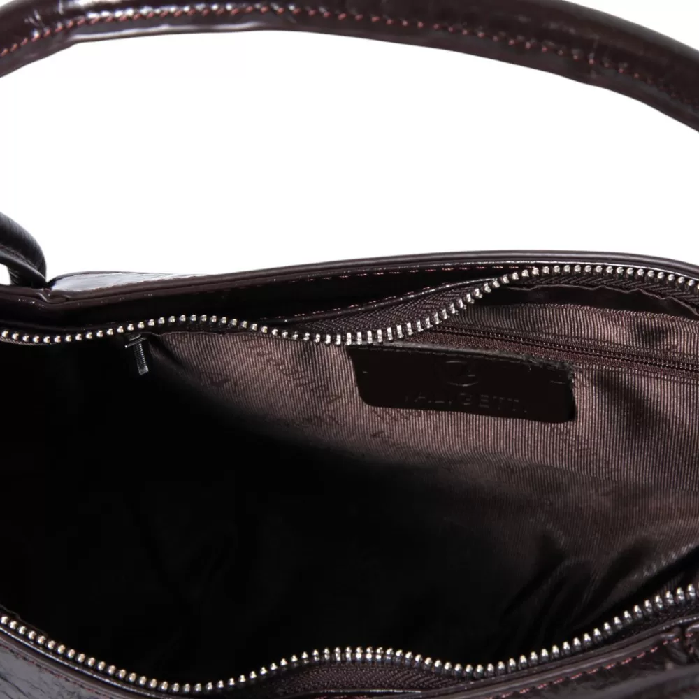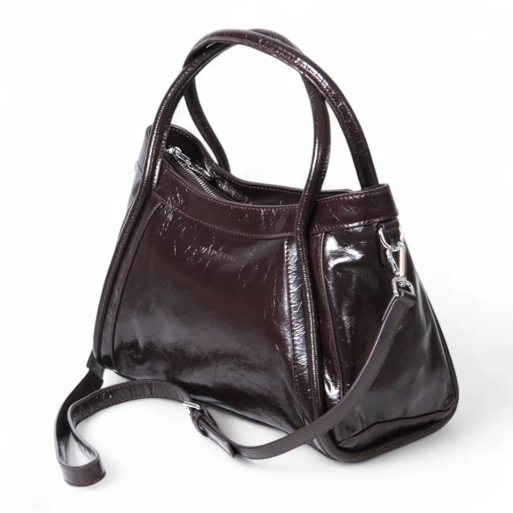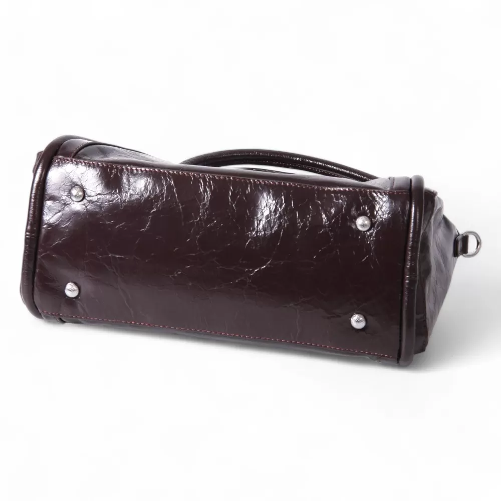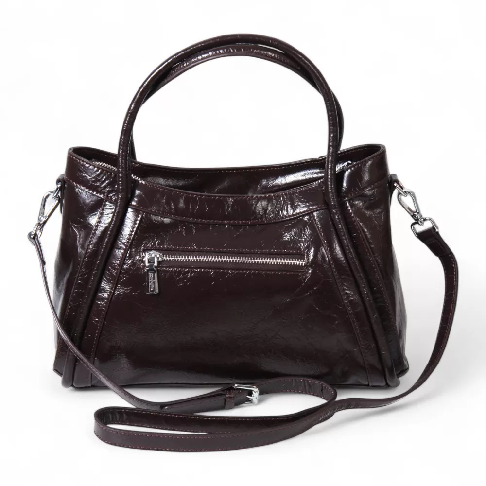 Сумка Valigetti изготовлена из натуральной кожи темно-бордового оттенка. У модели длинные ручки (40 см) и съемный плечевой ремень (120 см). На задней стороне сумки расположен горизонтальный карман с молнией для быстрого доступа. Внутри есть одно основное отделение с молнией, фирменный подклад, накладной карман и отдельный карман на молнии. У сумки есть ножки для защиты от загрязнений и износа.