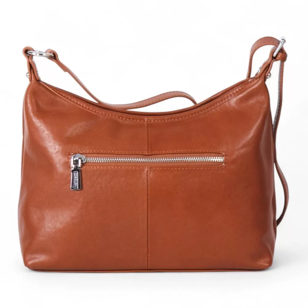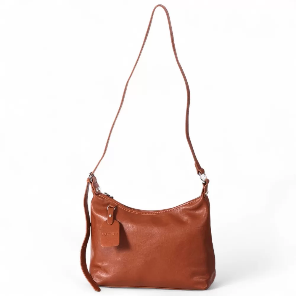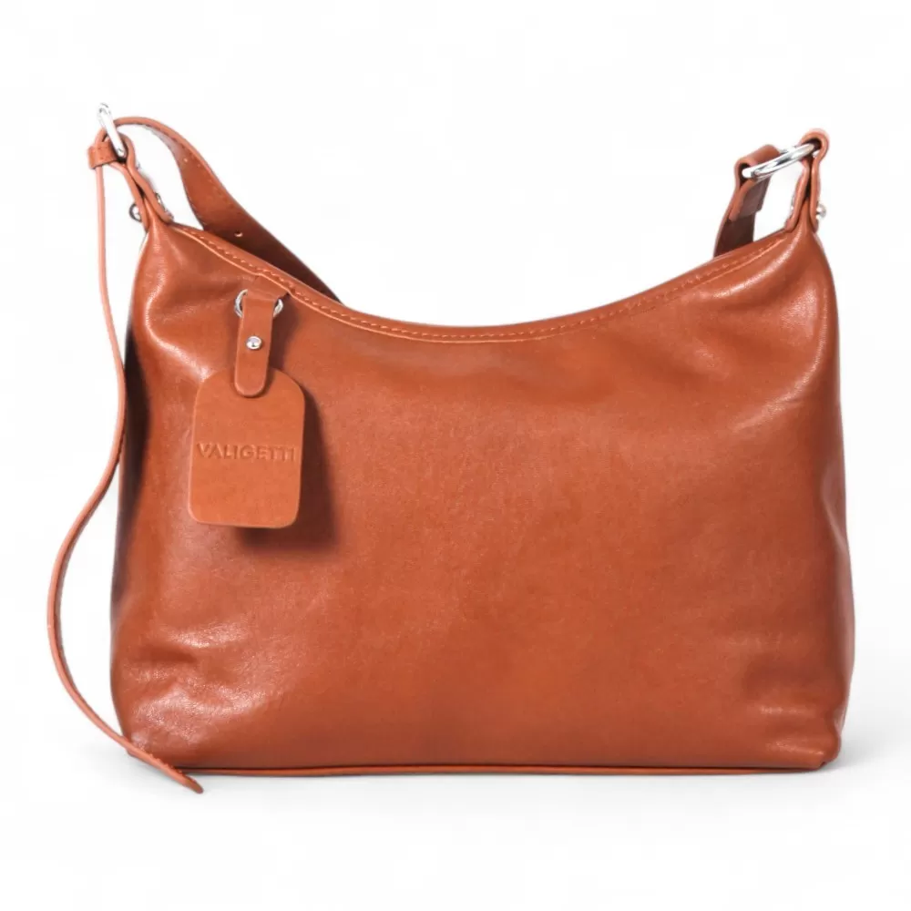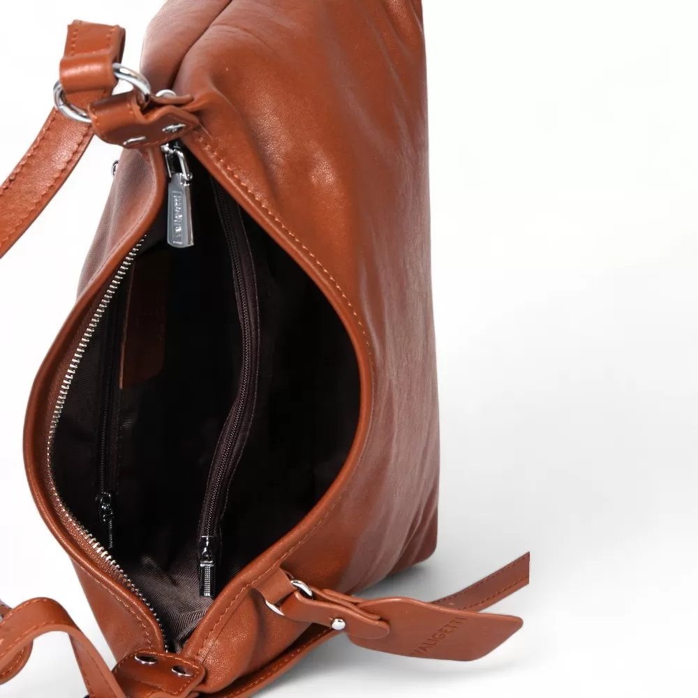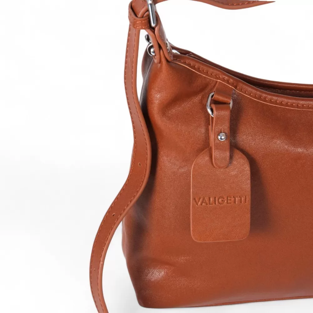 Сумка Valigetti изготовлена из натуральной кожи светло-коричневого оттенка. Модель оснащена несъемным регулируемым ремнем через плечо. На задней стороне сумки — горизонтальный карман с молнией для быстрого доступа. Основное отделение закрывается на молнию. Внутри — фирменный подклад, накладной карман, маленький и средний карманы на молнии.