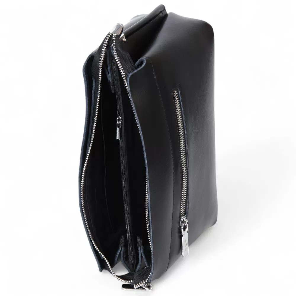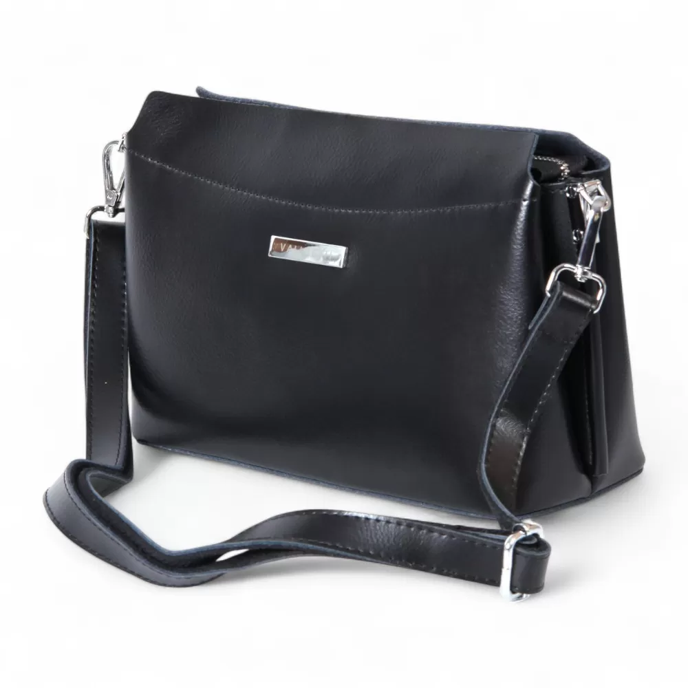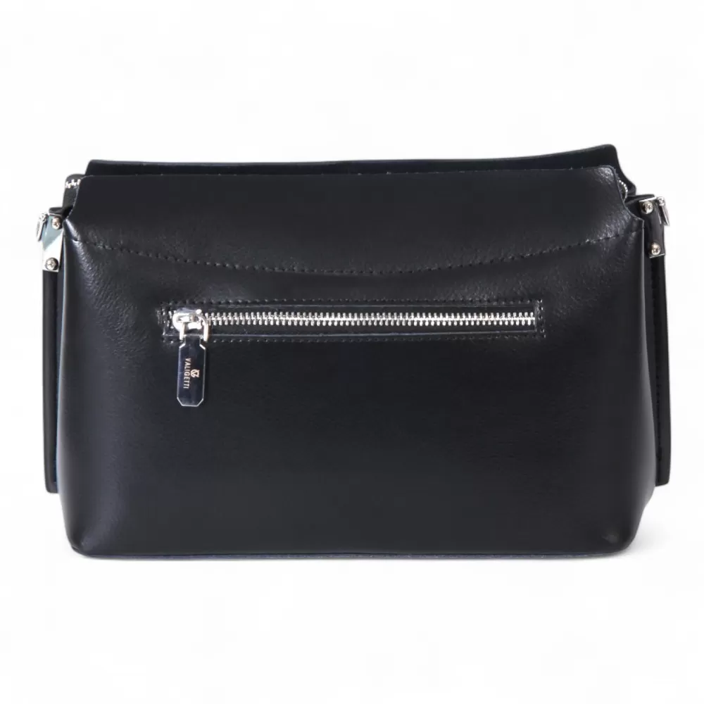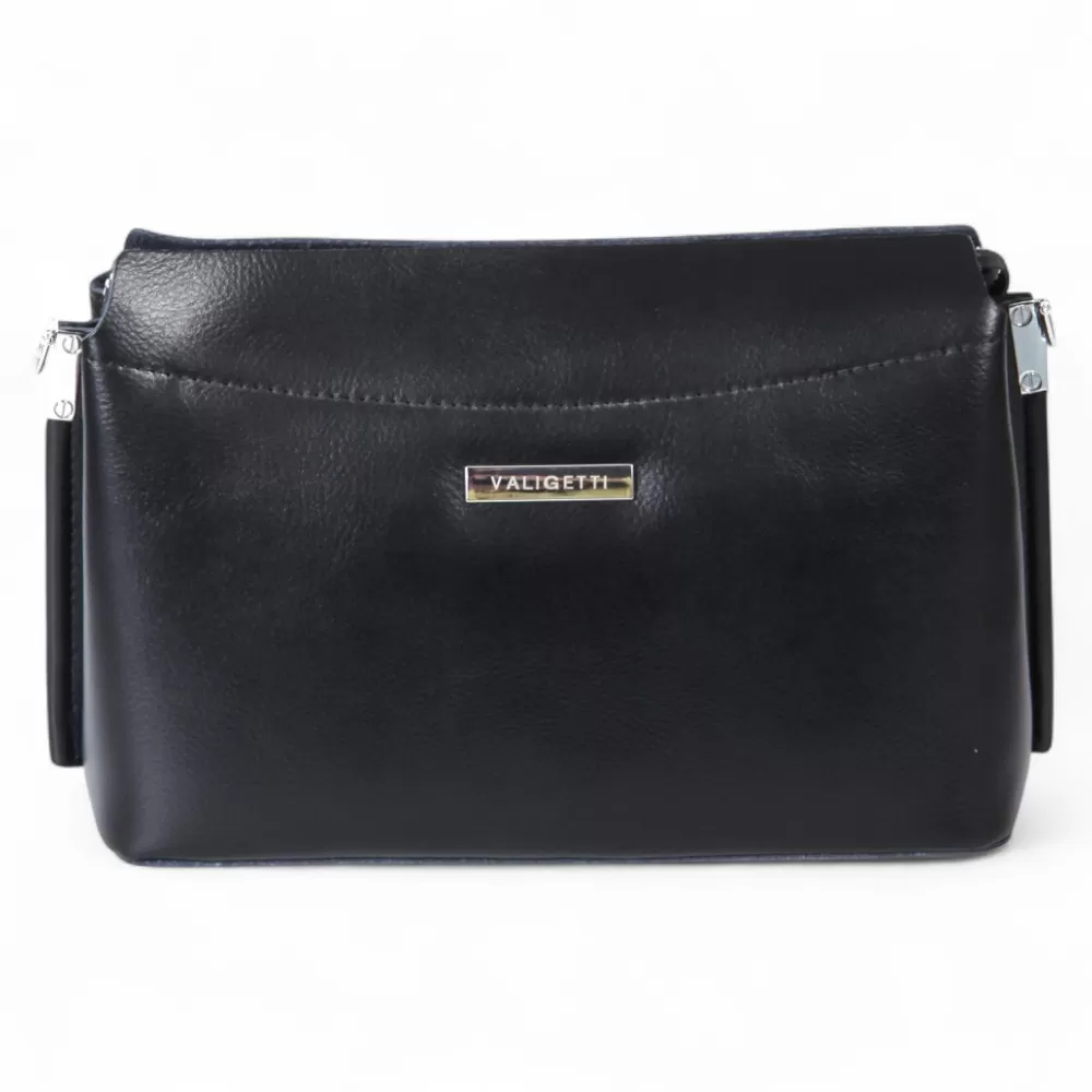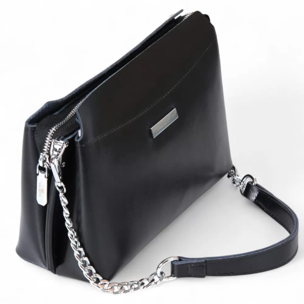 Сумка от бренда Valigetti из натуральной кожи выполнена в черном цвете. Эта модель оснащена съемным регулируемым плечевым ремнем и ручкой на цепочке. На задней стороне есть горизонтальный карман на молнии для быстрого доступа. Внутри одно основное отделение с фирменной подкладкой, карман на молнии посередине, боковой карман на молнии и накладной открытый карман. У сумочки есть ножки, которые защищают ее от износа и загрязнений.