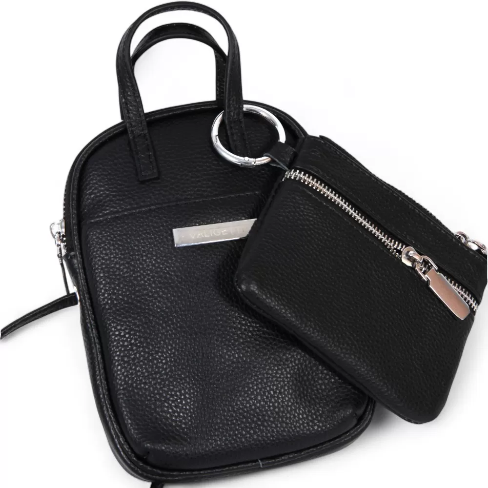 Сумка от бренда Valigetti выполнена из натуральной кожи выполнена в черном цвете. Модель с двумя ручками и регулируемым плечевым ремнем. Сзади и спереди два накладных кармана на молнии. Основное отделение закрывается на молнию. Внутри — фирменная текстильная подкладка. Есть один накладной открытый карман. В комплекте — подвесной кошелек.