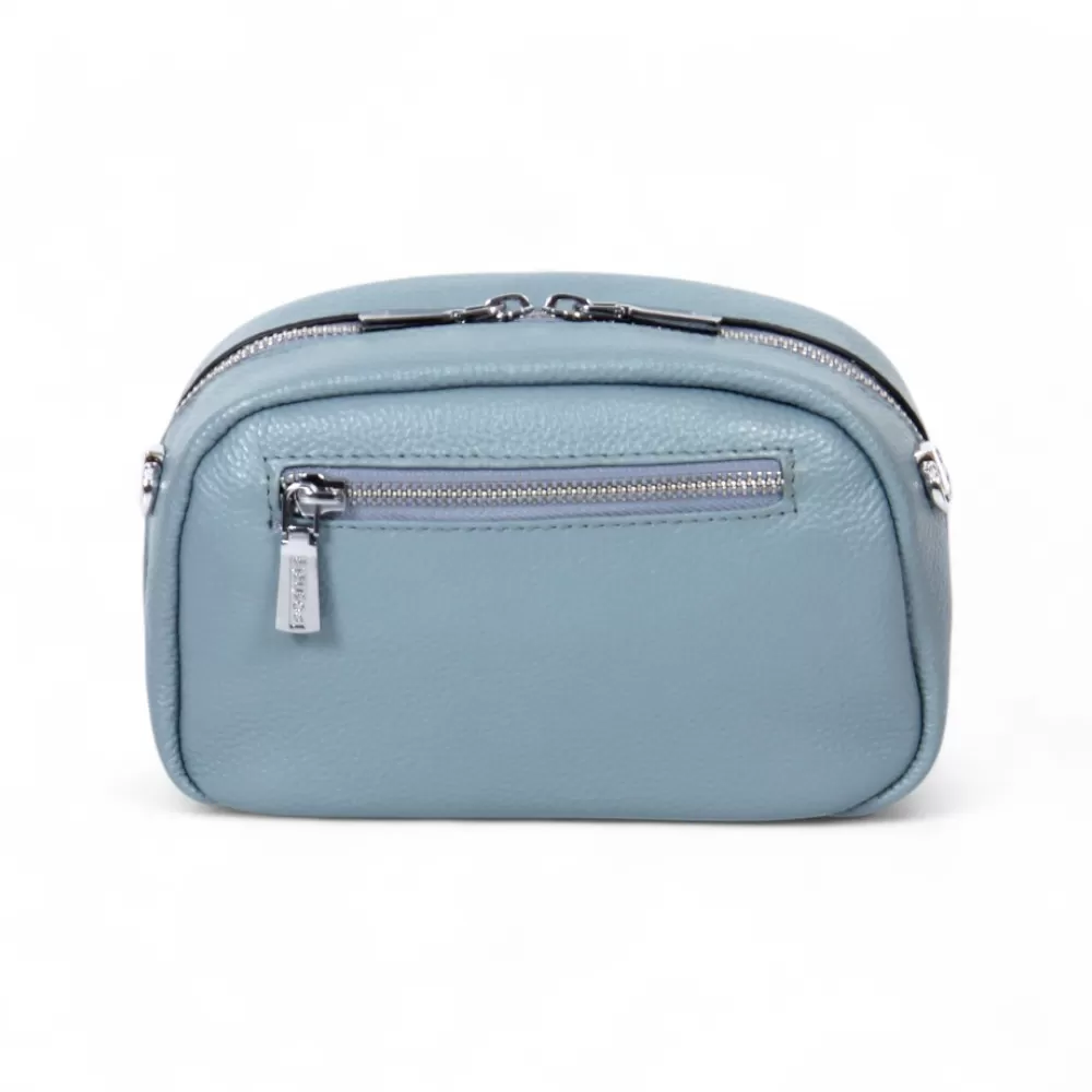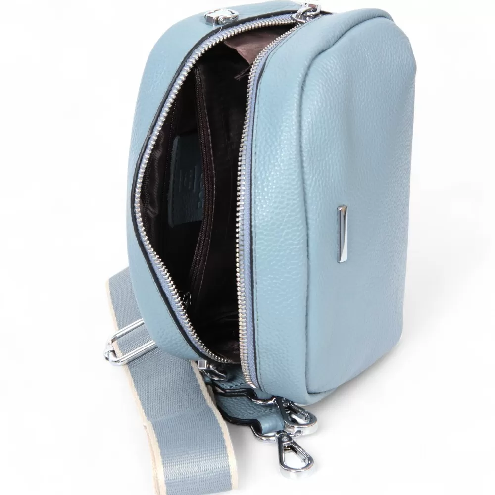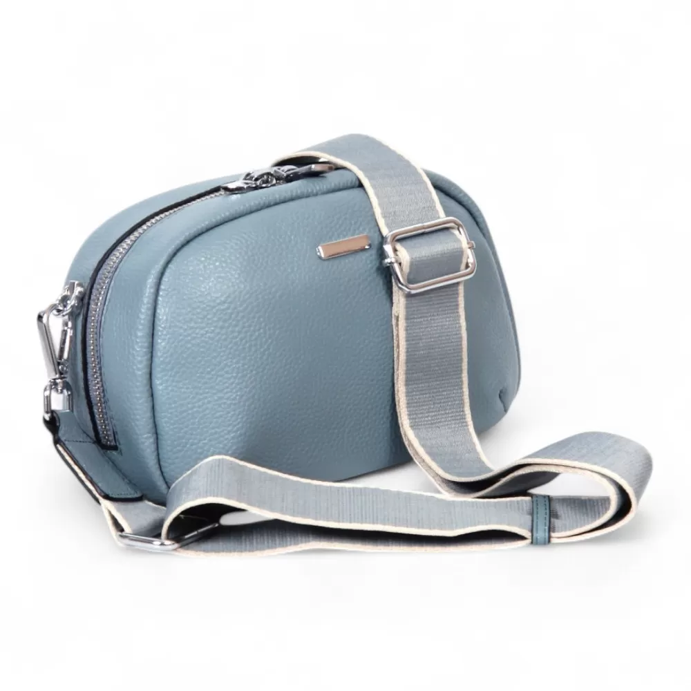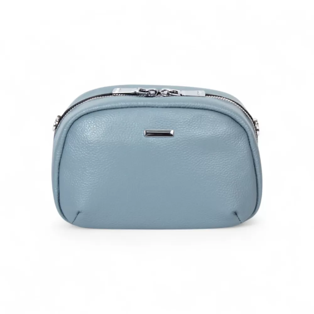Сумка кросс-боди от бренда Poshete из натуральной кожи в голубом цвете. Модель оснащена широким съемным плечевым ремнем с регулировкой. Ремень сделан из текстиля. Есть отделение на молнии. Внутри – текстильная подкладка и накладной карман. На задней стороне расположен карман на молнии.