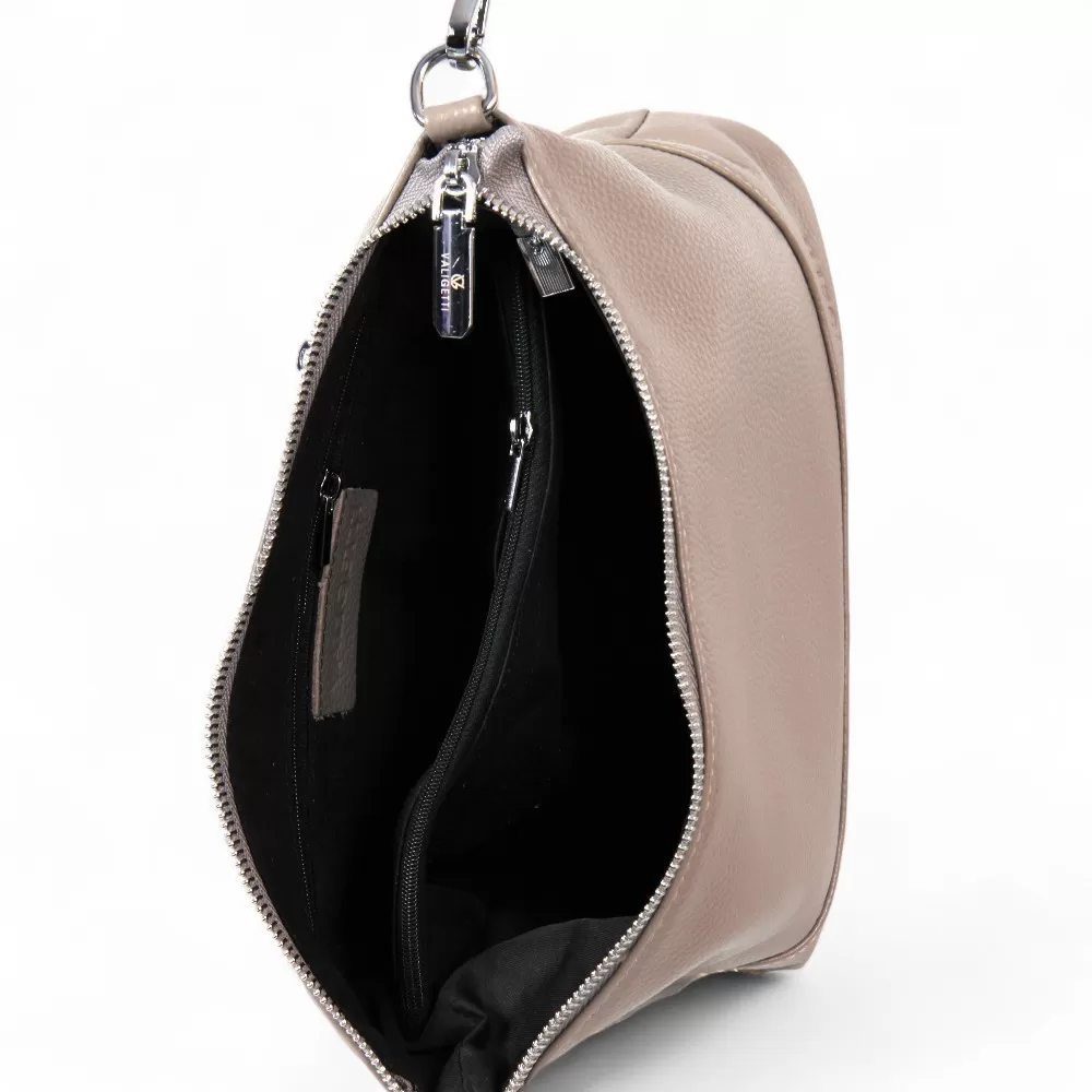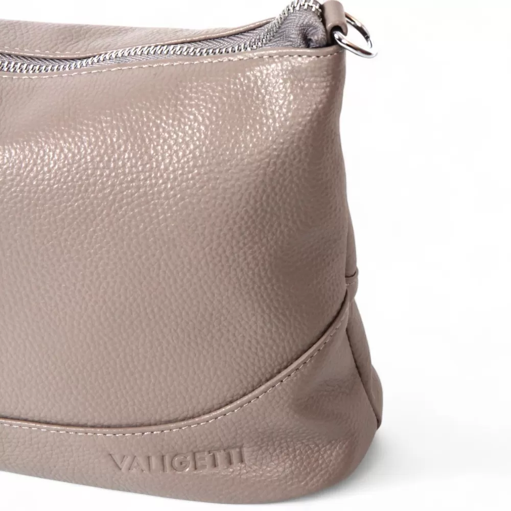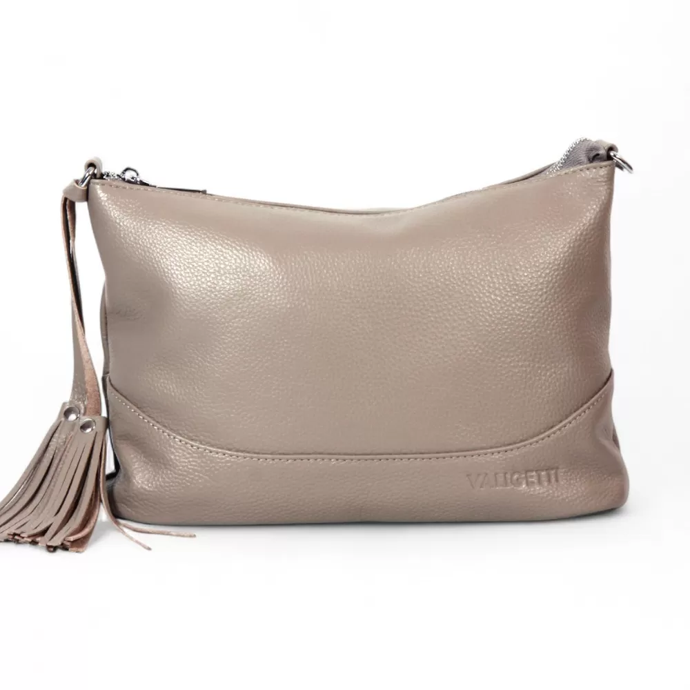 Сумка от бренда Valigetti выполнена из натуральной кожи в бежевом цвете. Модель со съемным регулируемым плечевым ремнем и съемной ручкой, на задней стороне расположен горизонтальный карман быстрого доступа на молнии. Сумочка имеет одно основное отделение на молнии, внутри: текстильная фирменная подкладка, карман на молнии, накладной открытый карман и средний карман на молнии.