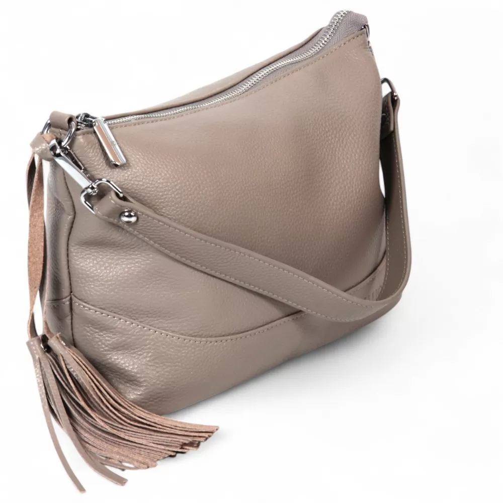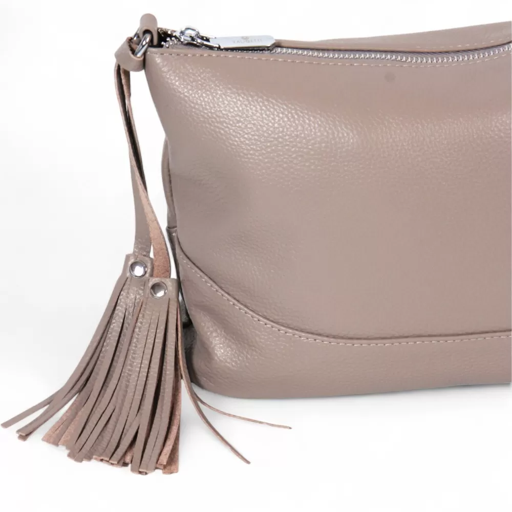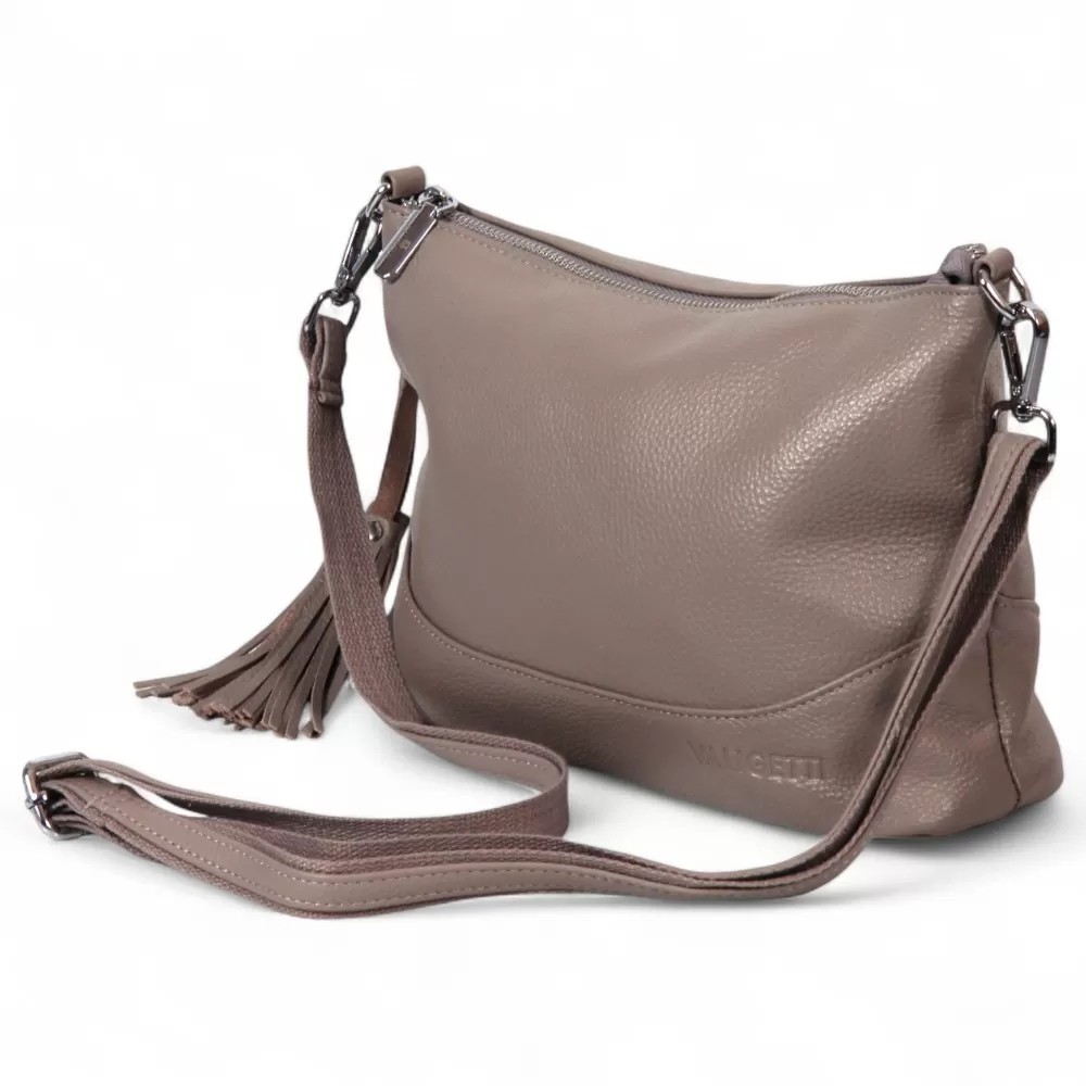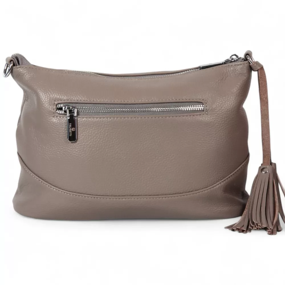 Сумка от бренда Valigetti выполнена из натуральной кожи в бежевом цвете. Модель со съемным регулируемым плечевым ремнем и съемной ручкой, на задней стороне расположен горизонтальный карман быстрого доступа на молнии. Сумочка имеет одно основное отделение на молнии, внутри: текстильная фирменная подкладка, карман на молнии, накладной открытый карман и средний карман на молнии.