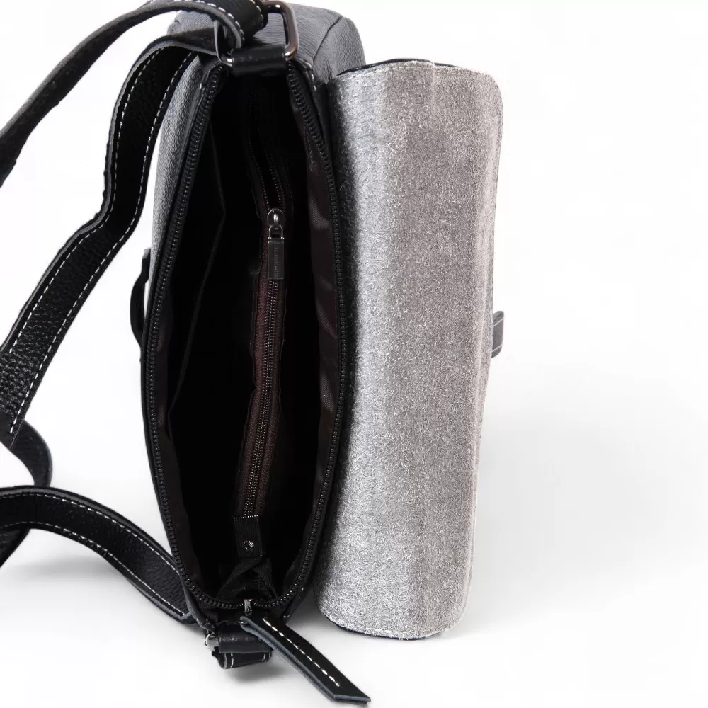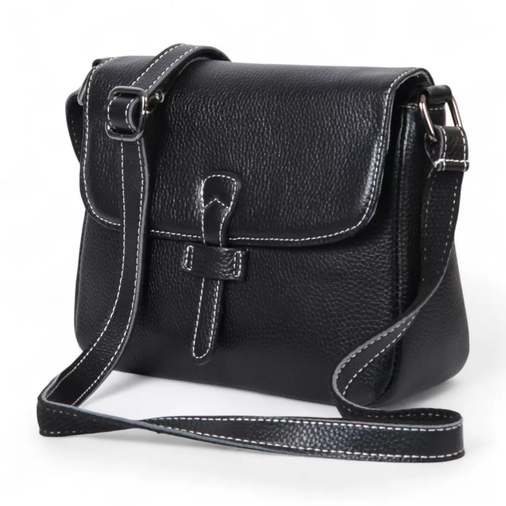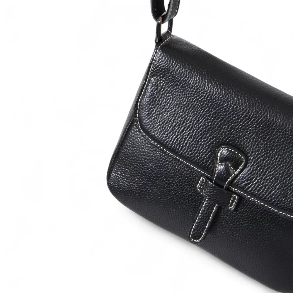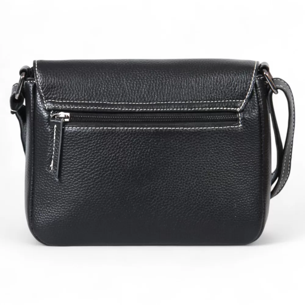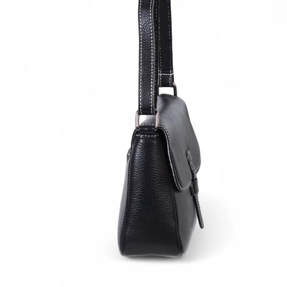 Сумка от бренда Letizia Forzza из натуральной кожи выполнена в черном цвете. Эта модель оснащена несъемным регулируемым плечевым ремнем. На задней стороне сумки есть карман быстрого доступа на молнии. Основное отделение закрывается клапаном, который дополнительно фиксируется молнией. Внутри сумки: текстильная подкладка, средний карман на молнии, накладной боковой карман и боковой карман на молнии.