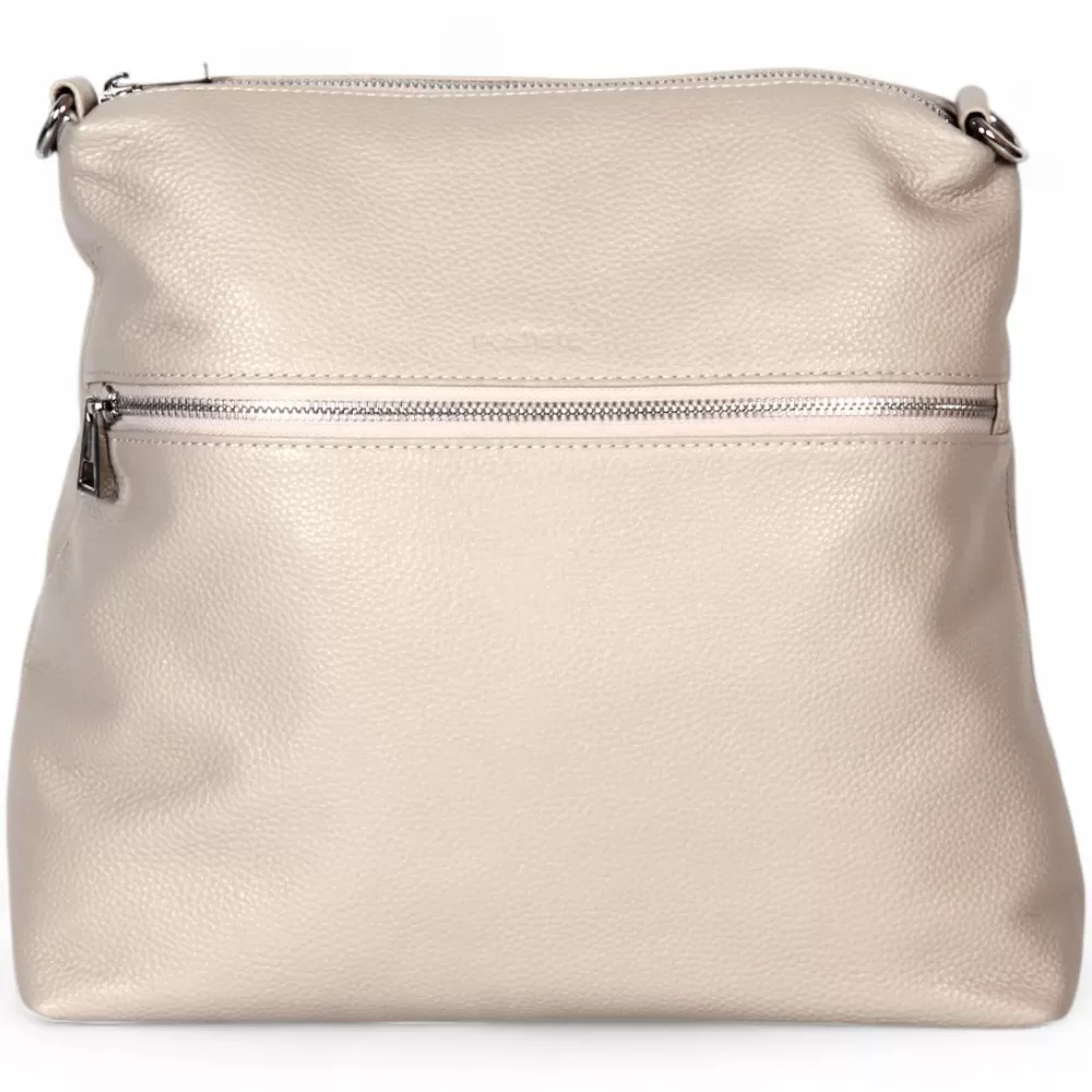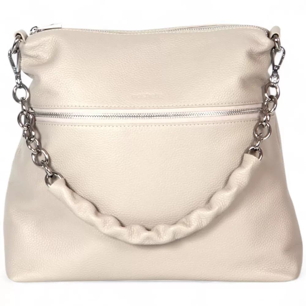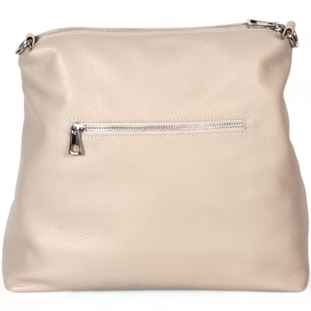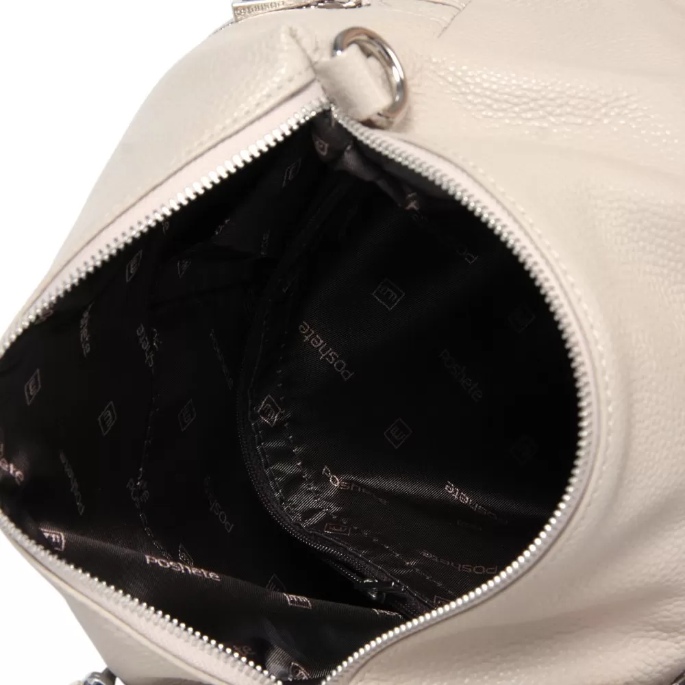 Сумка от бренда Poshete выполнена из натуральной кожи в бежевом цвете. Модель с удобной съемной ручкой. Отделение закрывается на молнию. Внутри – фирменная подкладка, средний карман и карман на молнии. Два накладных кармана добавляют функциональности. На лицевой и задней частях также есть карманы на молнии. Овальное дно с металлическими ножками защищает от износа.