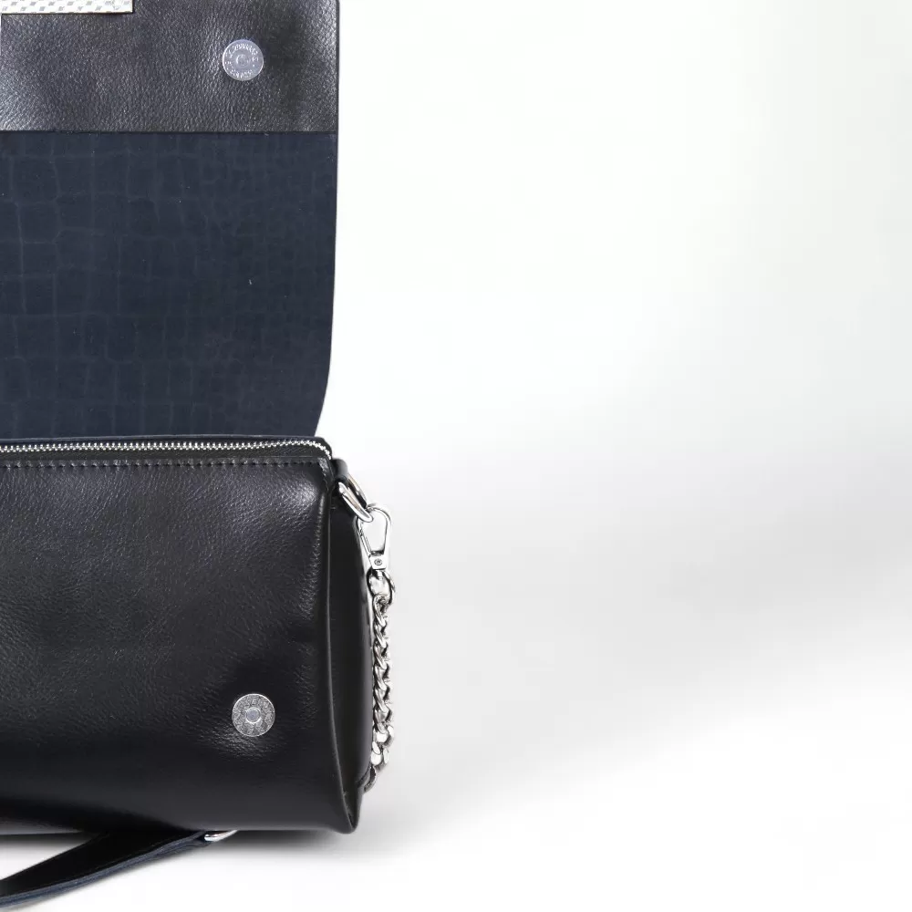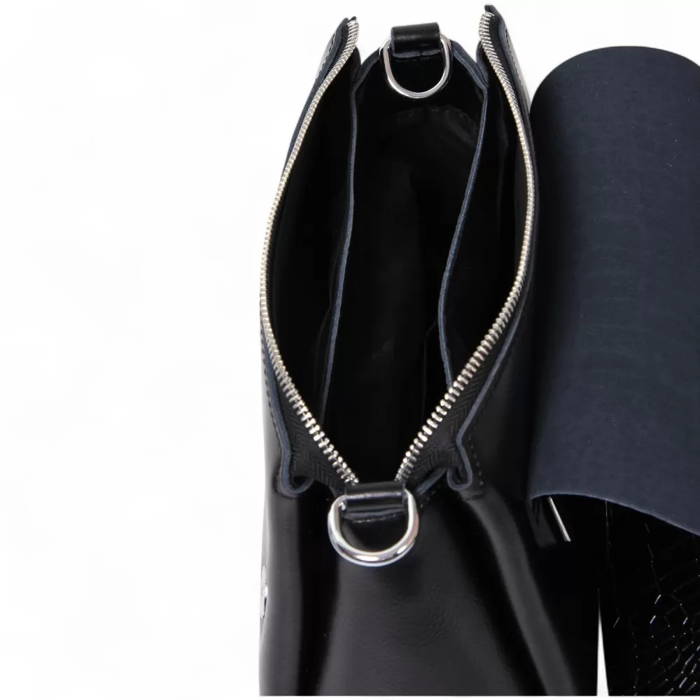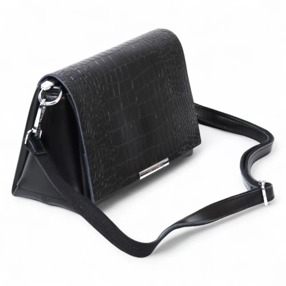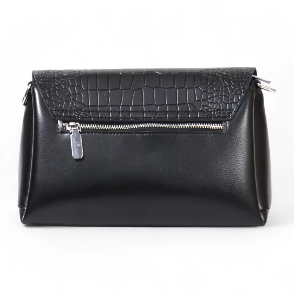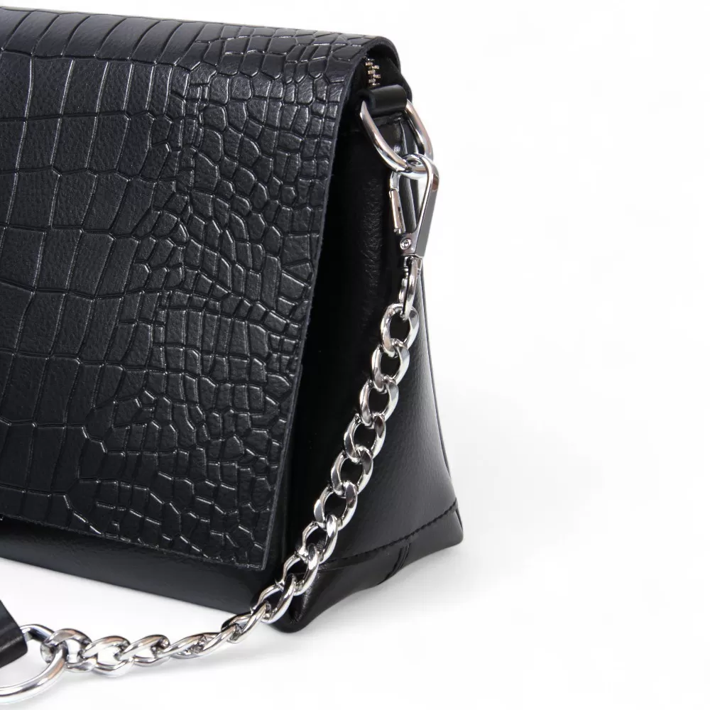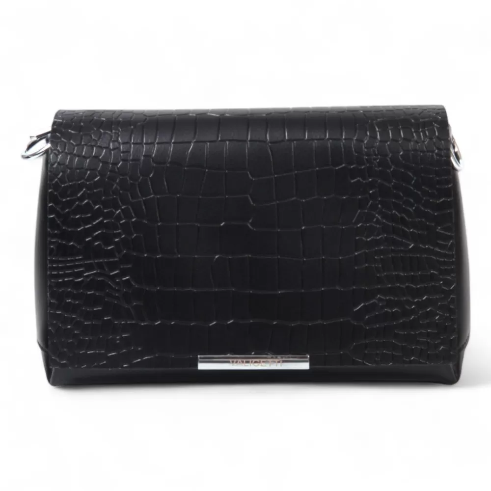 Сумка от бренда Valigetti из натуральной кожи черного цвета с тиснением под крокодила на клапане. Модель со съемным регулируемым плечевым ремнем и ручкой на цепочке, на задней стороне расположен горизонтальный карман на молнии быстрого доступа, основное отделение под клапаном на молнии, внутри которого текстильная фирменная подкладка, три отделения, боковой карман на молнии и два накладных открытых кармана.