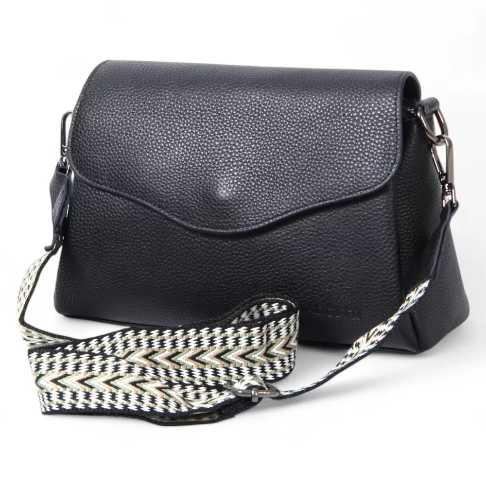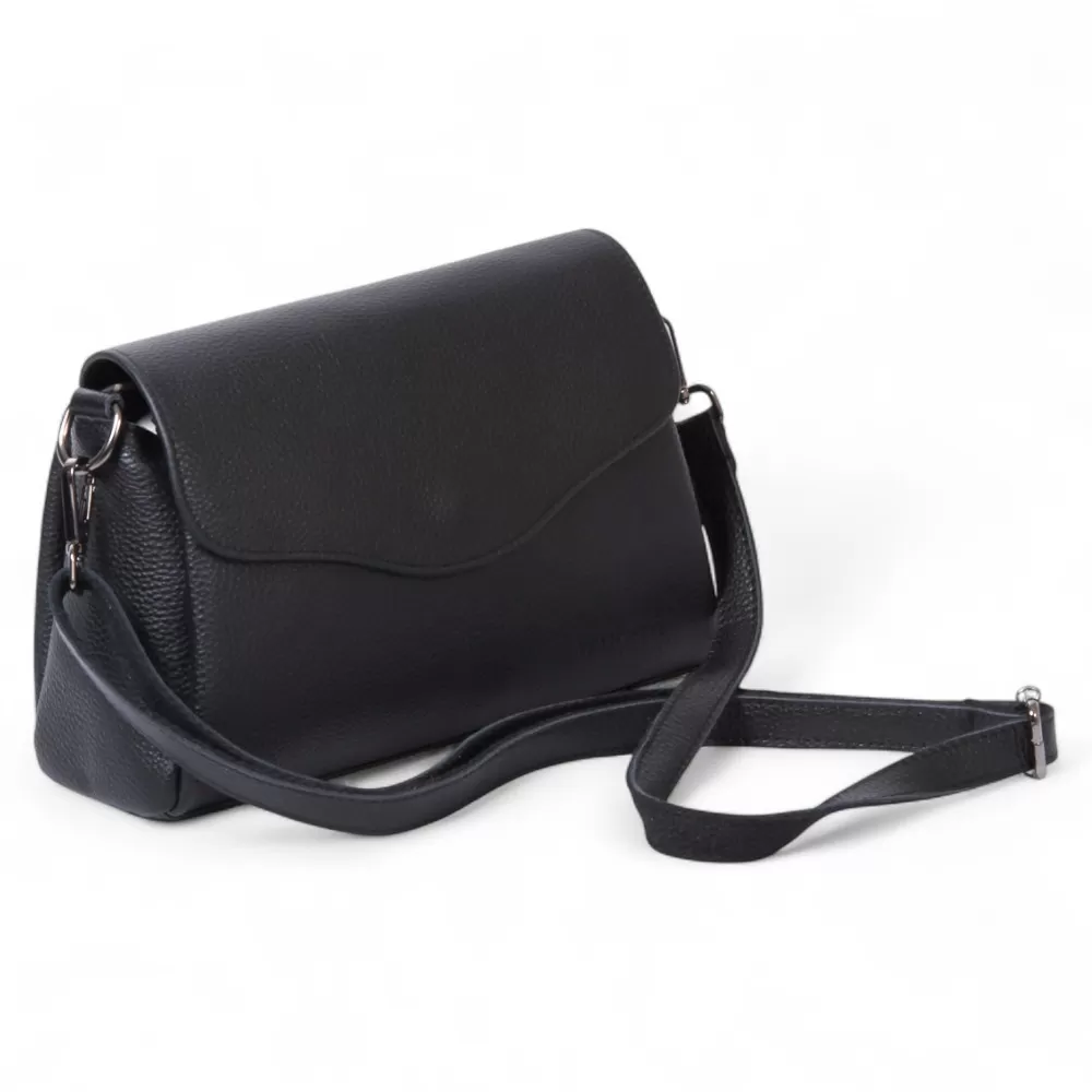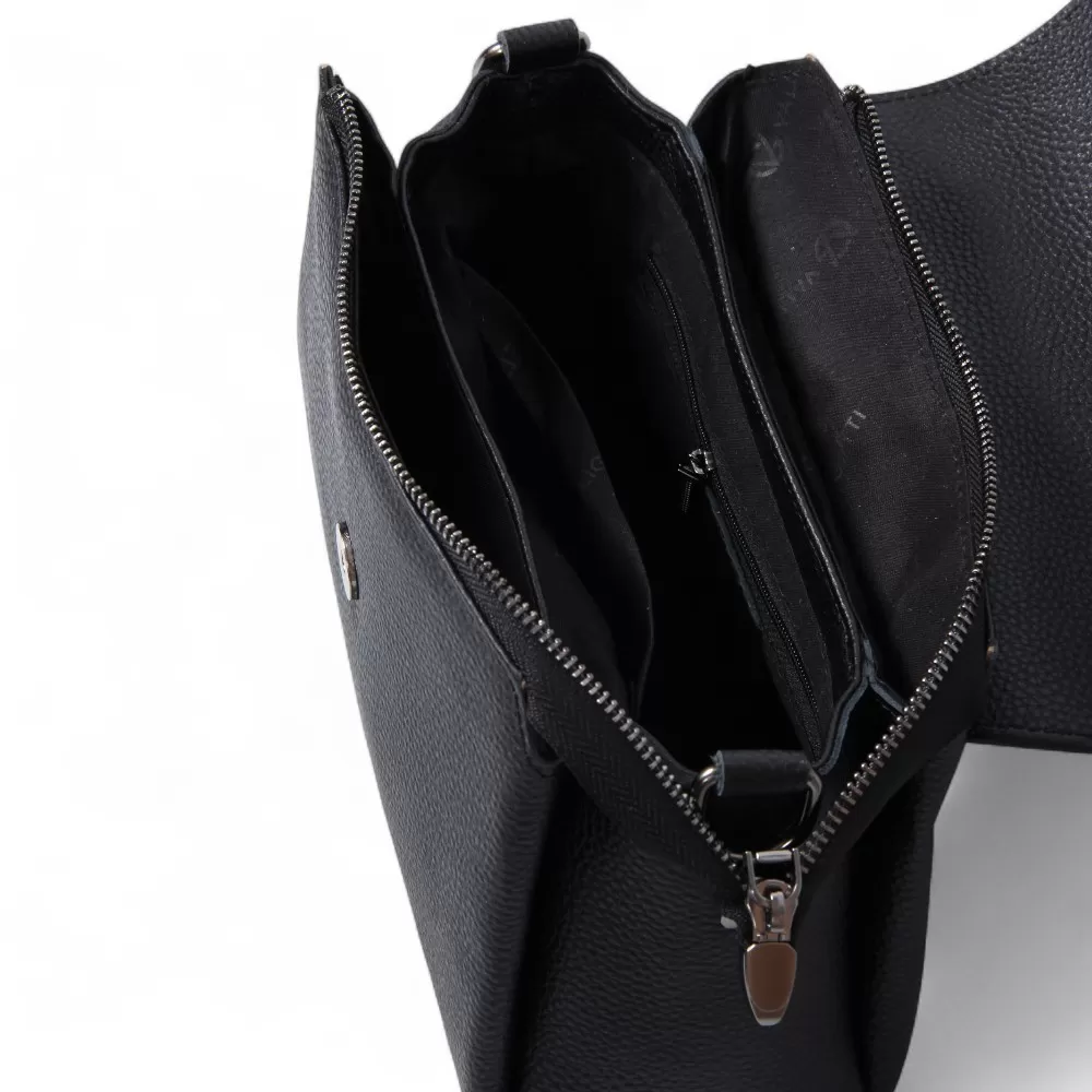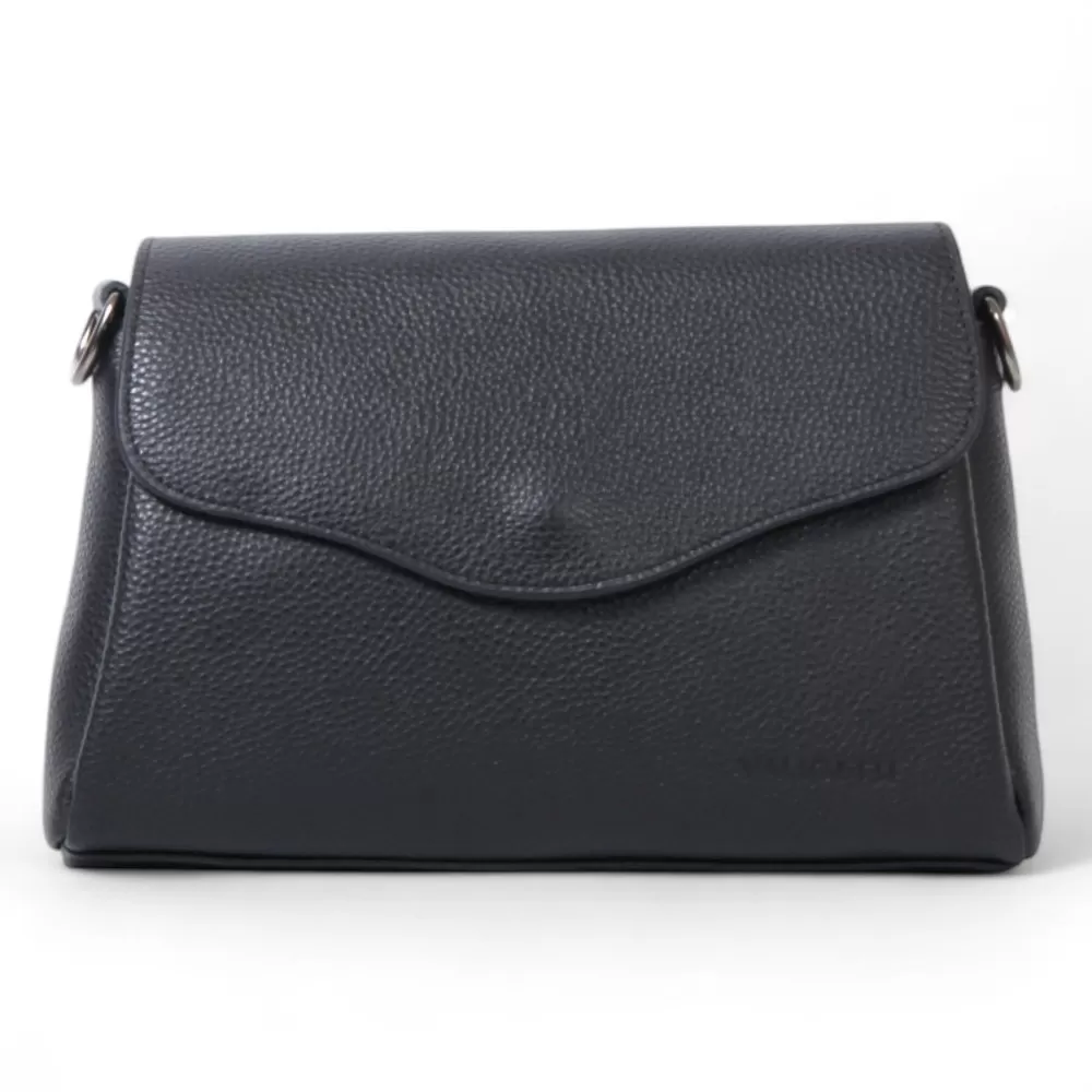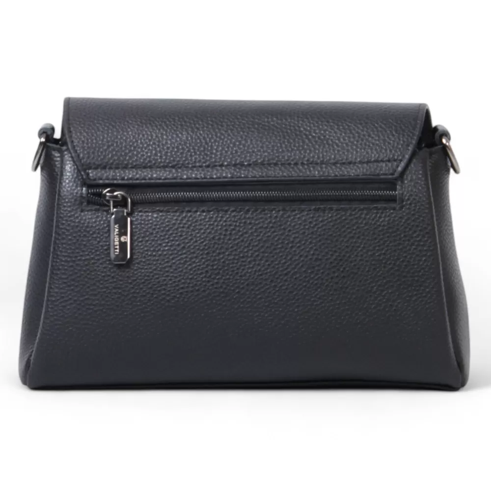 Сумка от бренда Valigetti выполнена из натуральной кожи в черном цвете. Модель с двумя съемными регулируемыми плечевыми ремнями текстильный и натуральной кожи, на задней стороне расположен карман горизонтальный карман быстрого доступа на молнии, три отделения под клапаном на молнии внутри: текстильная фирменная подкладка, накладной карман на молнии и накладной открытый карман.