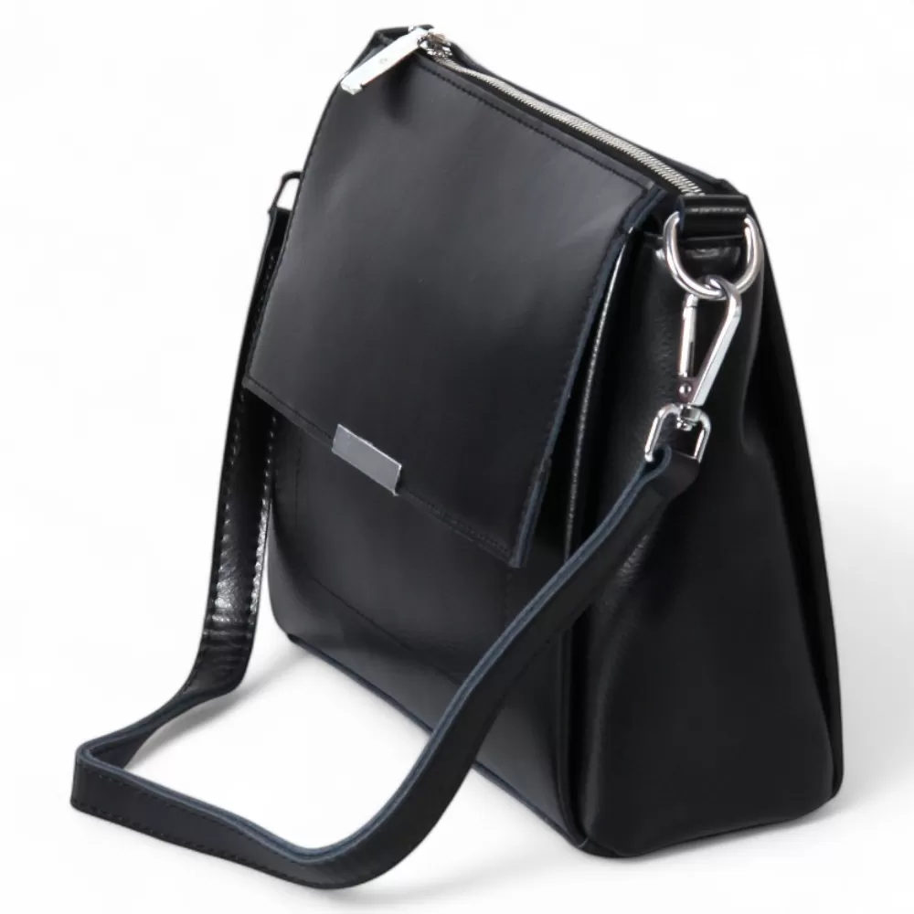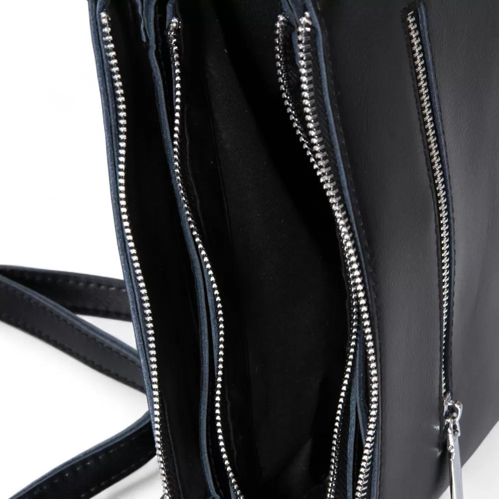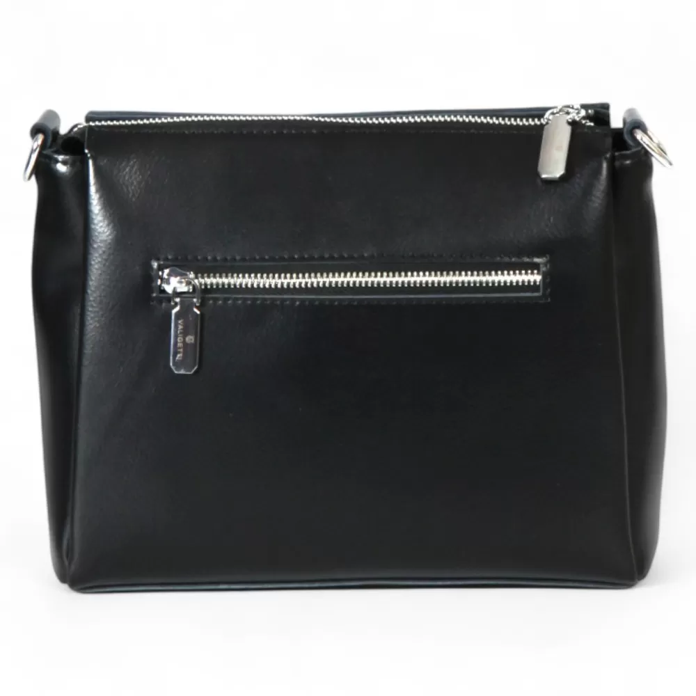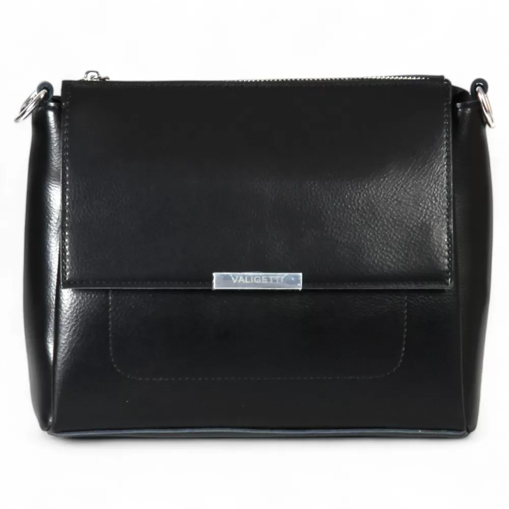 Сумка от бренда Valigetti из натуральной кожи черного цвета. Модель со съемной ручкой и съемным регулируемым плечевым ремнем. Отделение на молнии. Внутри: три отсека, средний — на молнии, фирменная подкладка, карман на молнии, накладной карман. На задней стороне — карман на молнии.