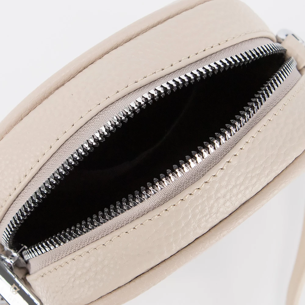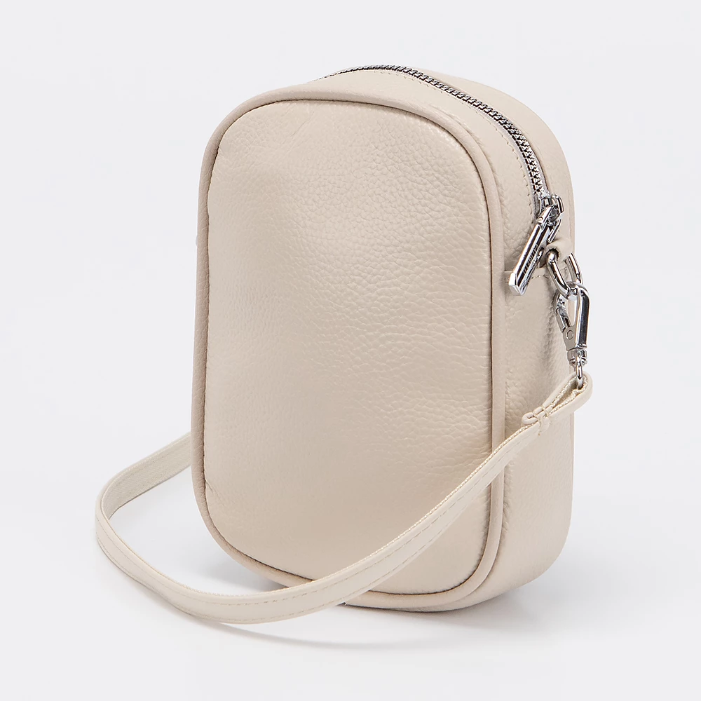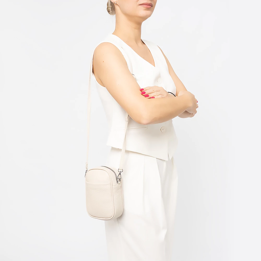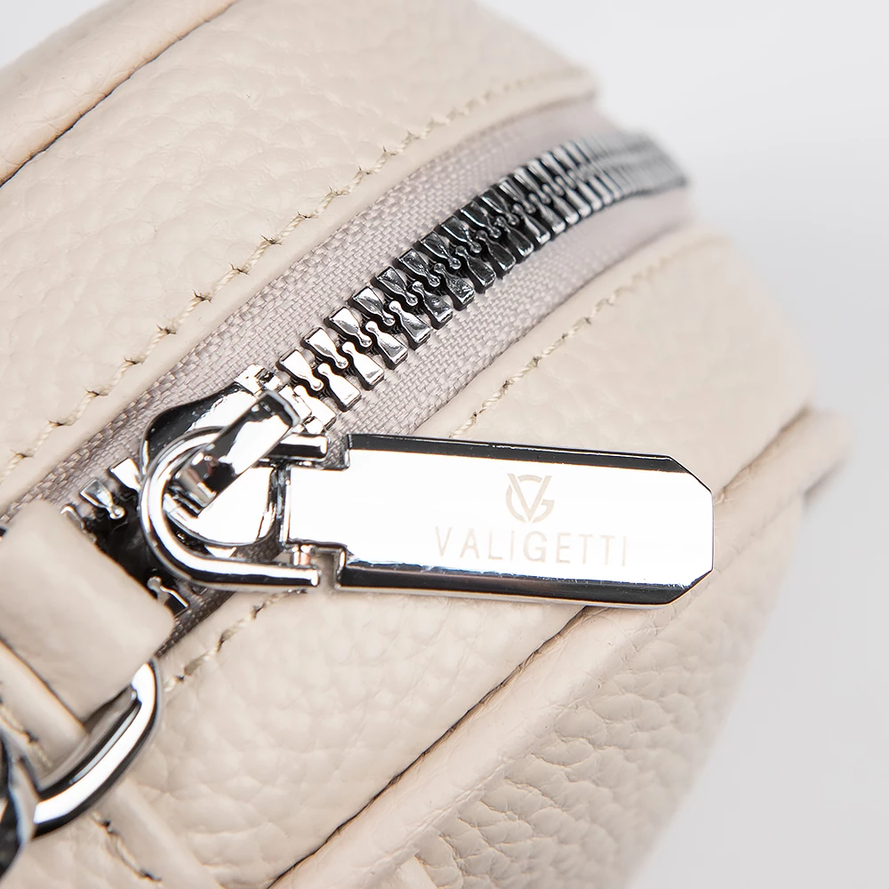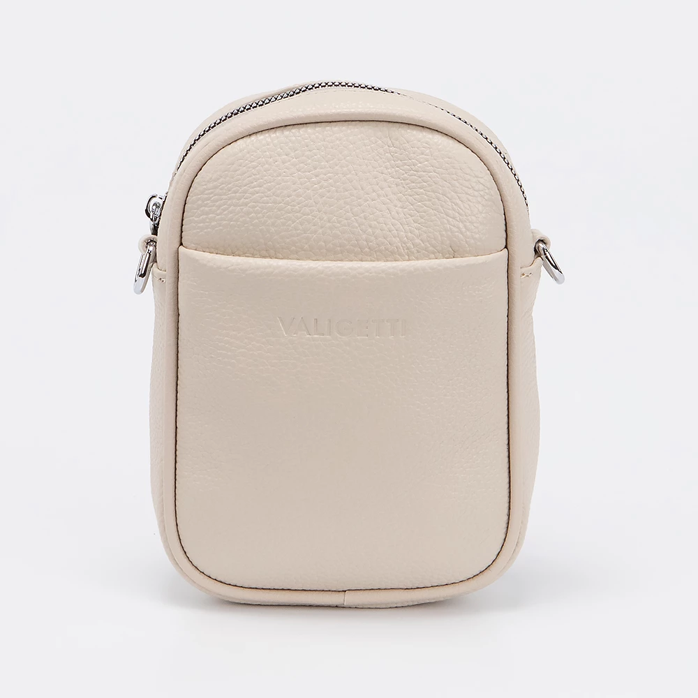Сумка от бренда Valigetti из натуральной кожи бежевого цвета. Компактная небольшая модель вертикальной ориентации со съемным регулируемым плечевым ремнем. Отделение на молнии. Внутри: карман на молнии, накладной карман. На лицевой стороне — накладной карман без застежки.