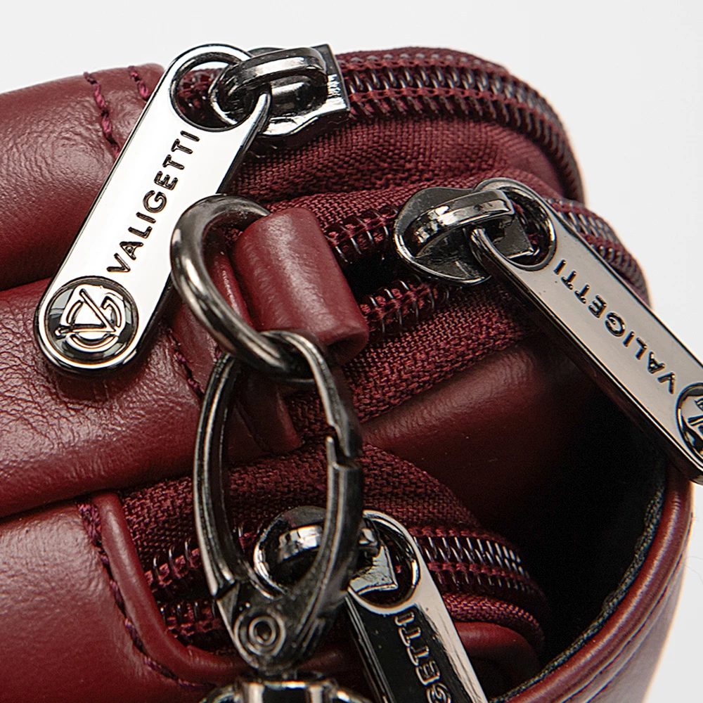 Сумка от бренда Valigetti из натуральной кожи винно-бордового цвета. Компактная модель со съемным регулируемым плечевым ремнем; сзади имеется шлевка для крепления на ремень. Два отделения на молнии, с фирменной подкладкой и карманами. На лицевой стороне – карман на молнии с клапаном на скрытом магните. На задней стороне – карман на молнии.