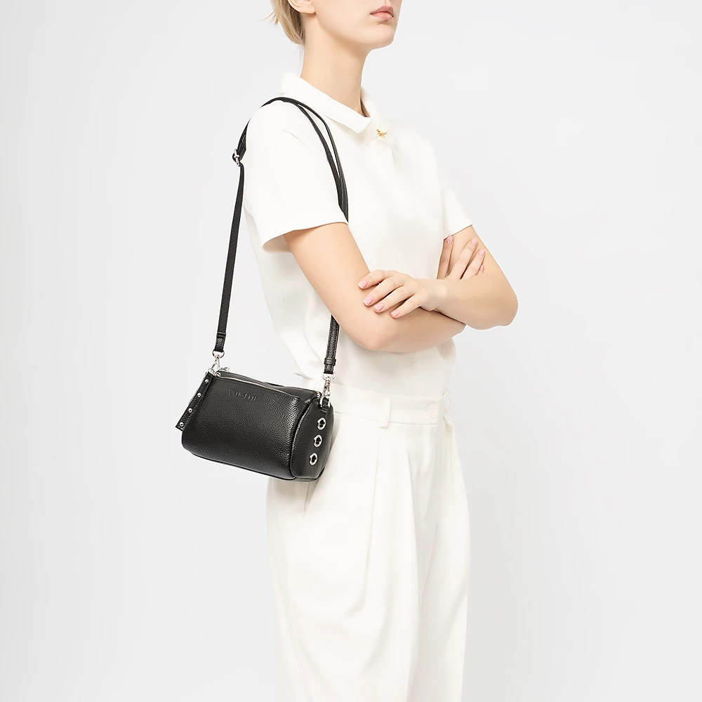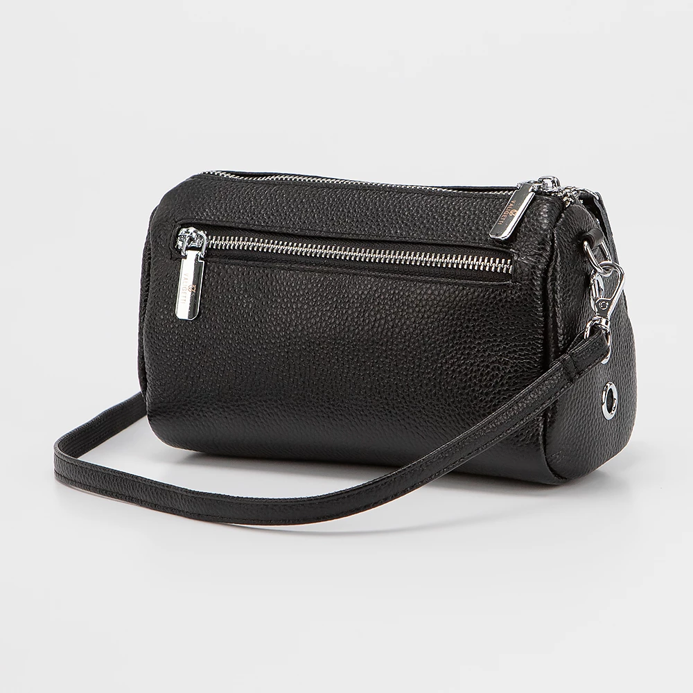 Сумка кросс-боди от бренда Valigetti из натуральной зернистой кожи черного цвета. Компактная модель со съемным регулируемым плечевым ремнем. Отделение на молнии. Внутри: фирменная подкладка, карман на молнии, накладной карман. На лицевой стороне — карман на молнии с оригинальным пуллером с заклепками. На задней стороне — карман на молнии. По бокам — декоративные люверсы.
