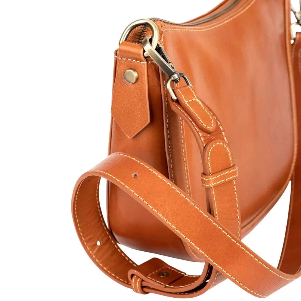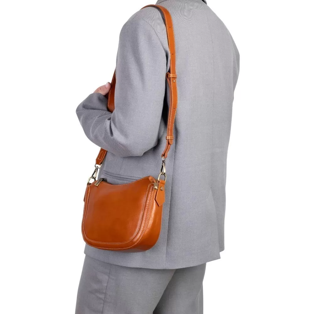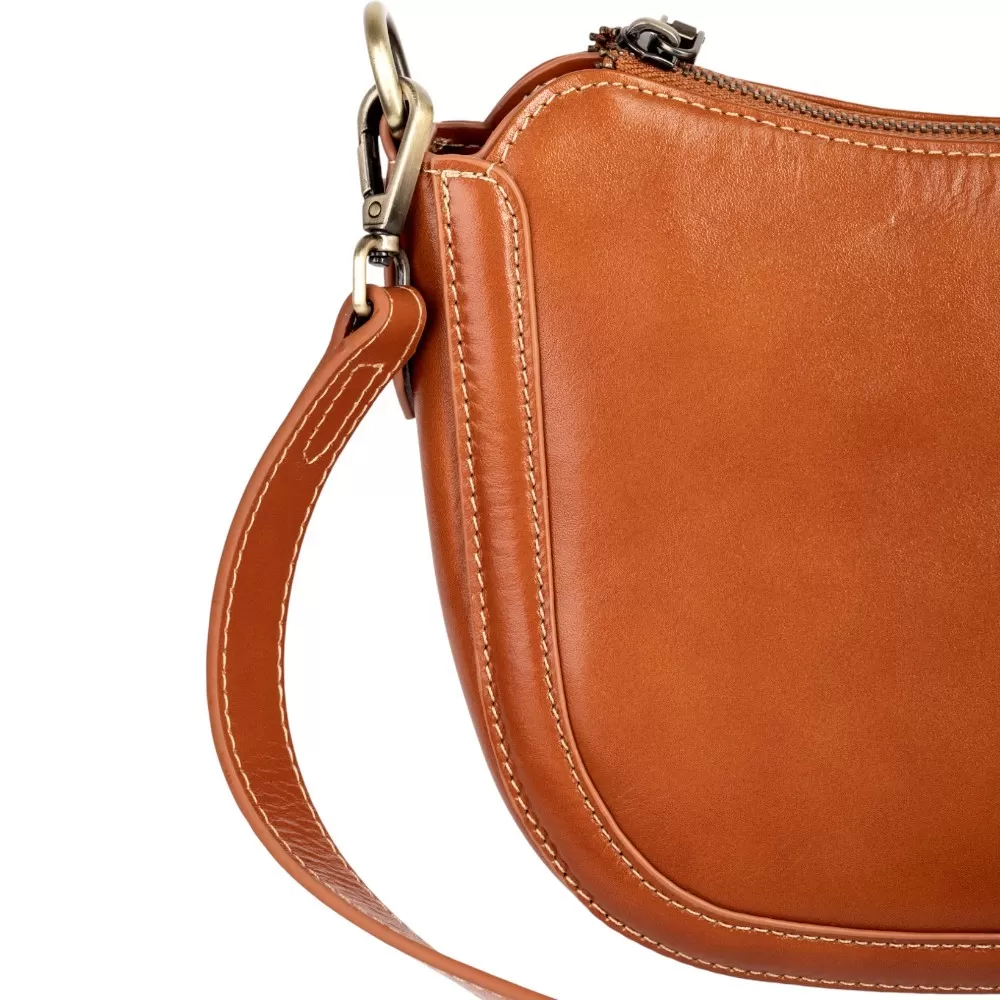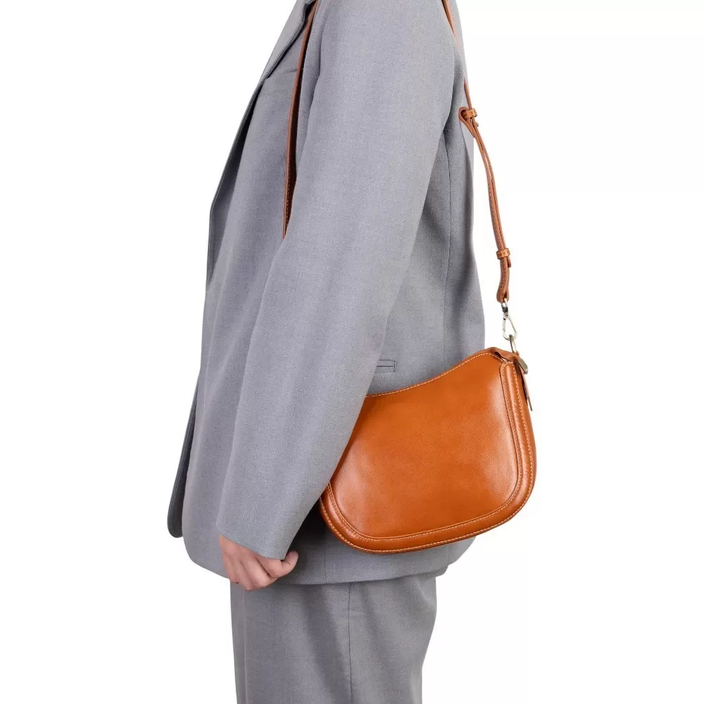 Сумка от бренда Poshete выполнена из натуральной кожи цвета dark camel. Модель оснащена съемным регулируемым плечевым ремнем. Имеется отделение на молнии. Внутри — текстильная подкладка и карман на молнии.
