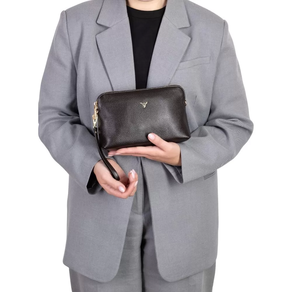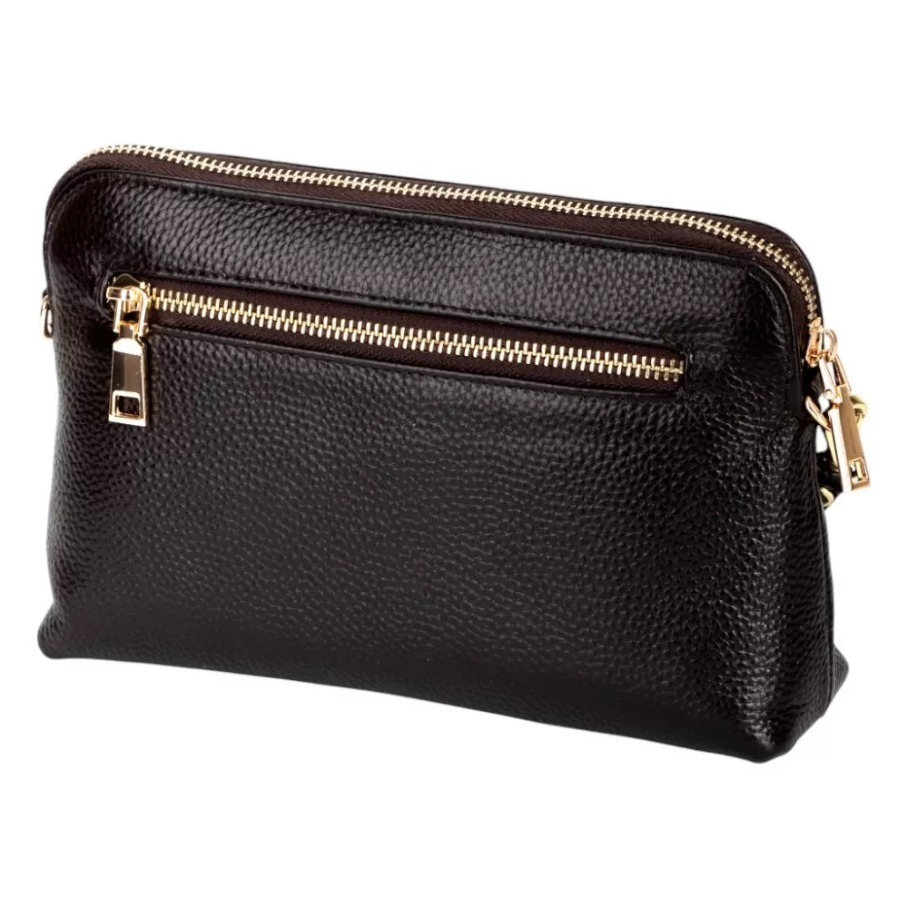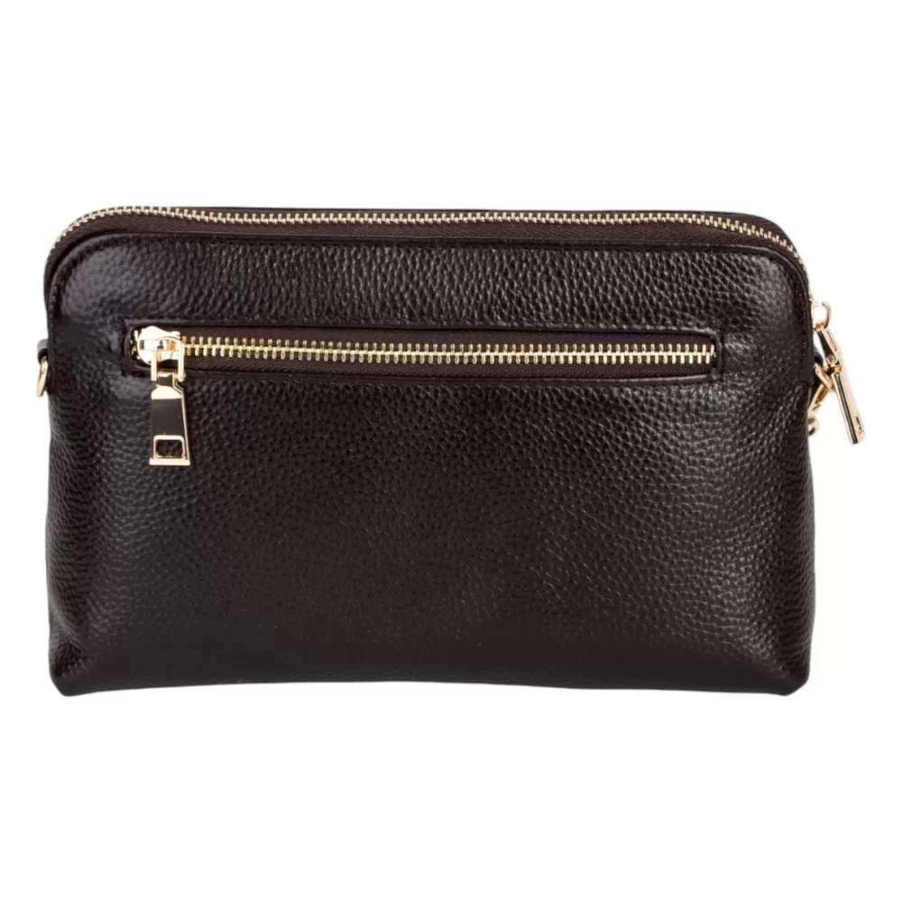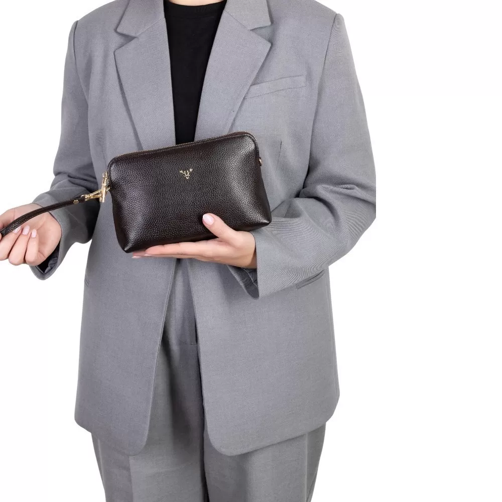 Сумка от бренда Poshete из натуральной кожи коричневого цвета. Лицевая сторона с оригинальным декором. Компактная модель со съемным регулируемым плечевым ремнем и ремешком для запястья. Отделение на молнии. Внутри: фирменная подкладка, карман на молнии, накладной карман. На задней стороне – карман на молнии.