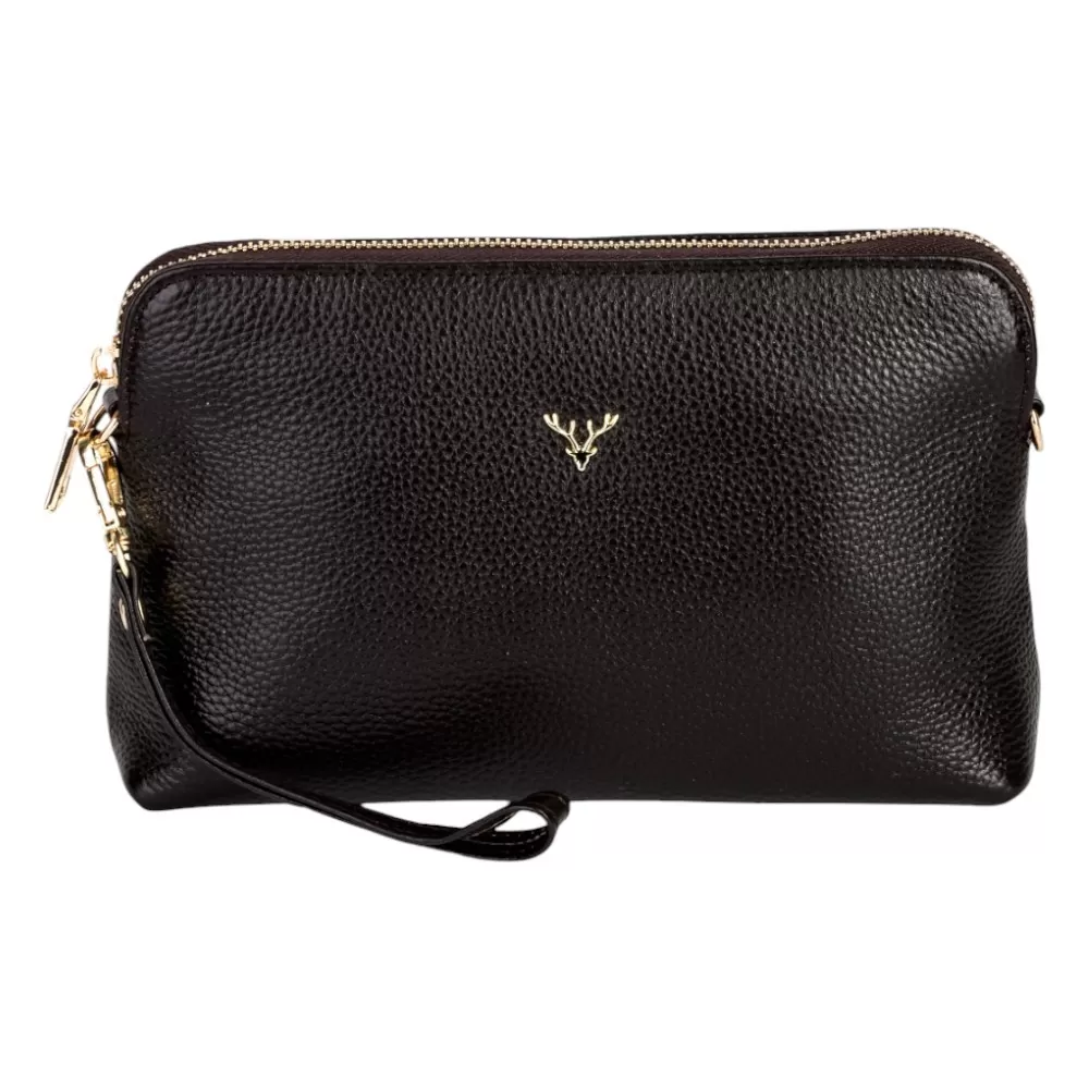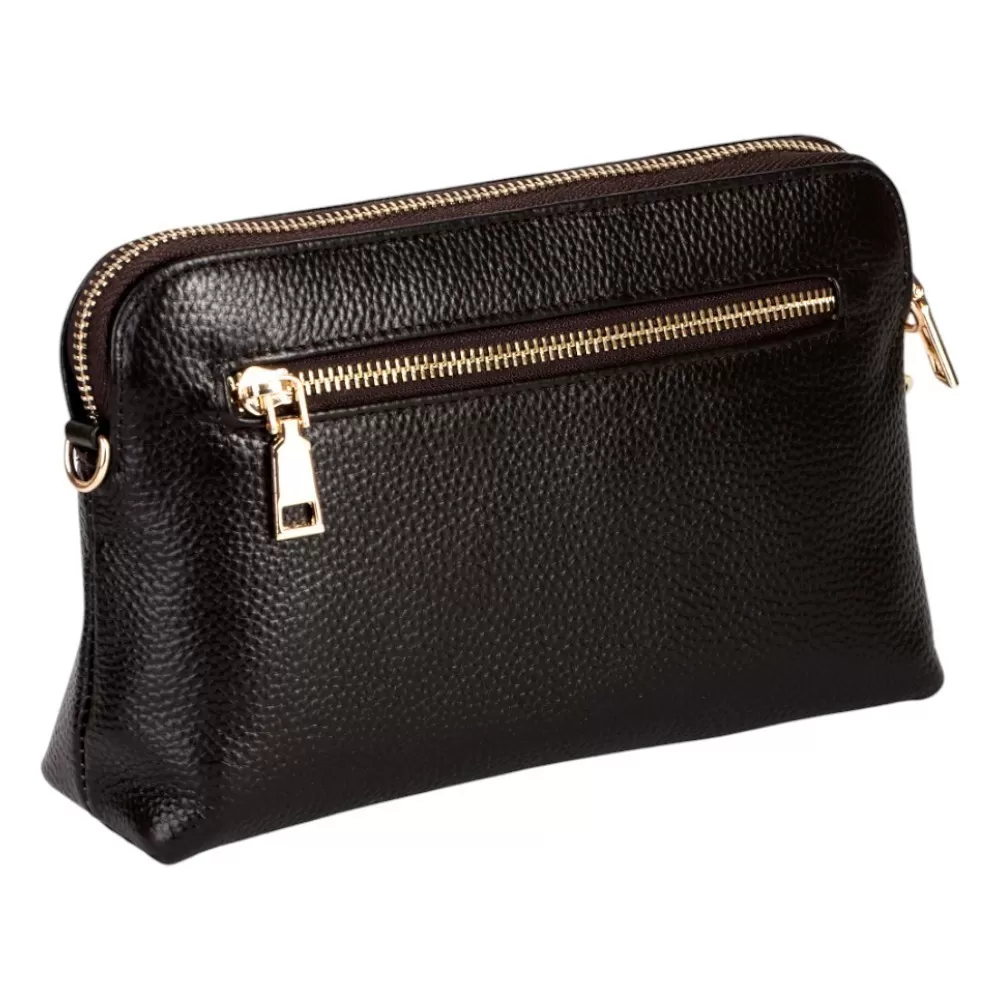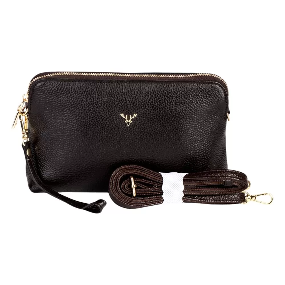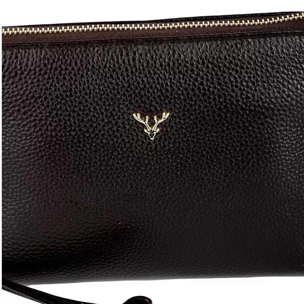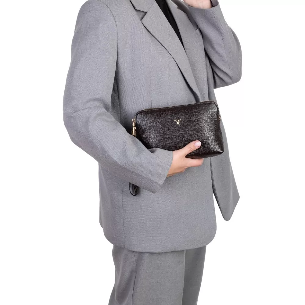 Сумка от бренда Poshete из натуральной кожи коричневого цвета. Лицевая сторона с оригинальным декором. Компактная модель со съемным регулируемым плечевым ремнем и ремешком для запястья. Отделение на молнии. Внутри: фирменная подкладка, карман на молнии, накладной карман. На задней стороне – карман на молнии.