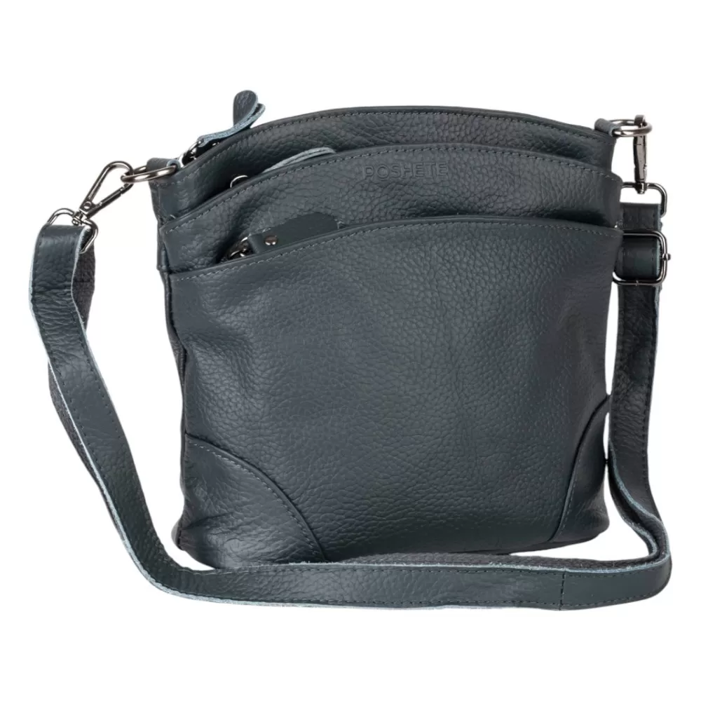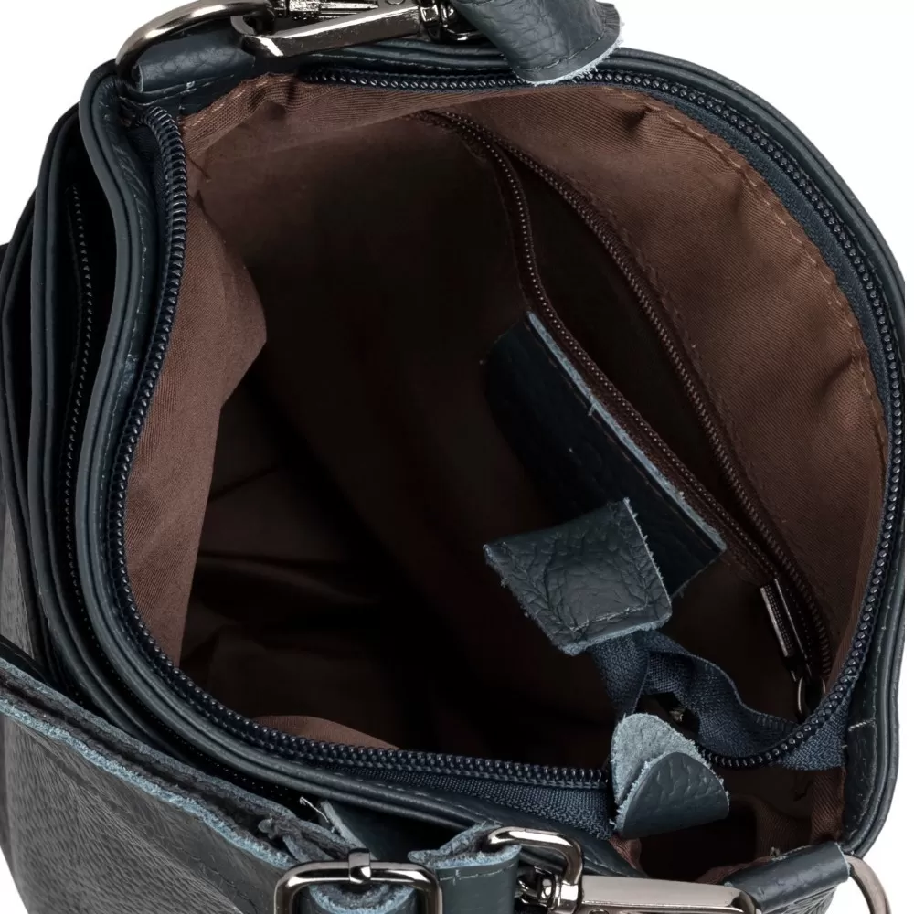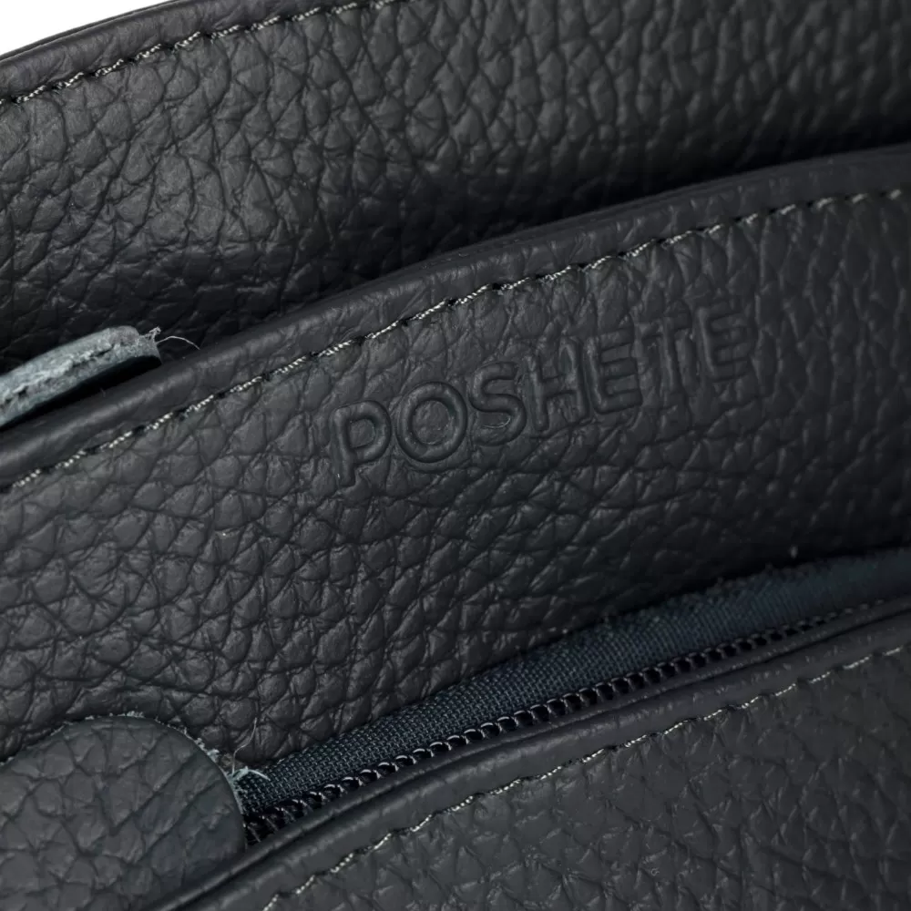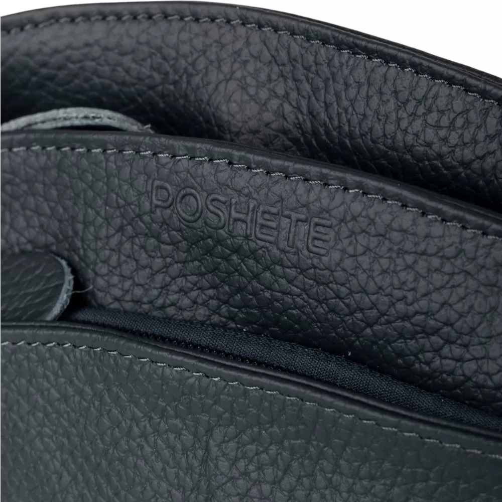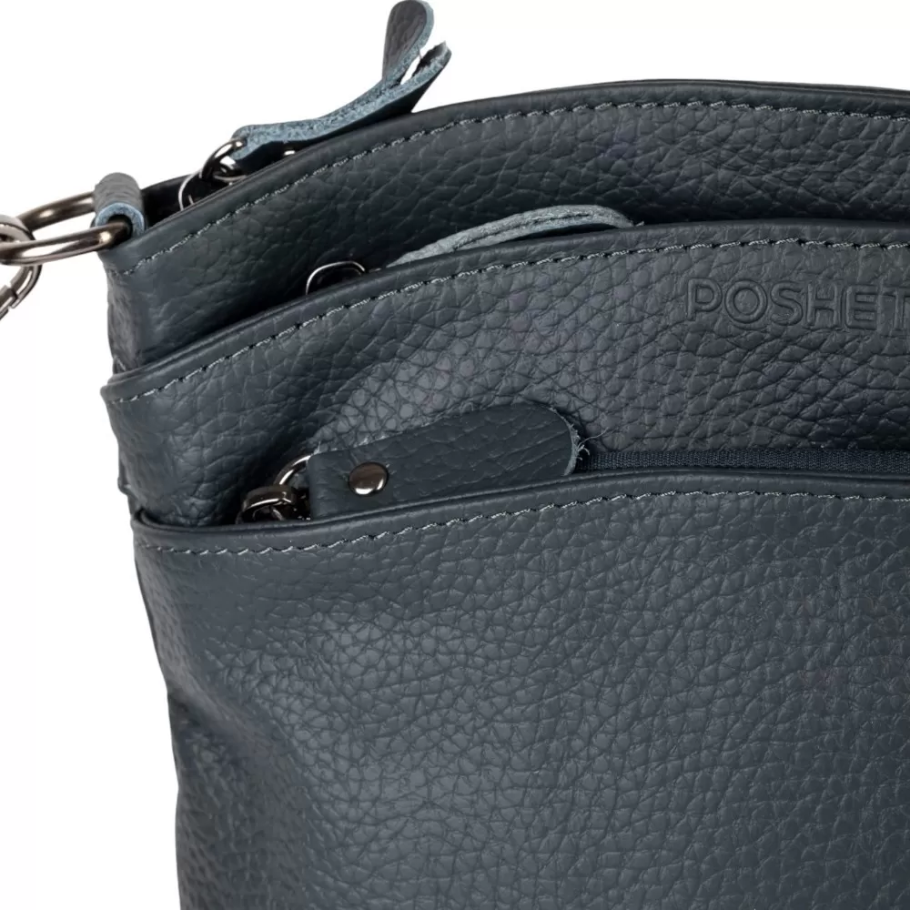 Сумка от бренда Poshete из натуральной кожи темно-синего цвета. Модель со съемным регулируемым плечевым ремнем. Отделение на молнии. Внутри: текстильная подкладка, карман на молнии. На лицевой стороне – два кармана на молнии. На задней стороне – карман на молнии.
