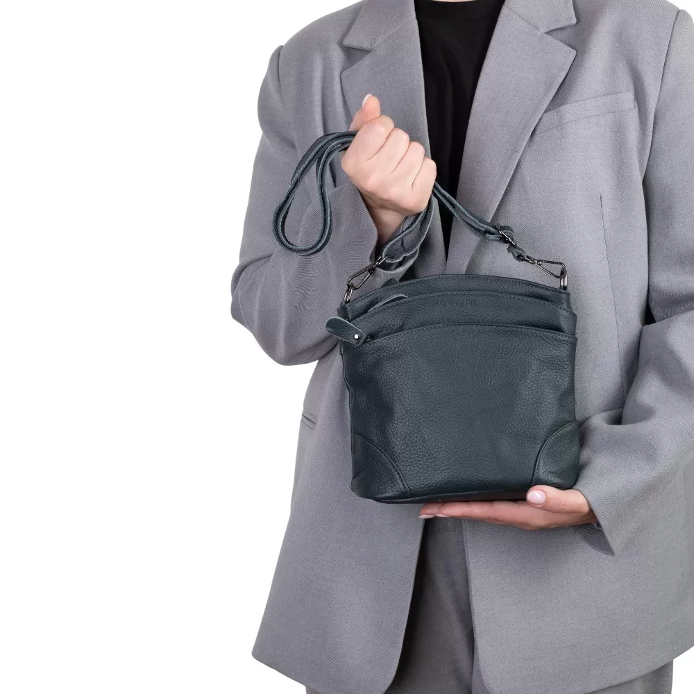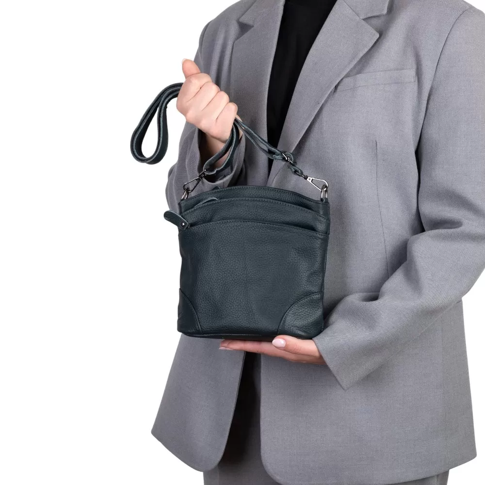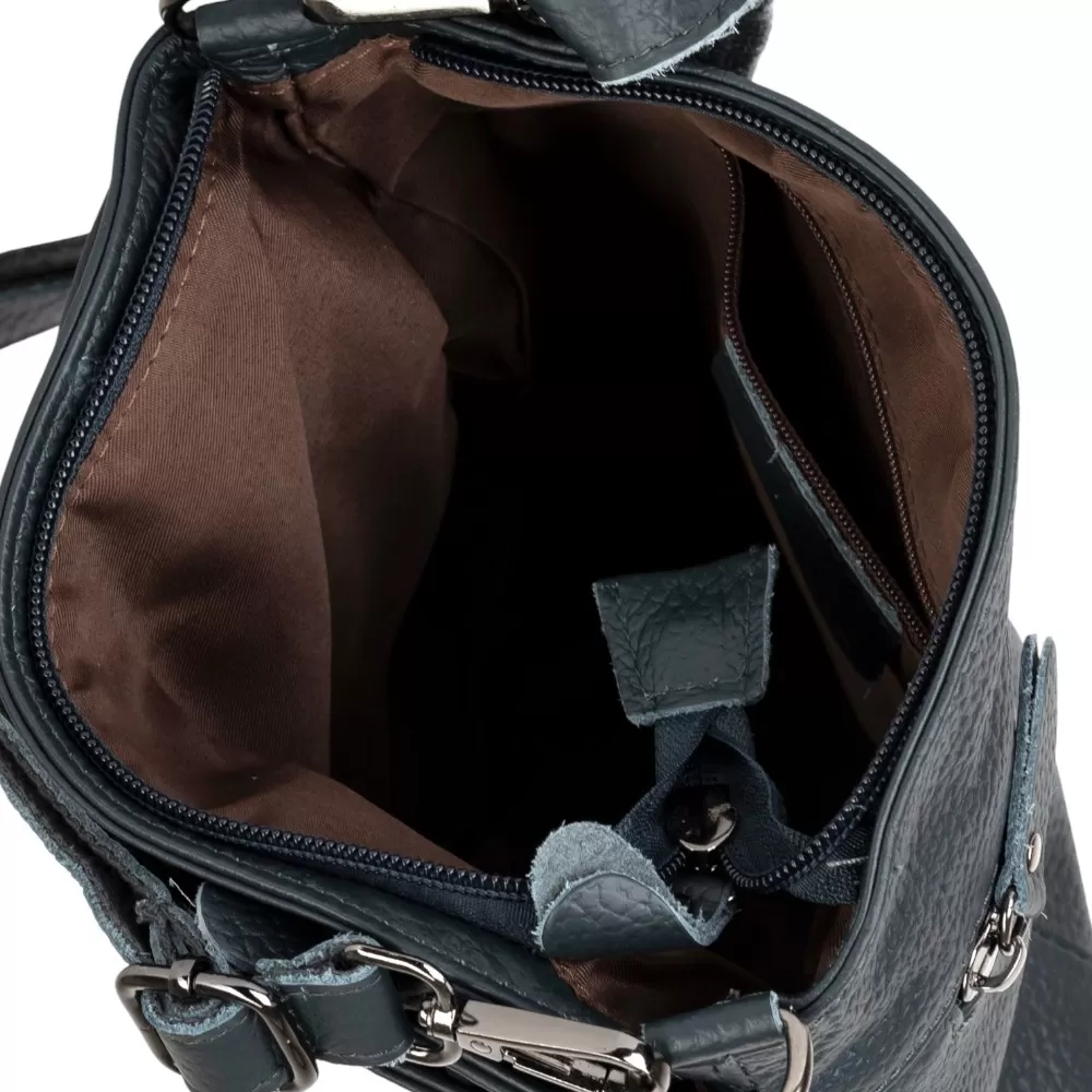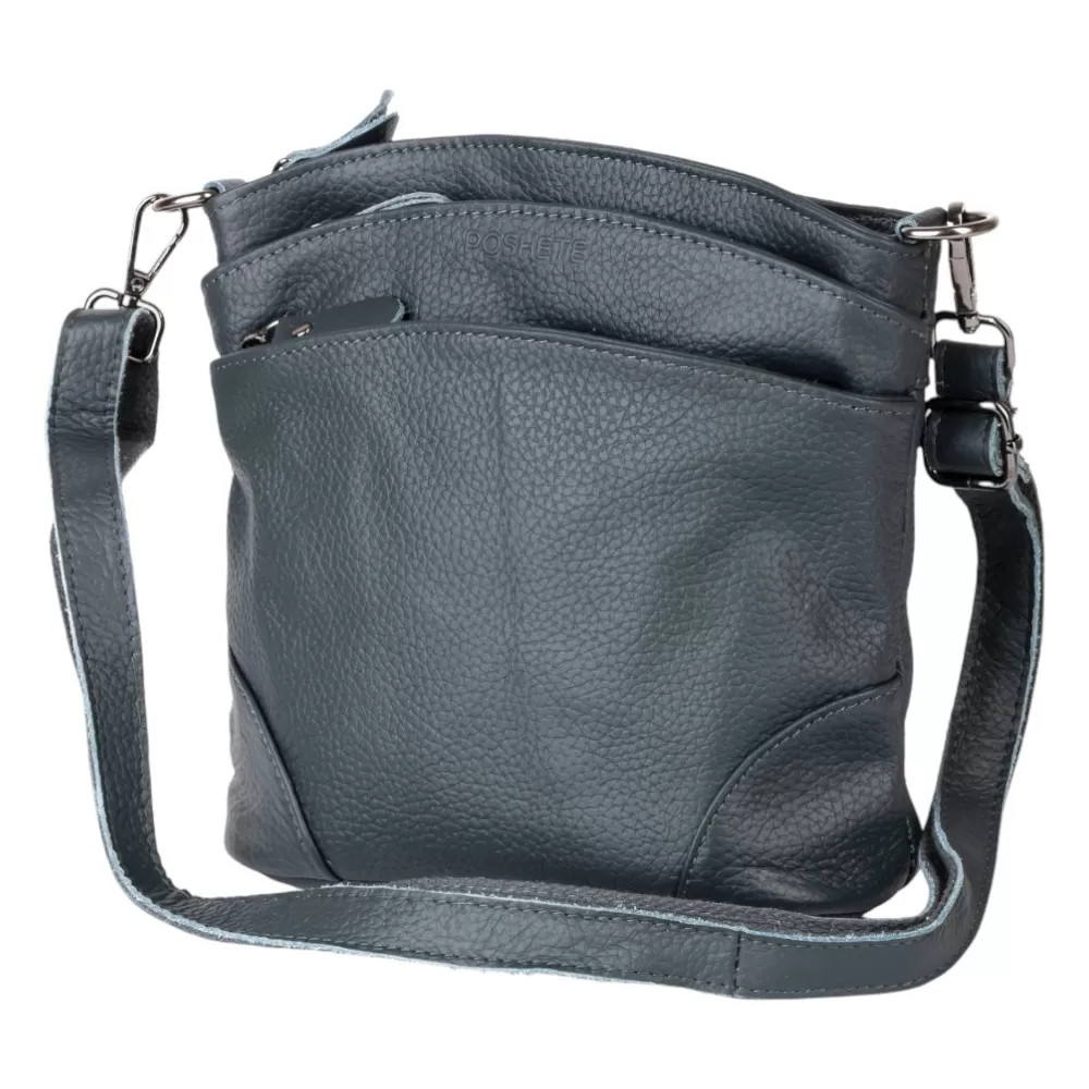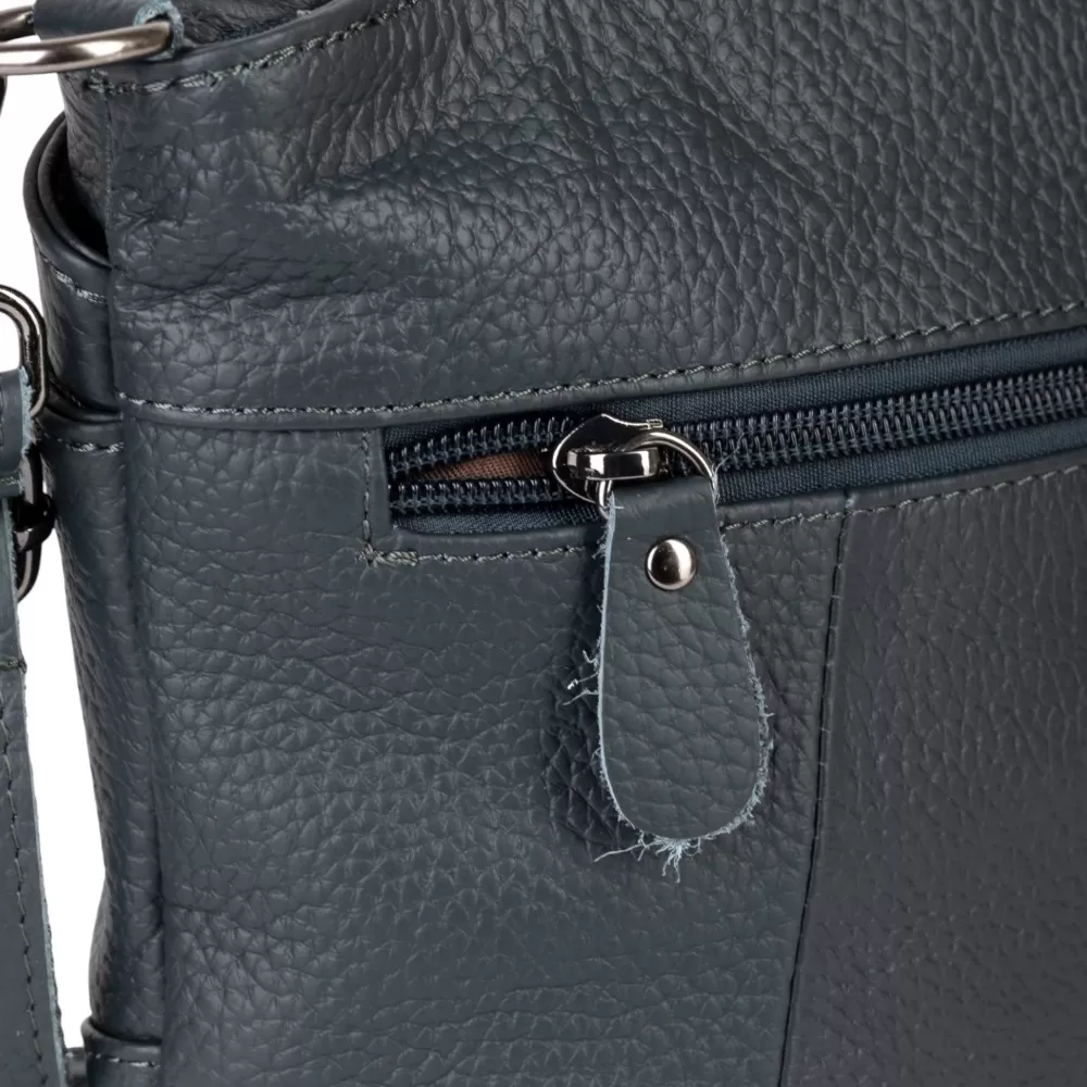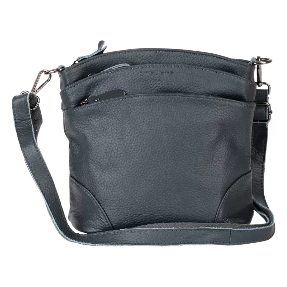 Сумка от бренда Poshete из натуральной кожи темно-синего цвета. Модель со съемным регулируемым плечевым ремнем. Отделение на молнии. Внутри: текстильная подкладка, карман на молнии. На лицевой стороне – два кармана на молнии. На задней стороне – карман на молнии.