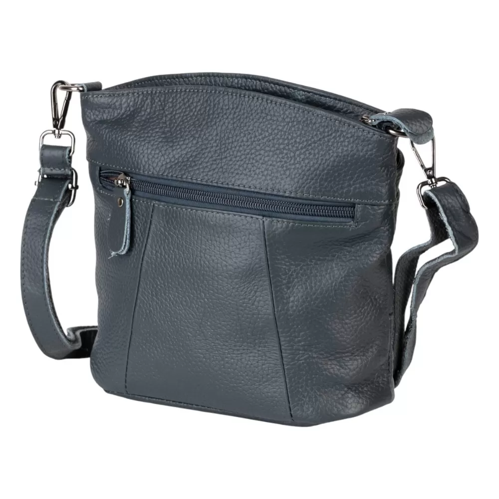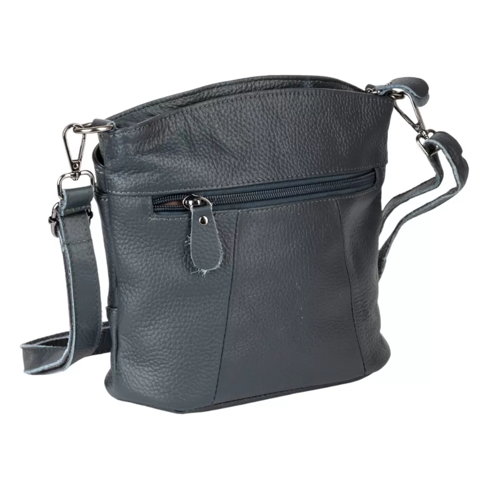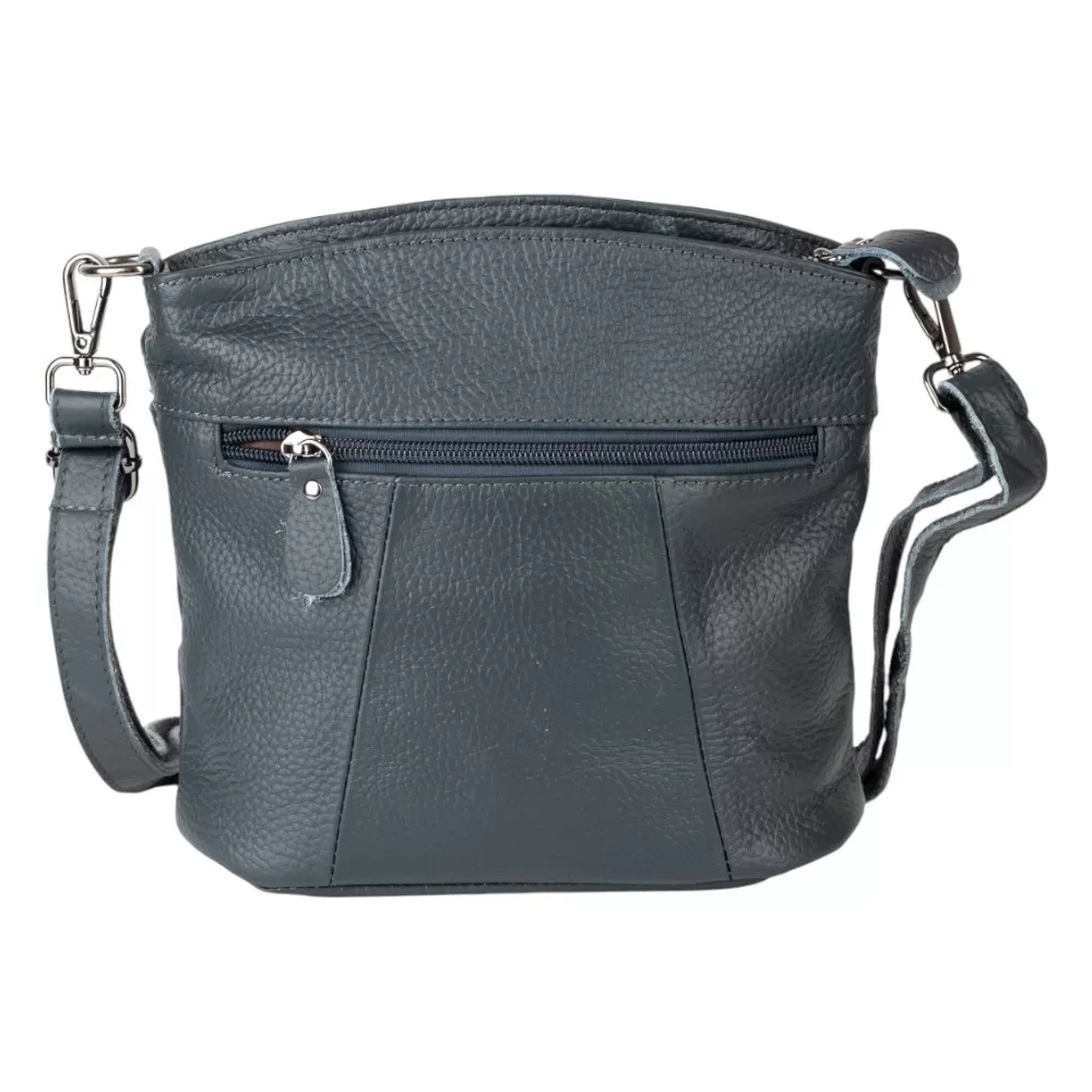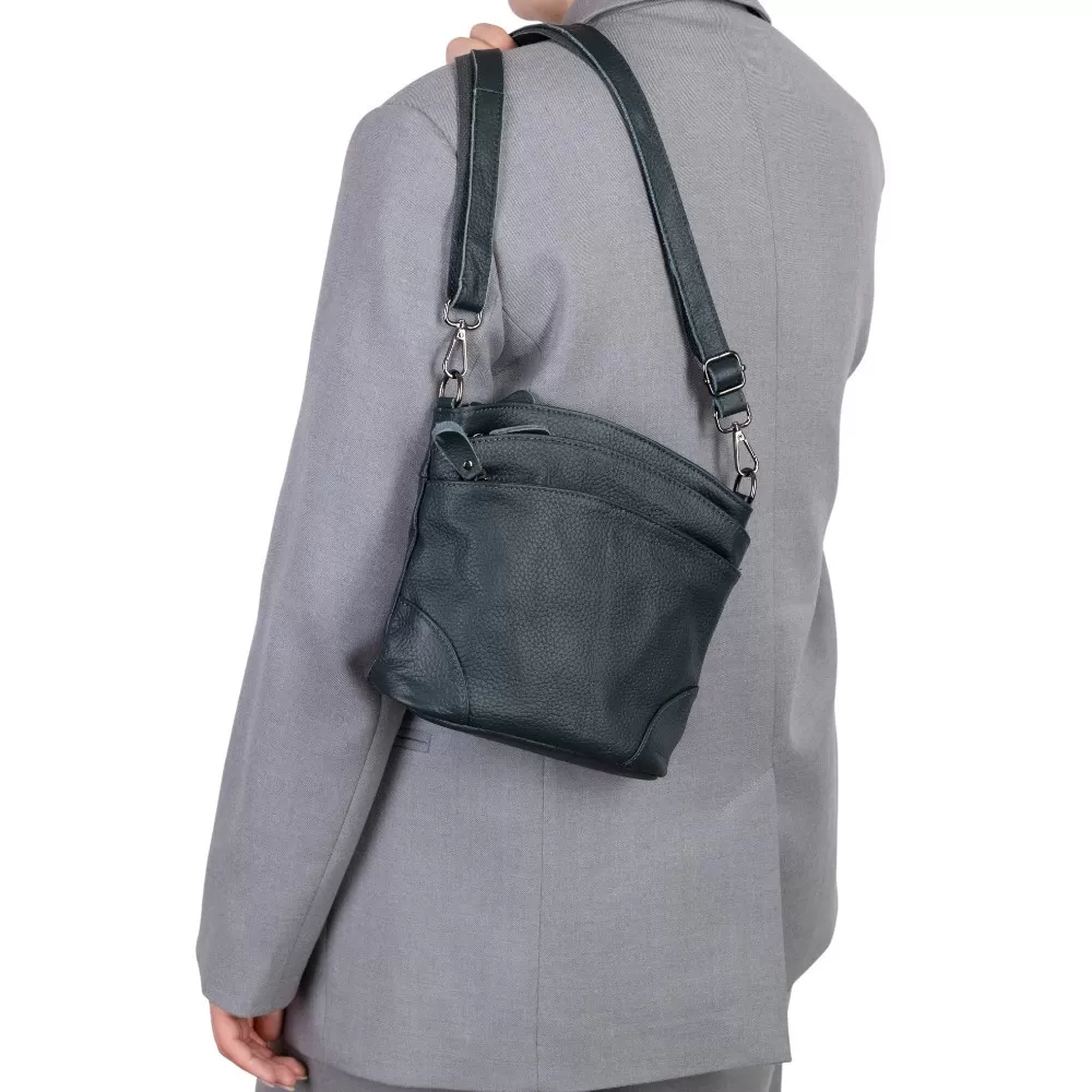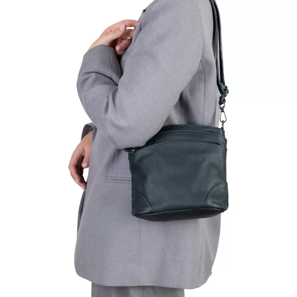 Сумка от бренда Poshete из натуральной кожи темно-синего цвета. Модель со съемным регулируемым плечевым ремнем. Отделение на молнии. Внутри: текстильная подкладка, карман на молнии. На лицевой стороне – два кармана на молнии. На задней стороне – карман на молнии.