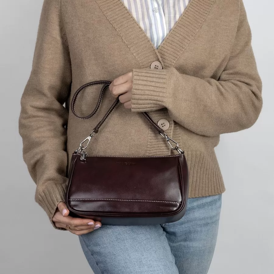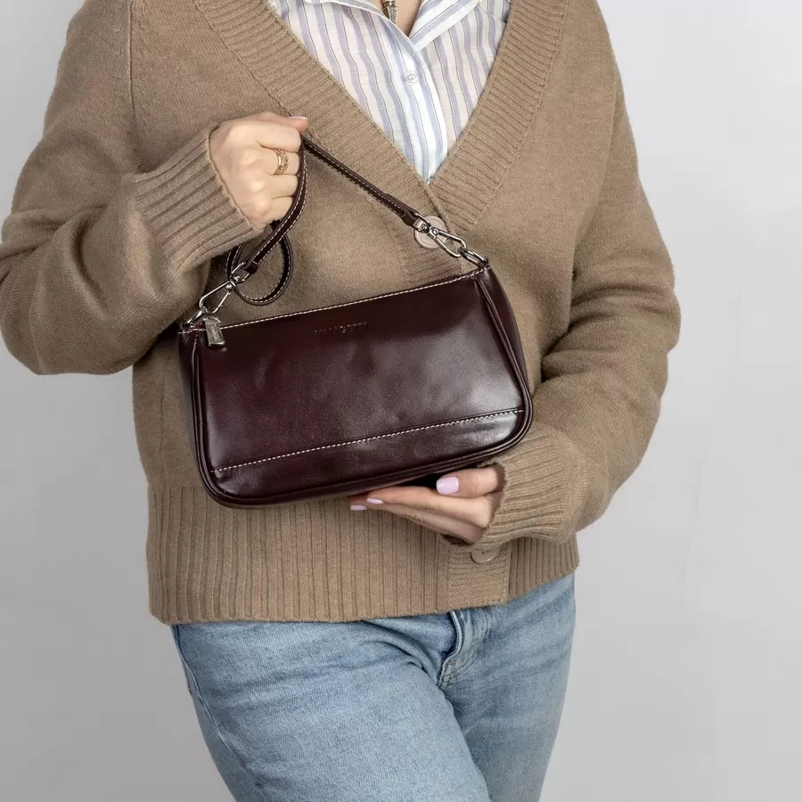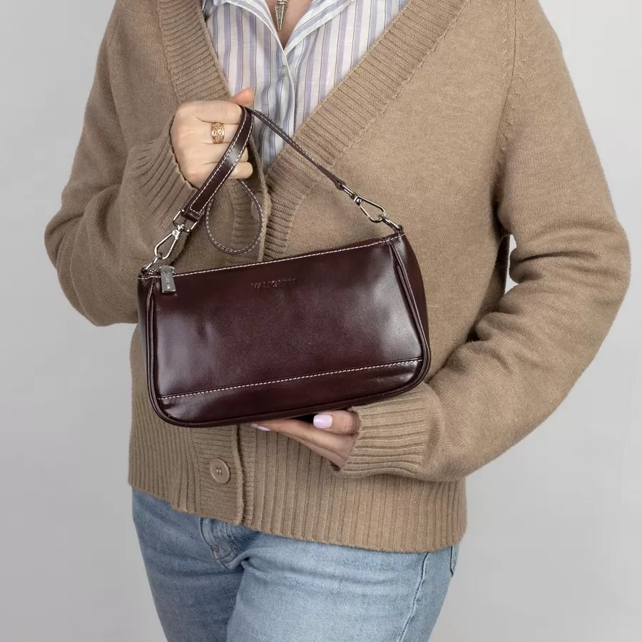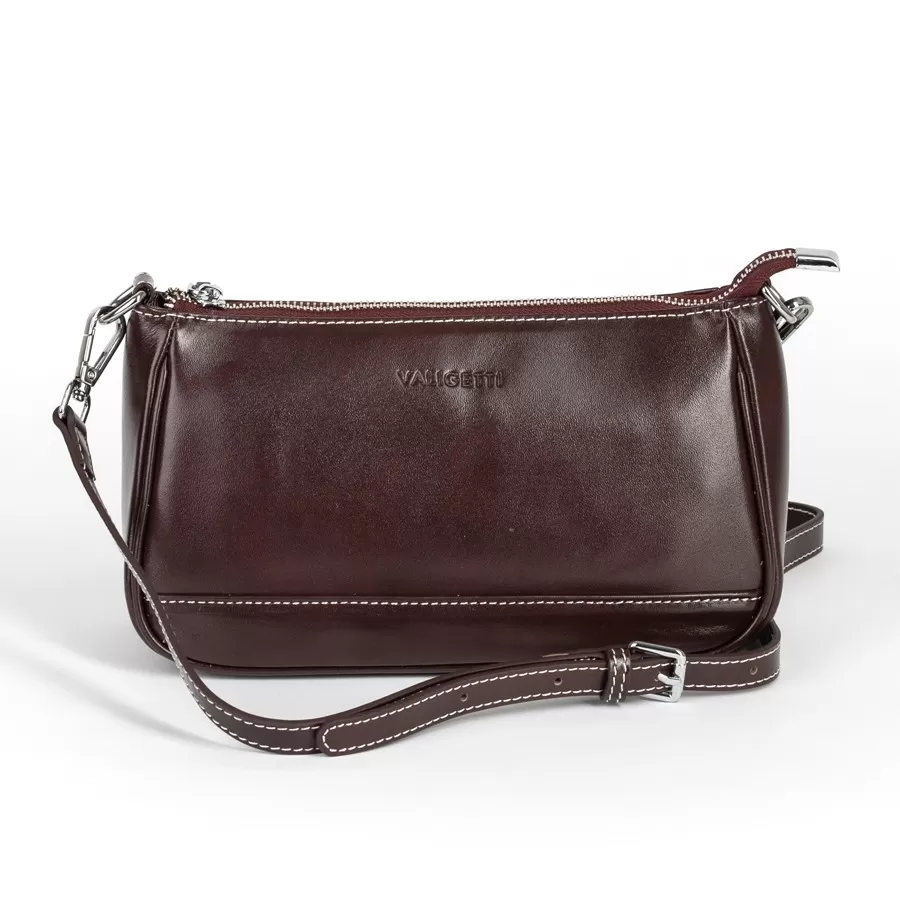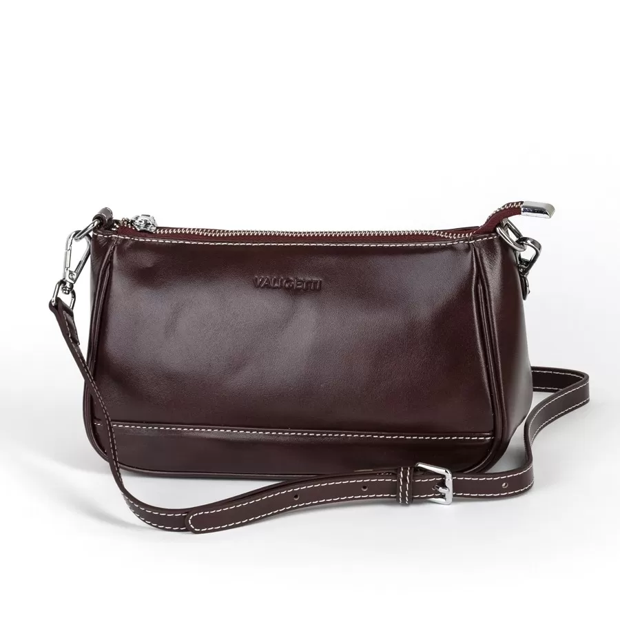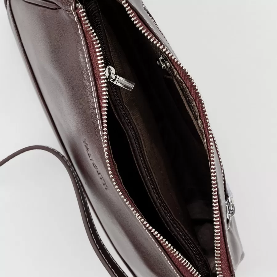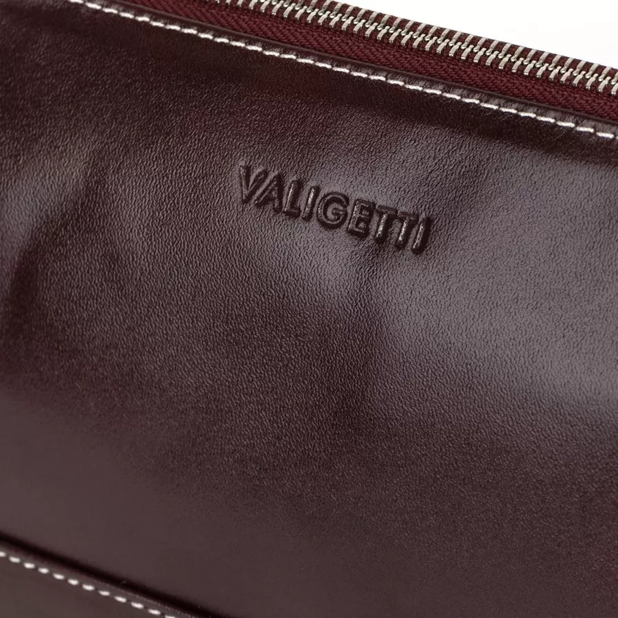 Сумка от торговой марки Valigetti из гладкой натуральной кожи бордового цвета. Модель с ручкой и съемным регулируемым плечевым ремнем. 1 основное отделение. Внутри средник на молнии, делящий сумку на 2 отделения, а также открытый карман и кармашек на молнии. На внешней стороне есть карман на молнии