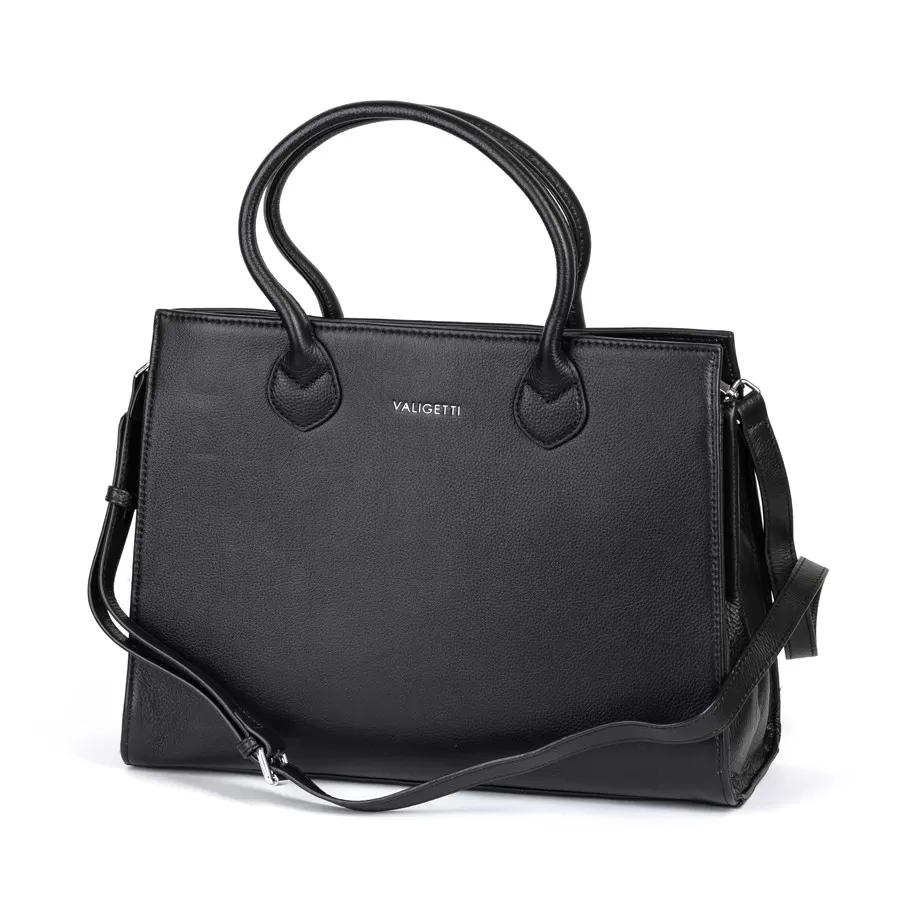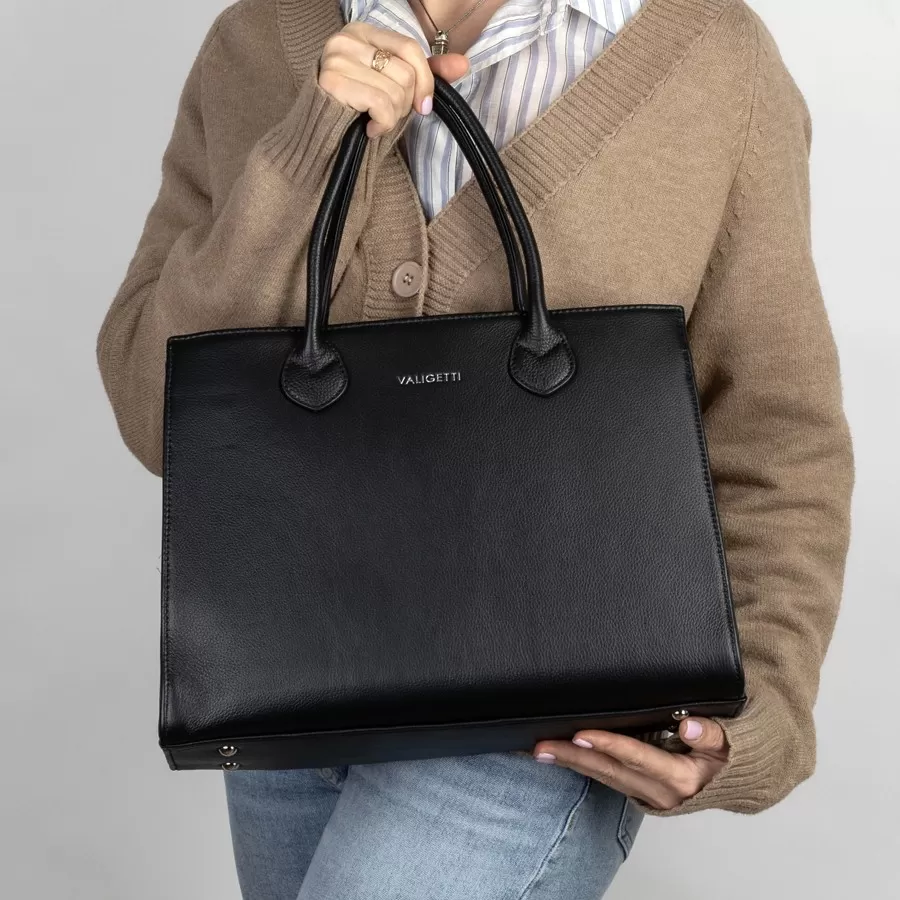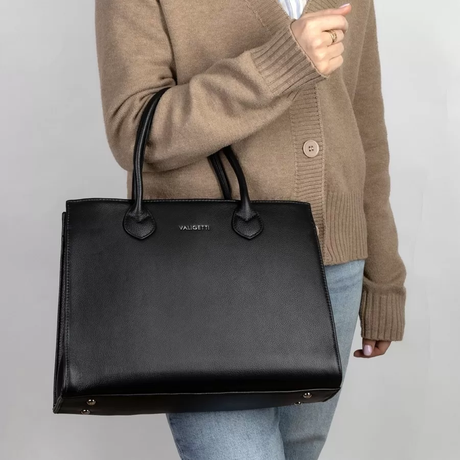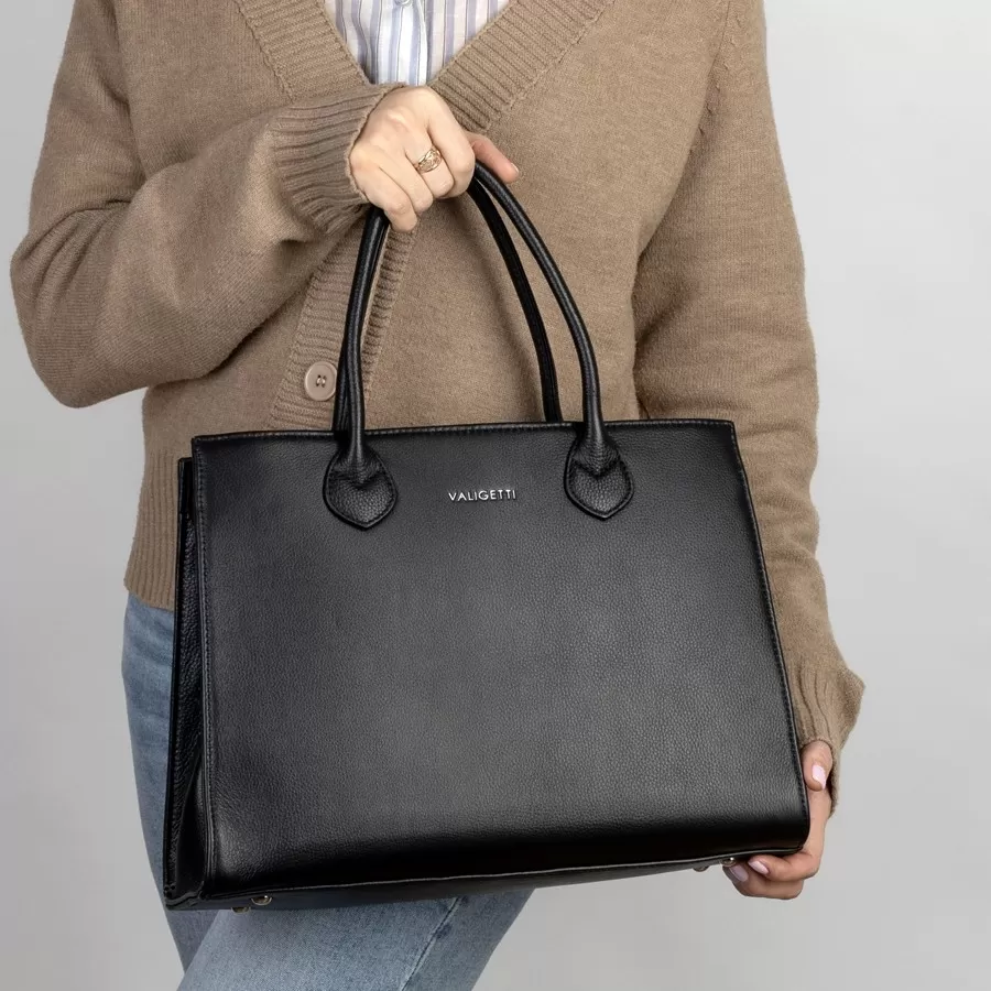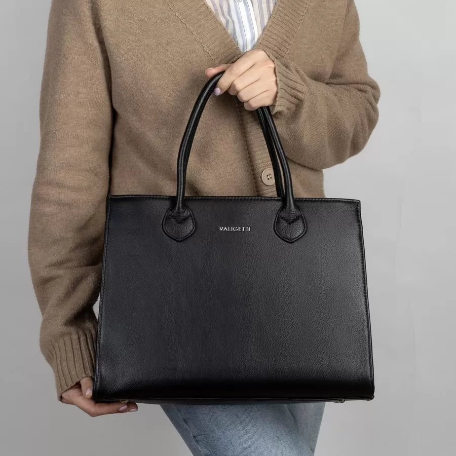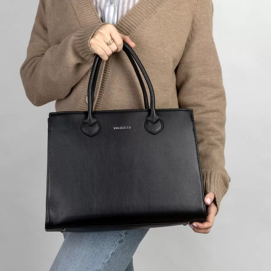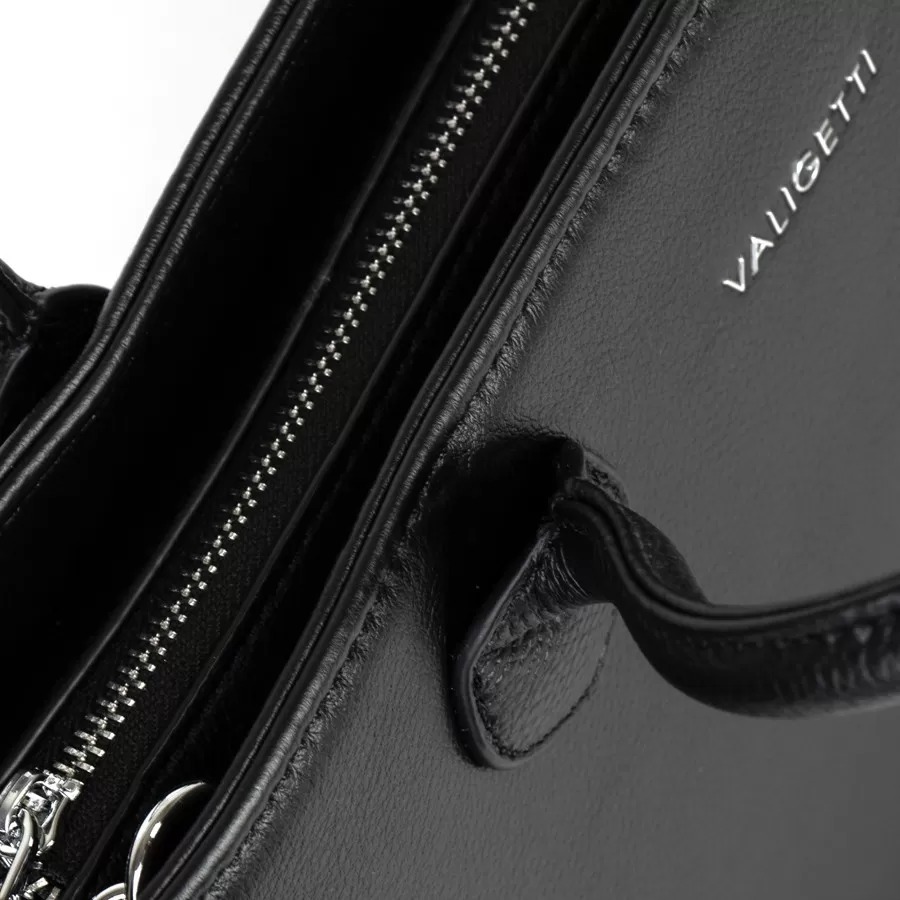 Женская сумка бренда Valigetti из натуральной кожи черного цвета с мелкой рельефной структуры. Держит форму. Имеет средник, разделяющий 2 отделения на металлических молниях. В одном отделении присутствует карман на молнии, в другом кармашки для мелких вещей. На задней стороне есть на молнии. В комплект входит прицепной плечевой ремень