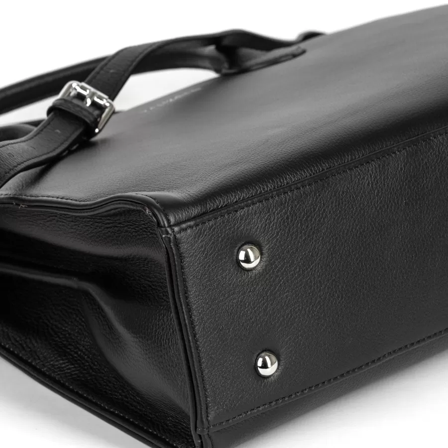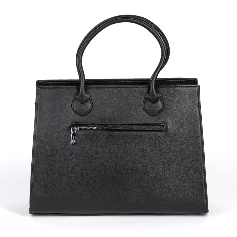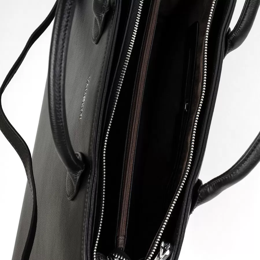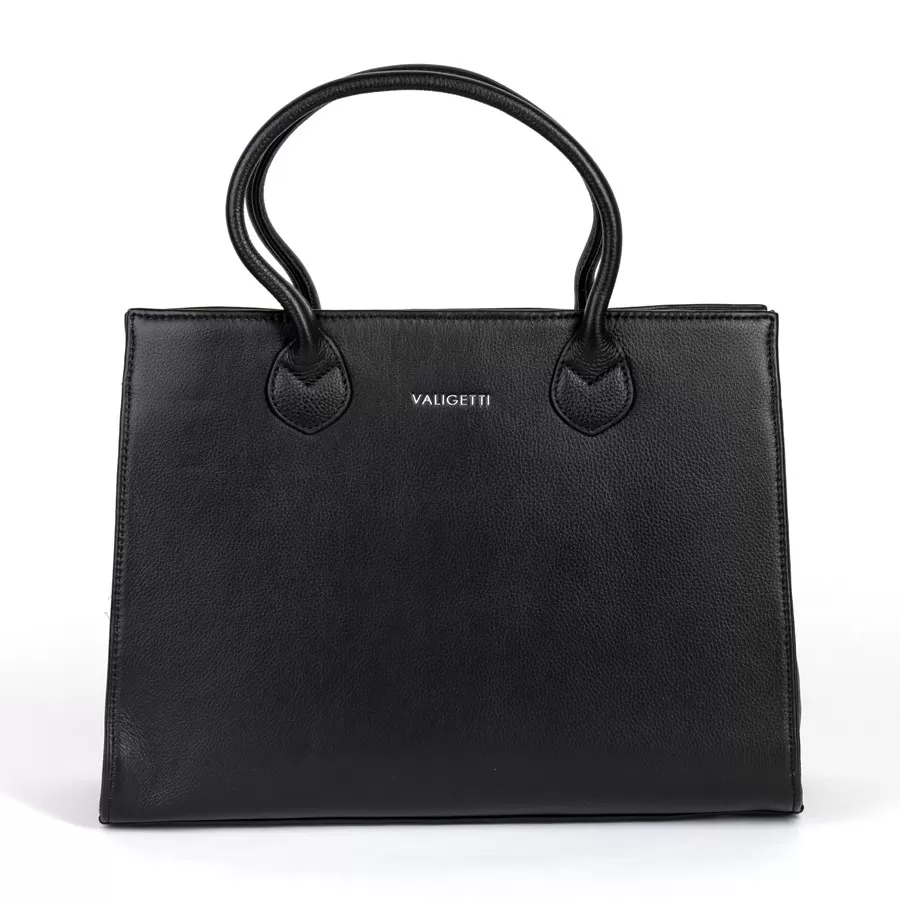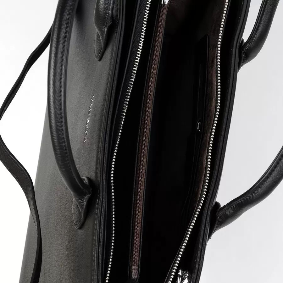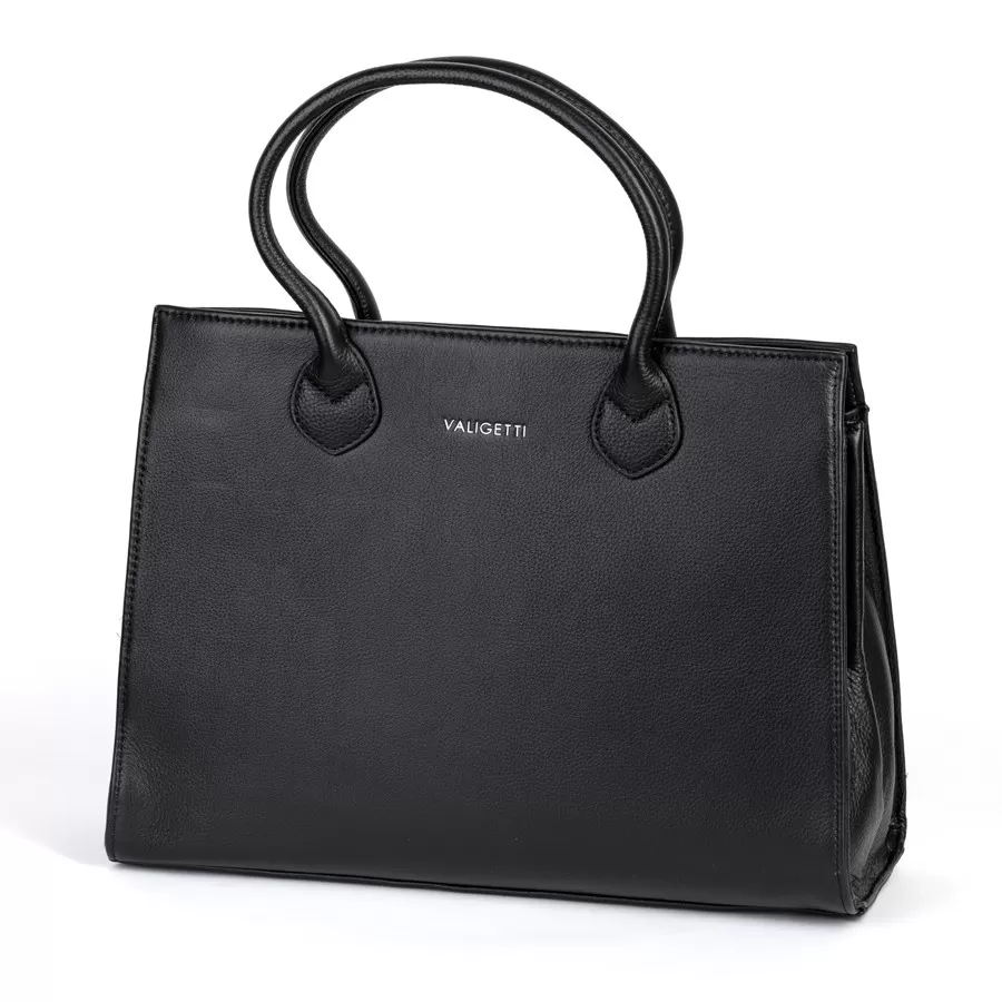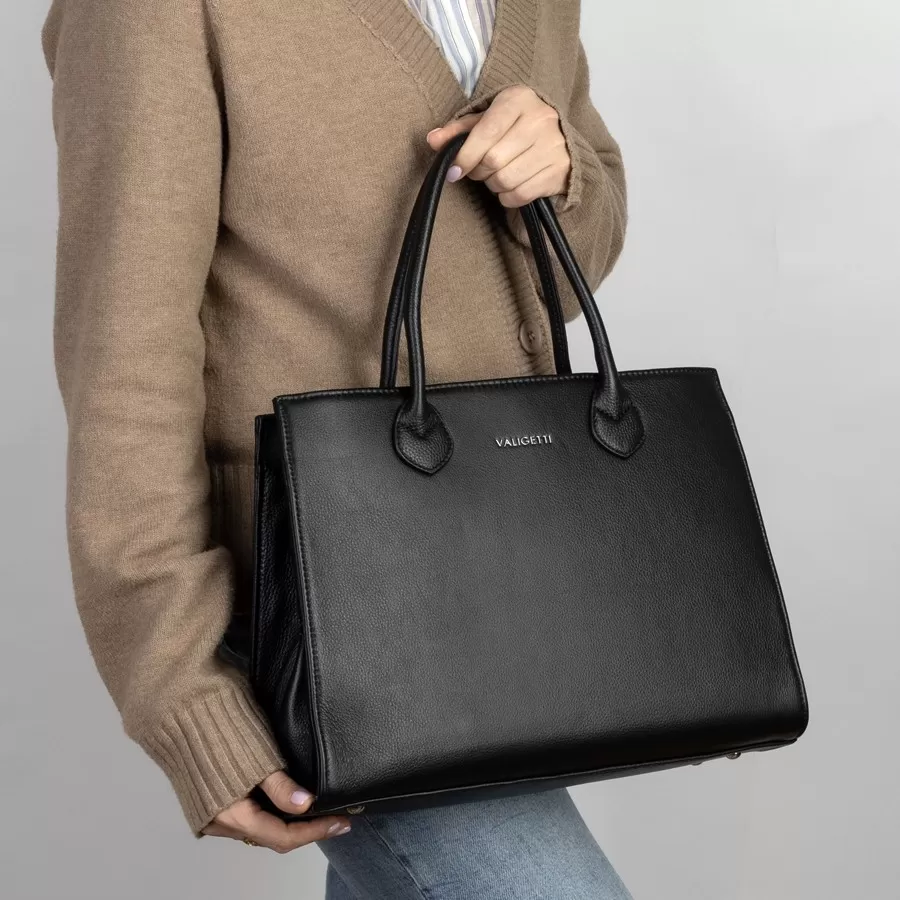 Женская сумка бренда Valigetti из натуральной кожи черного цвета с мелкой рельефной структуры. Держит форму. Имеет средник, разделяющий 2 отделения на металлических молниях. В одном отделении присутствует карман на молнии, в другом кармашки для мелких вещей. На задней стороне есть на молнии. В комплект входит прицепной плечевой ремень