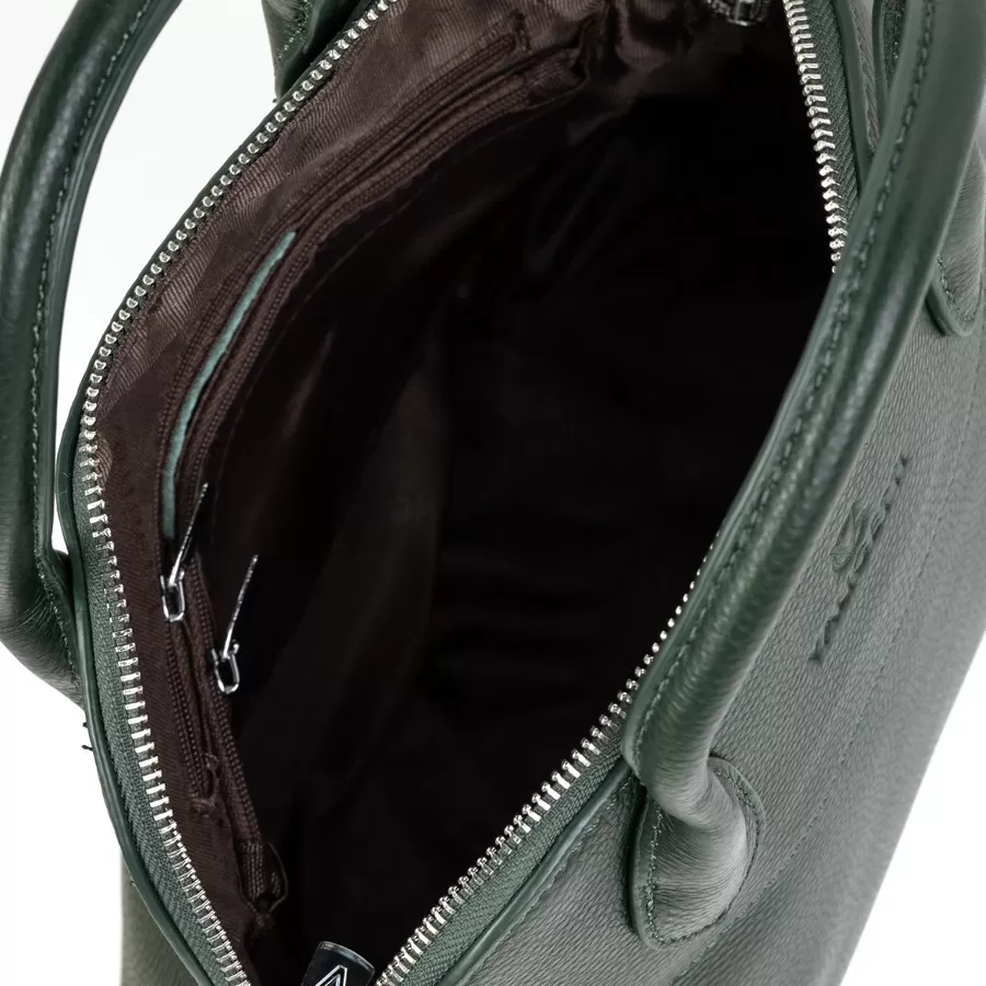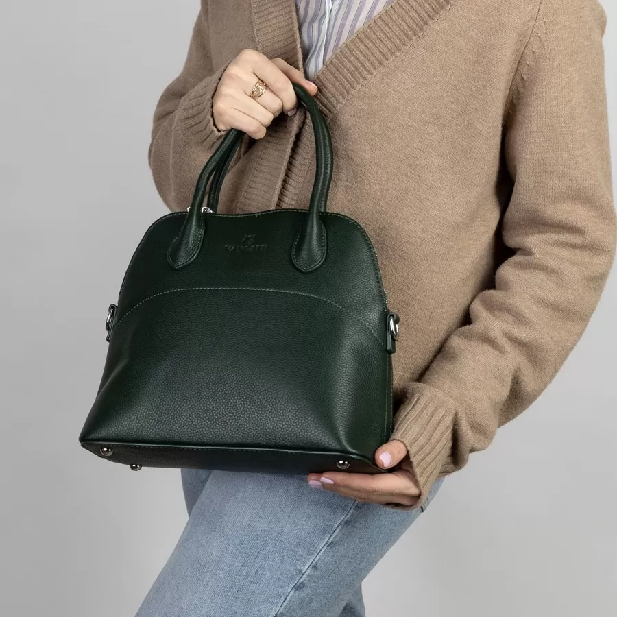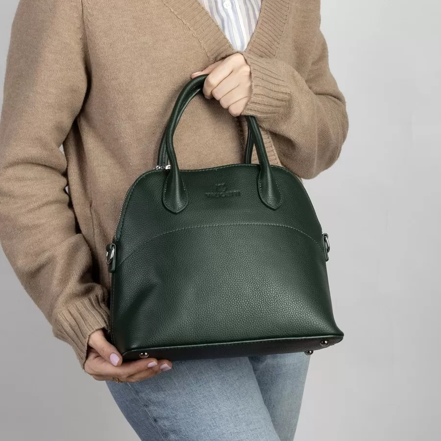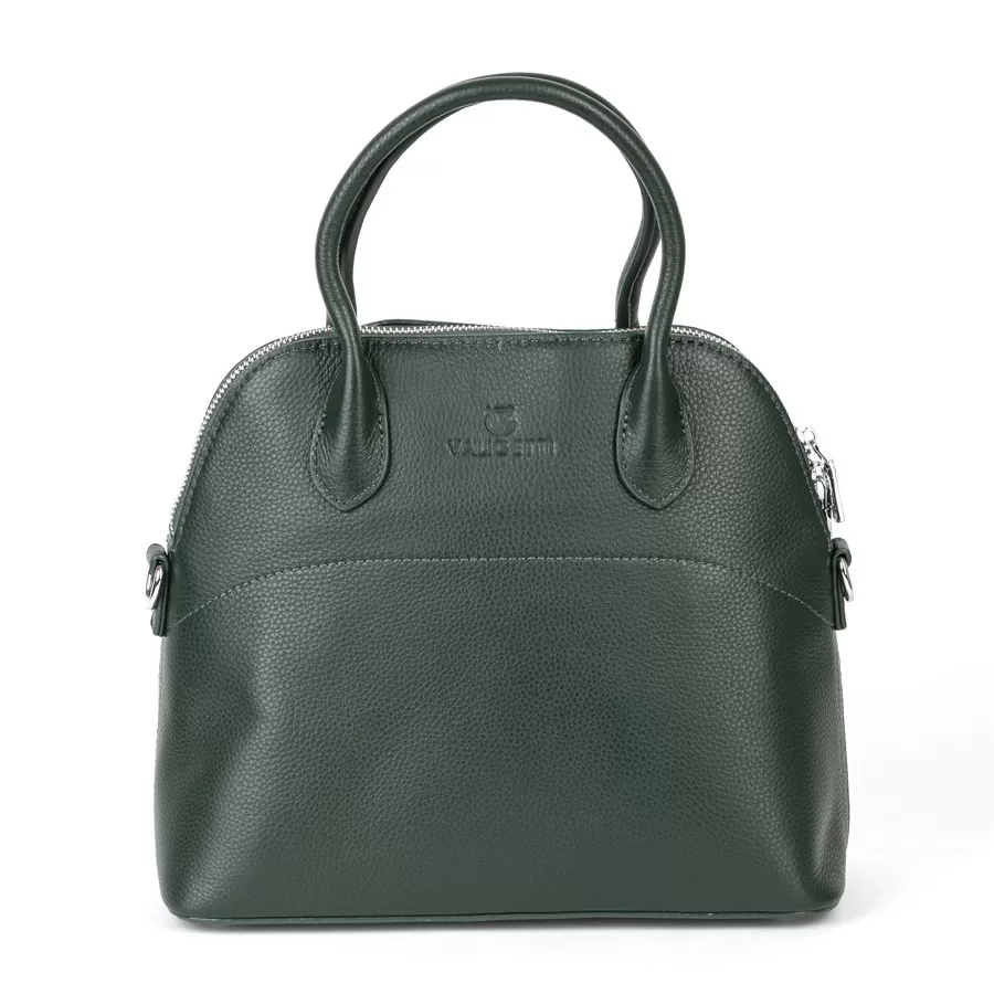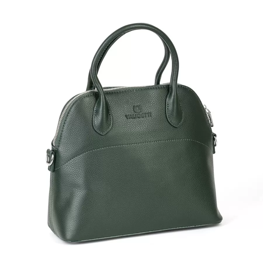Элегантный женская сумка бренда Valigetti из натуральной кожи цвета темный изумруд с зернистой структурой. Прошит фирменной подкладочной тканью. Имеет пришитую кожаные ручки. Внутри 2 отделения под молнией, средник на молнии, 2 кармана на молнии и кармашек для мелких вещей. На задней стороны есть карман на молнии