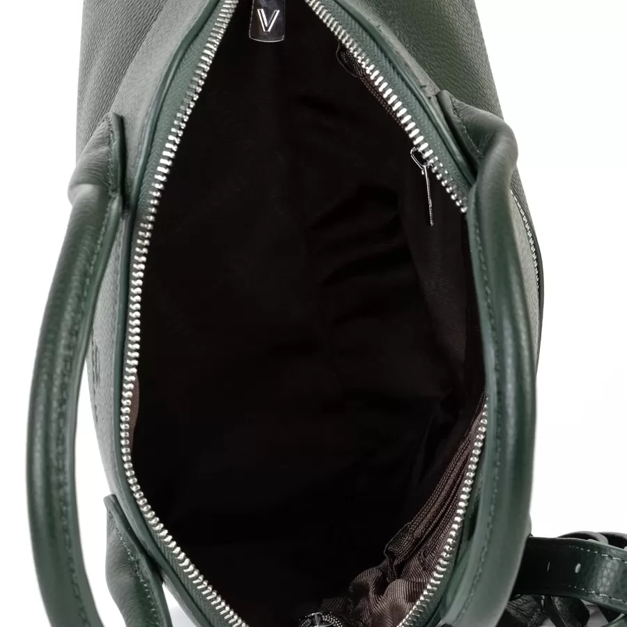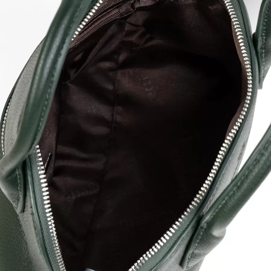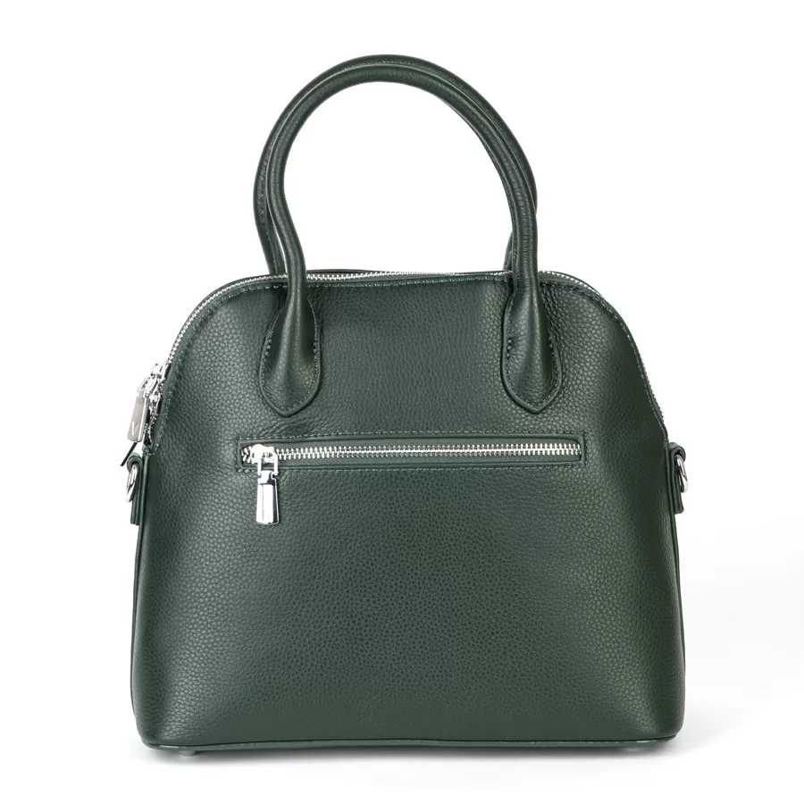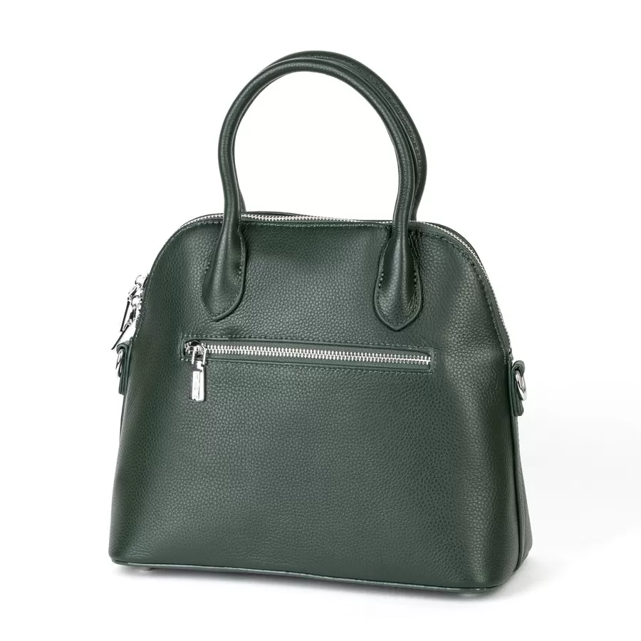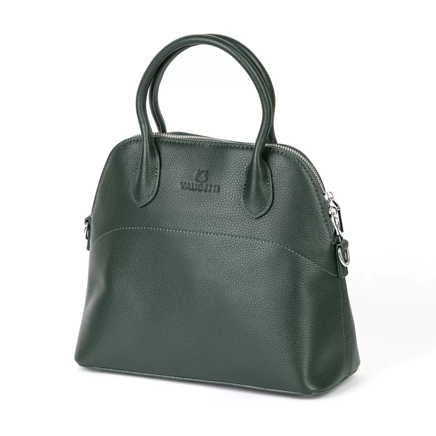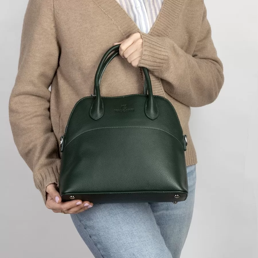 Элегантный женская сумка бренда Valigetti из натуральной кожи цвета темный изумруд с зернистой структурой. Прошит фирменной подкладочной тканью. Имеет пришитую кожаные ручки. Внутри 2 отделения под молнией, средник на молнии, 2 кармана на молнии и кармашек для мелких вещей. На задней стороны есть карман на молнии