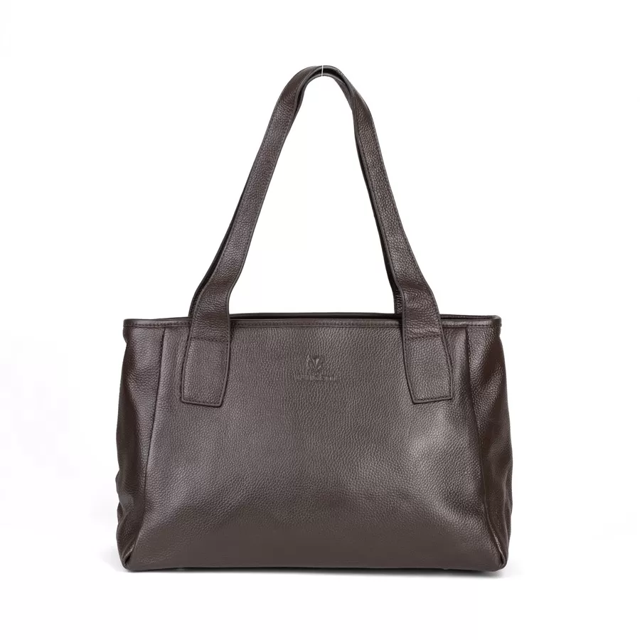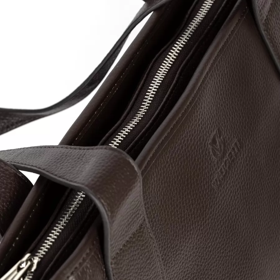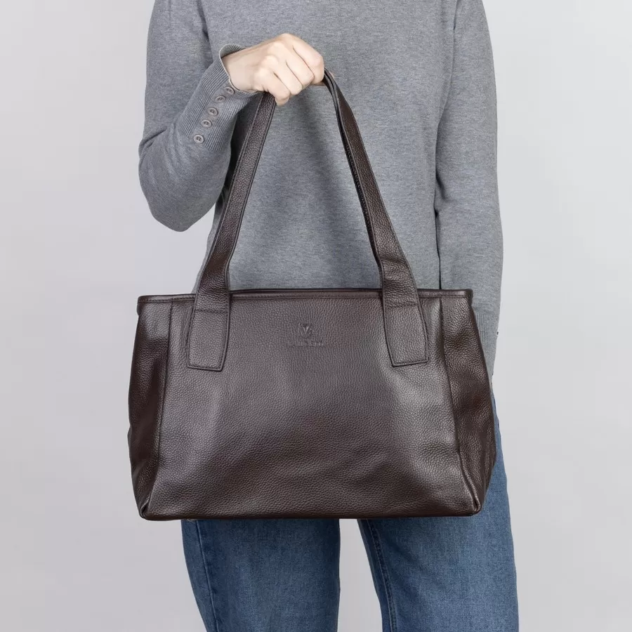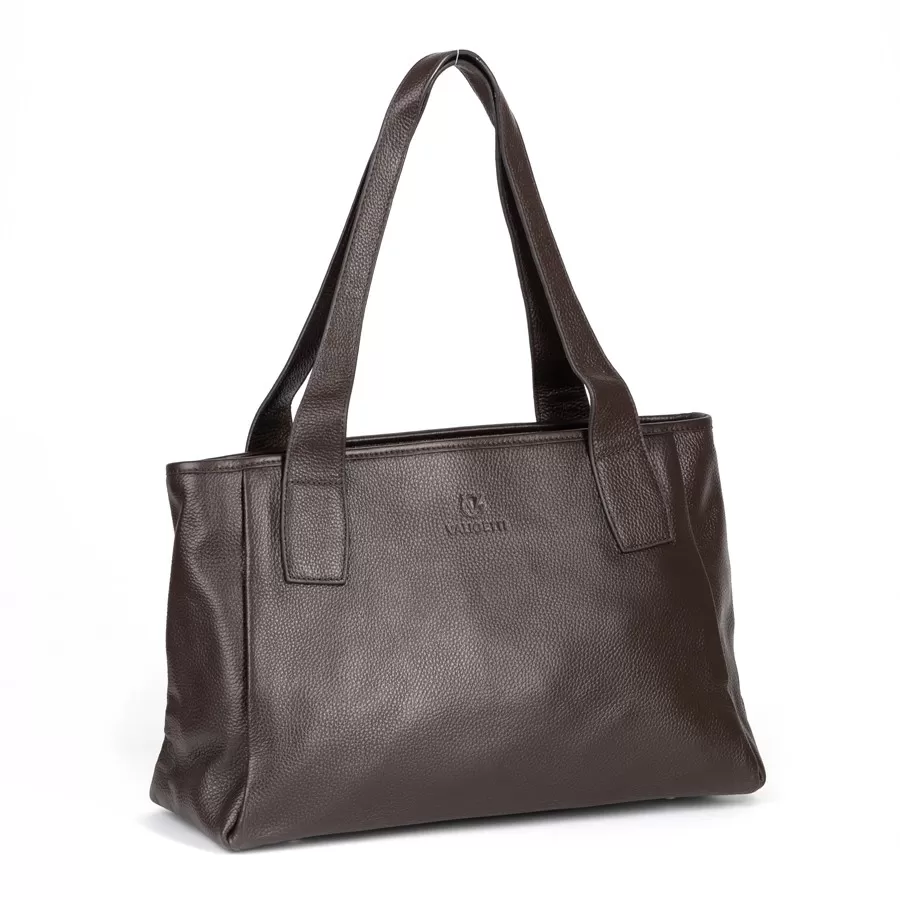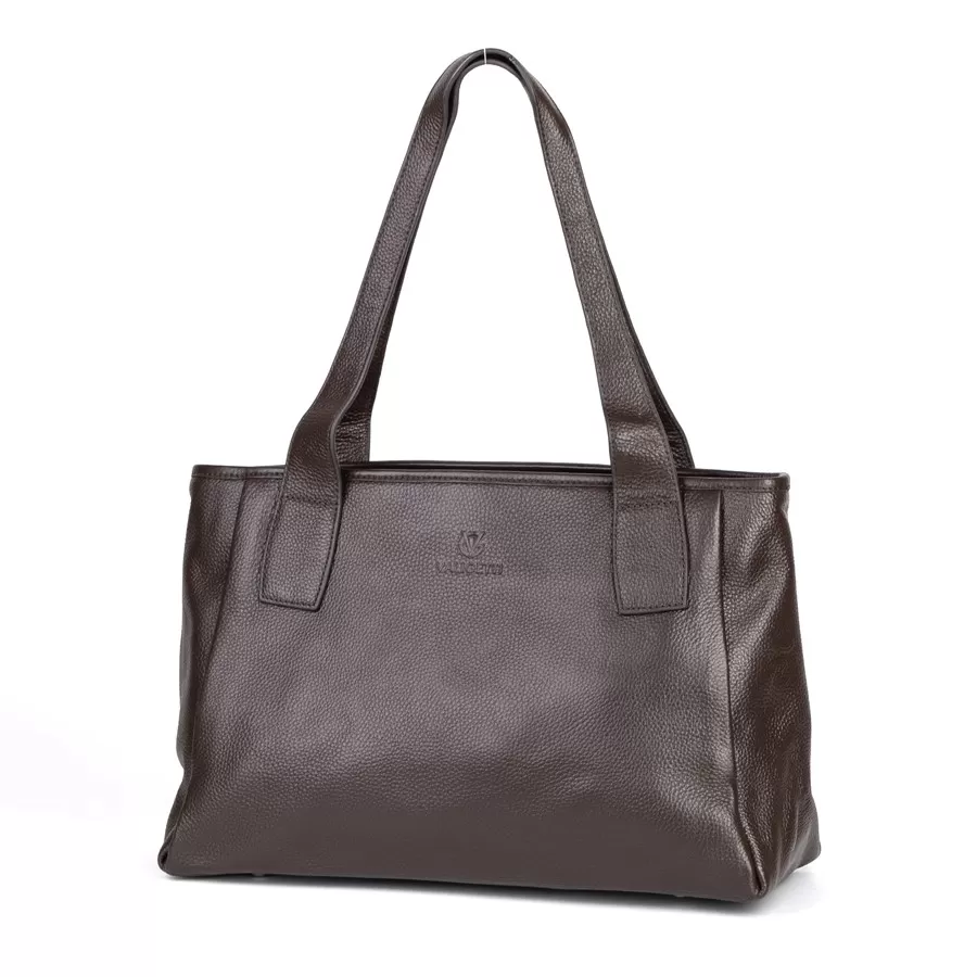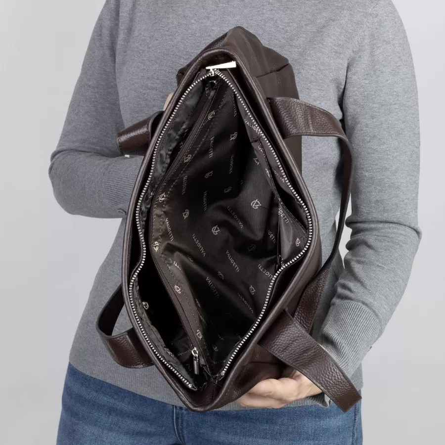 Женская сумка бренда Valigetti из натуральной кожи с зернистой структурой. Прошита фирменной подкладочной тканью. Имеет вшитые кожаные ручки. Внутри 2 отделения под молнией, средник на молнии, 2 кармана на молнии и кармашек для мелких вещей. На задней стороне есть карман на молнии