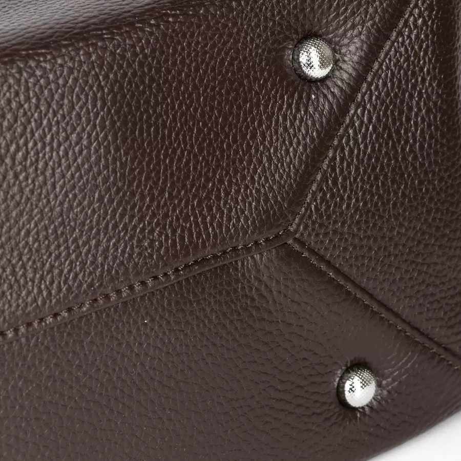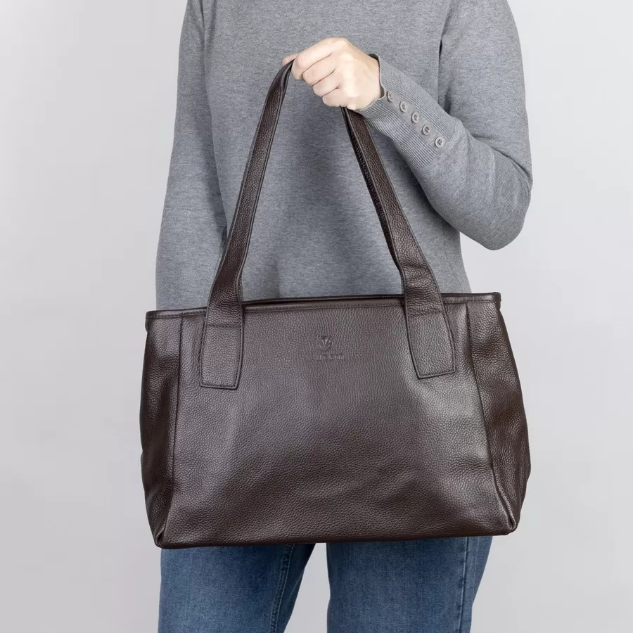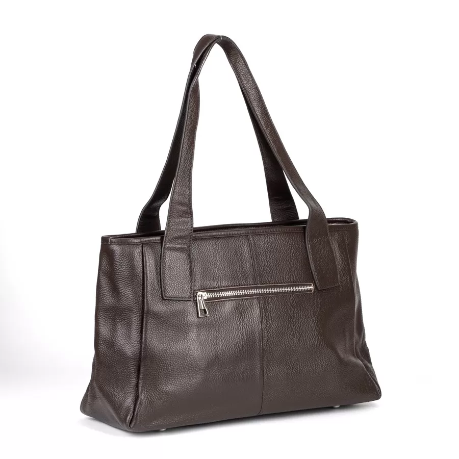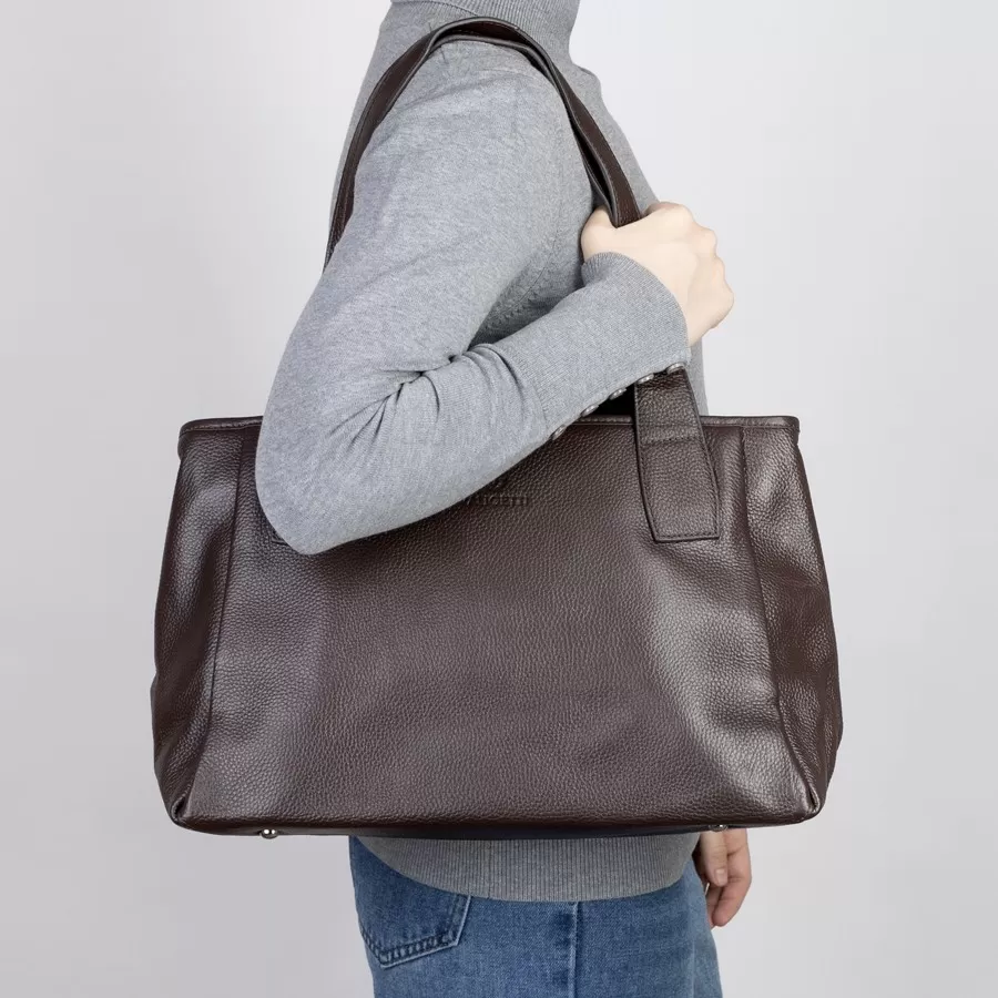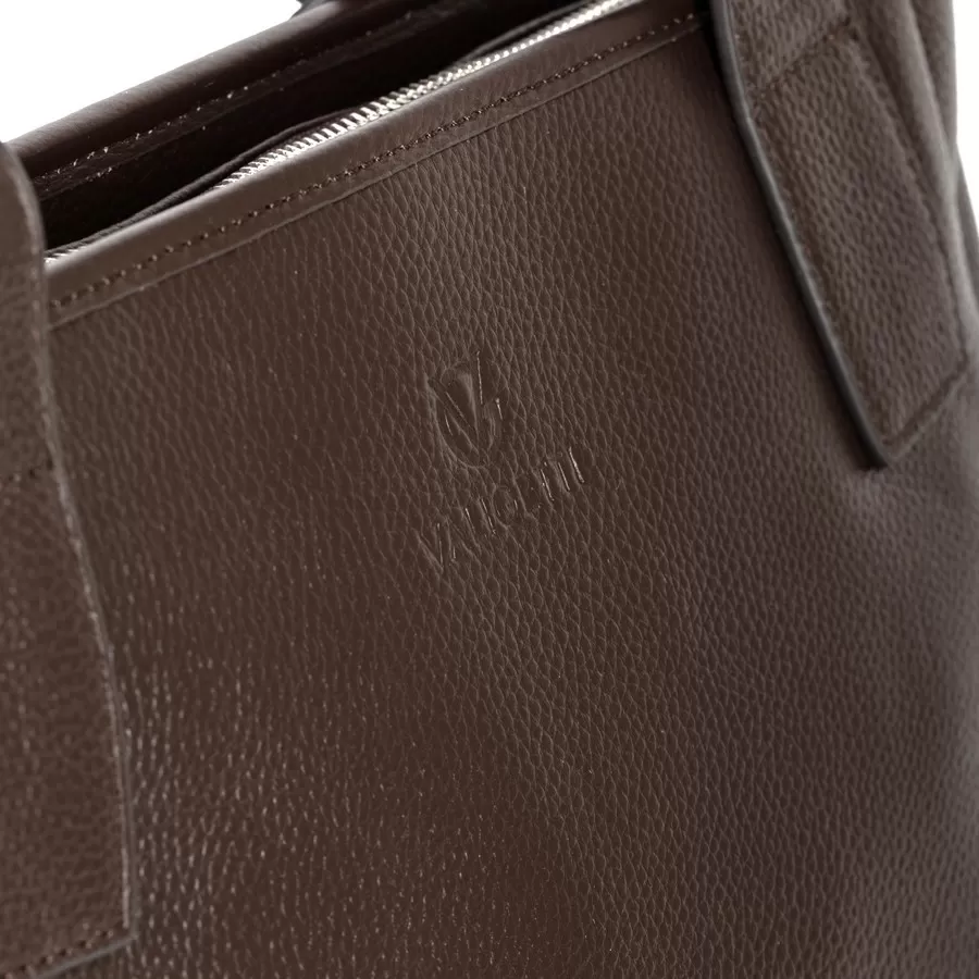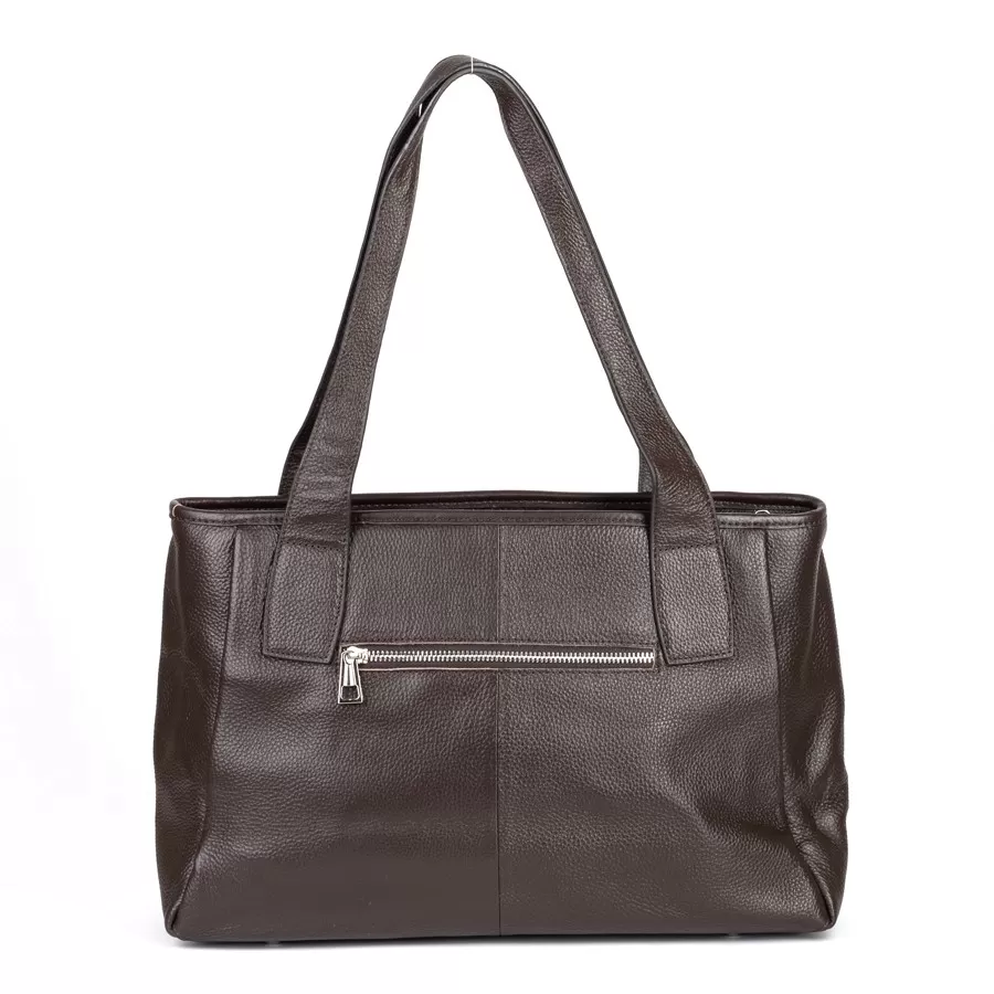 Женская сумка бренда Valigetti из натуральной кожи с зернистой структурой. Прошита фирменной подкладочной тканью. Имеет вшитые кожаные ручки. Внутри 2 отделения под молнией, средник на молнии, 2 кармана на молнии и кармашек для мелких вещей. На задней стороне есть карман на молнии