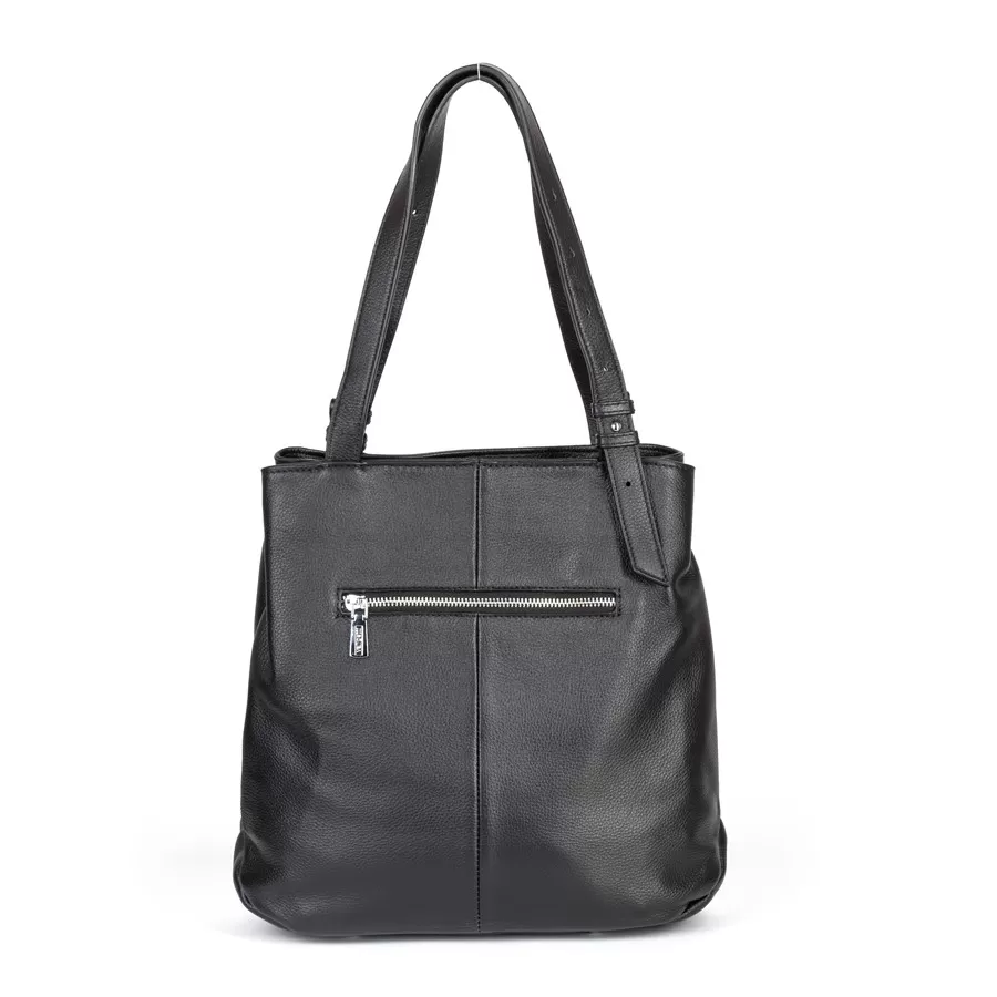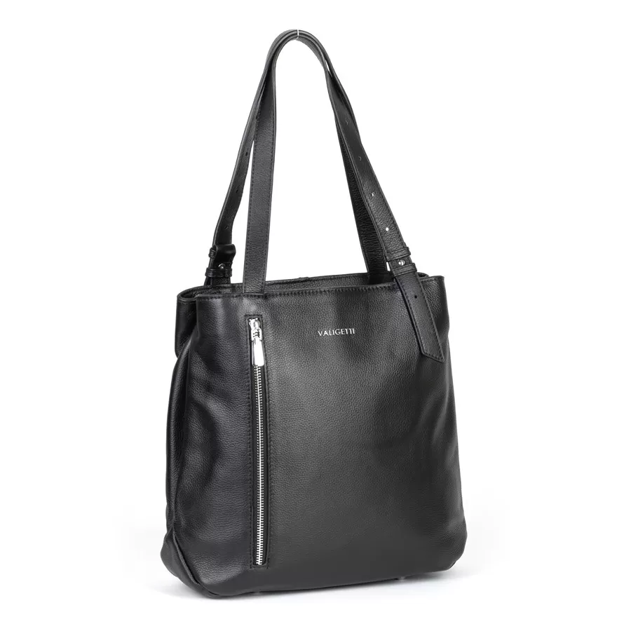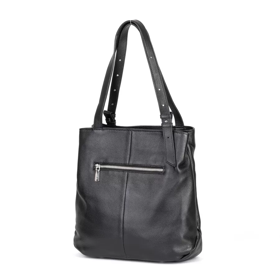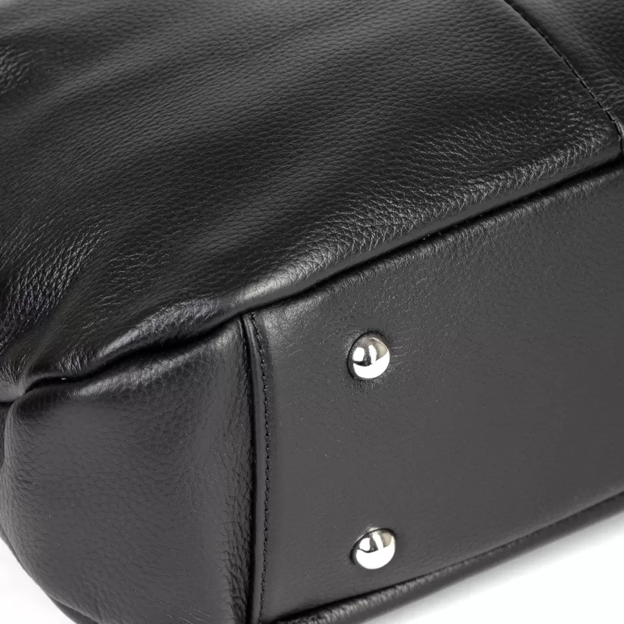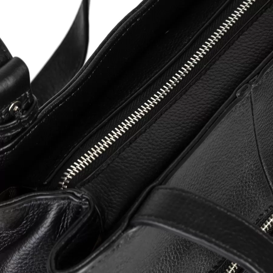 Сумка из натуральной кожи черного цвета. Модель с двумя ручками, основное отделение на молнии, с текстильной подкладкой и карманом на молнии. На лицевой стороне – элегантный кармана на молнии. На задней стороне – карман на молнии.