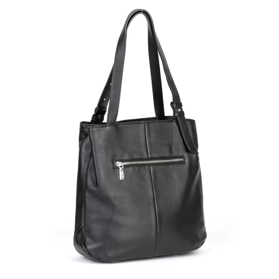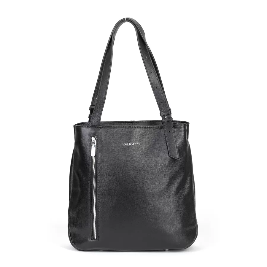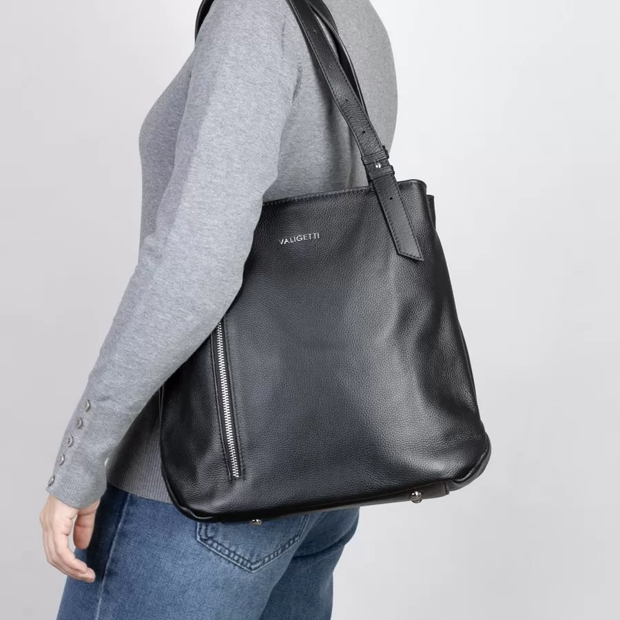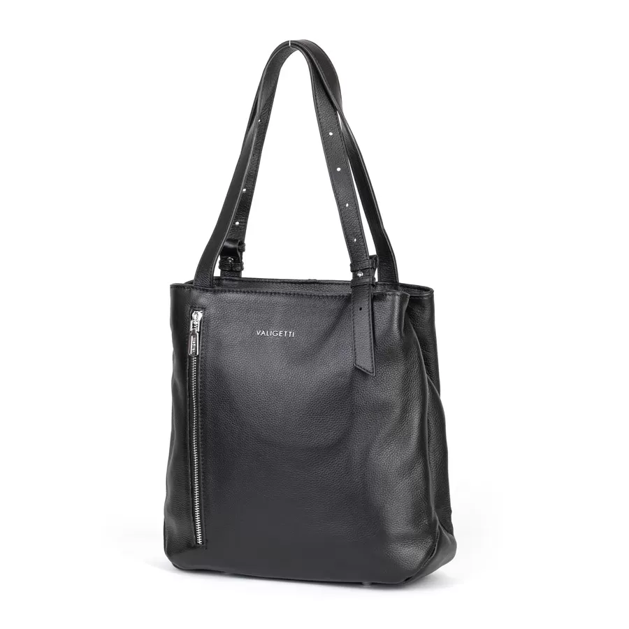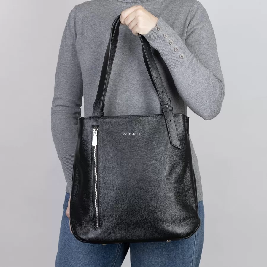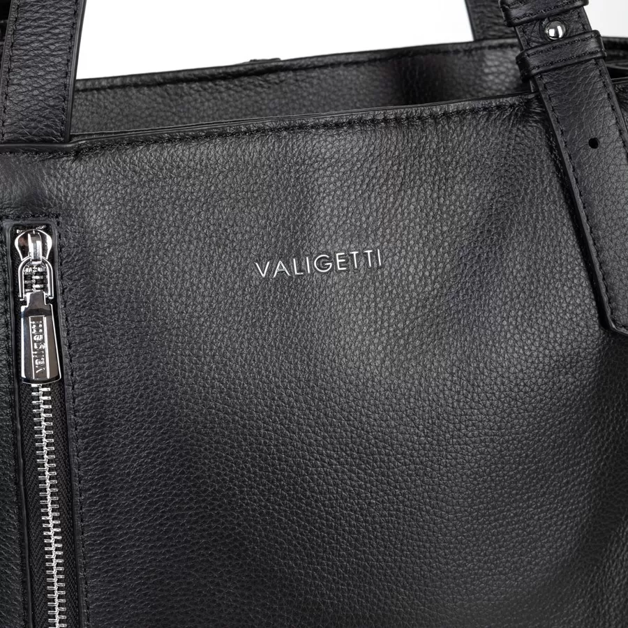 Сумка из натуральной кожи черного цвета. Модель с двумя ручками, основное отделение на молнии, с текстильной подкладкой и карманом на молнии. На лицевой стороне – элегантный кармана на молнии. На задней стороне – карман на молнии.