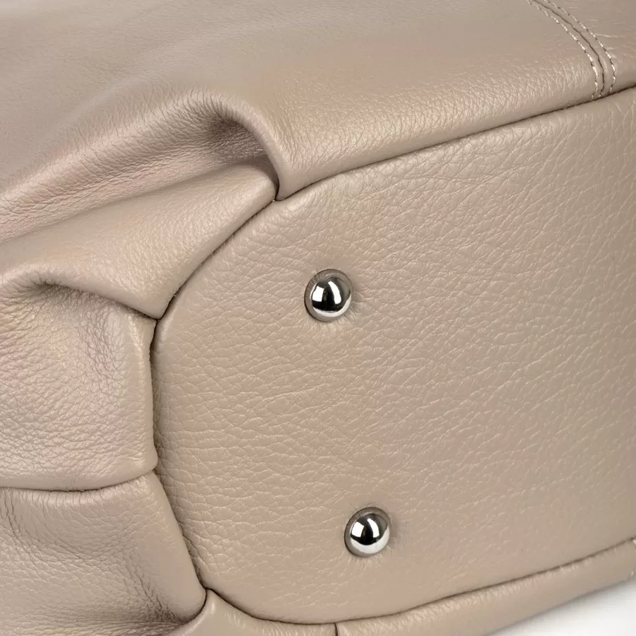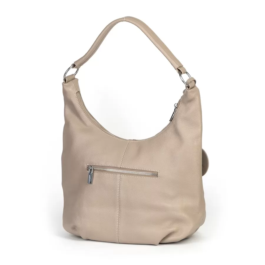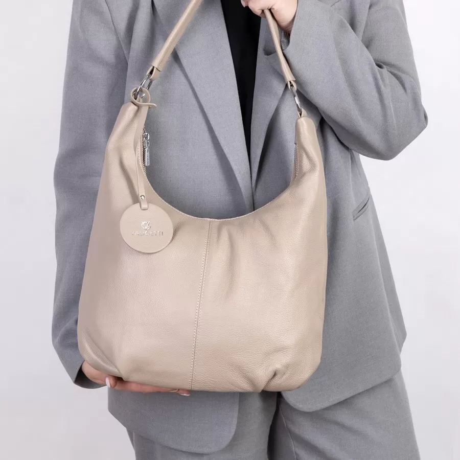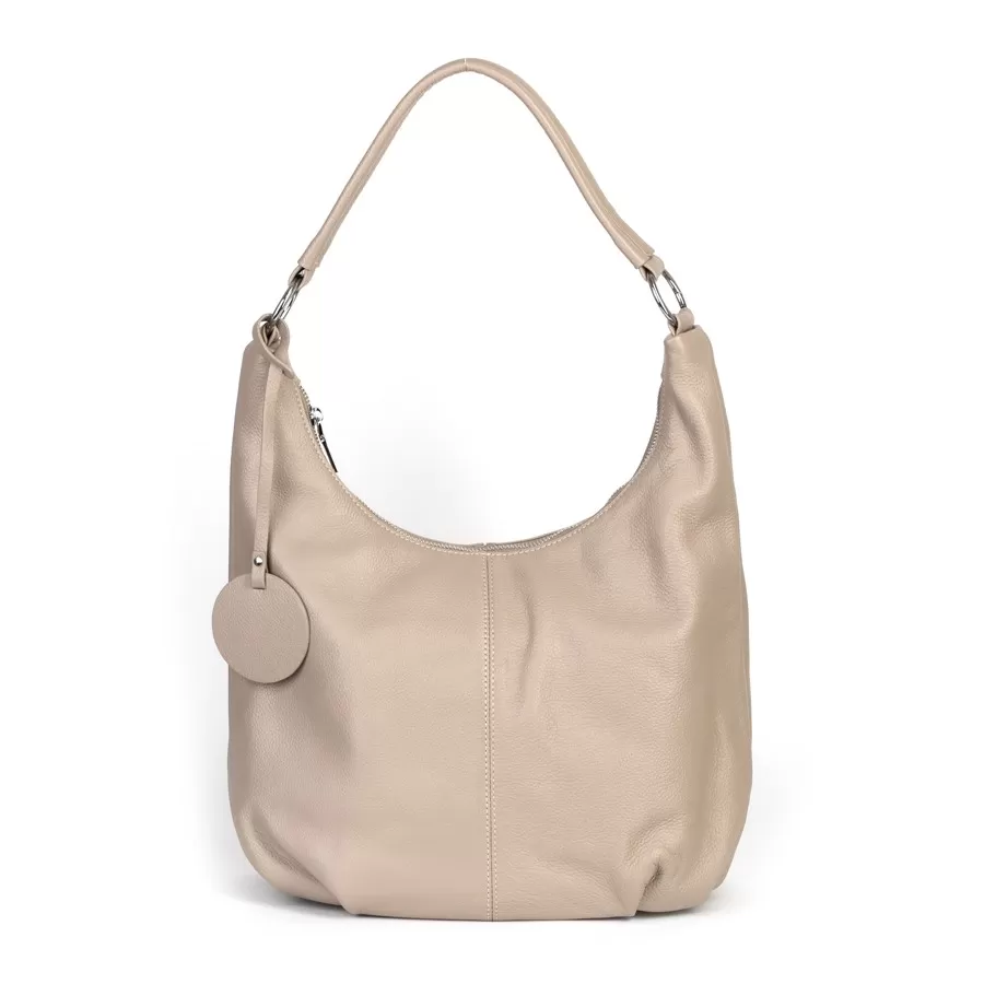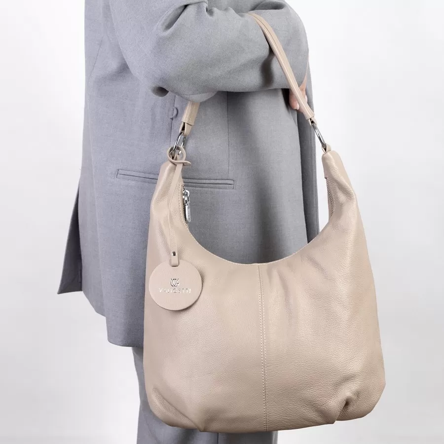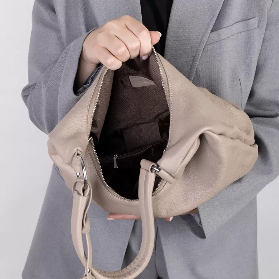 Женская сумка в бежевом цвете с элегантным минималистичным дизайном. Форма — округлая, структурированная, с мягкой текстурой кожи. На ремне закреплён круглый кожаный брелок с логотипом бренда. Внутри — тёмная подкладка с карманом на молнии и кожаной бренд‑вставкой.