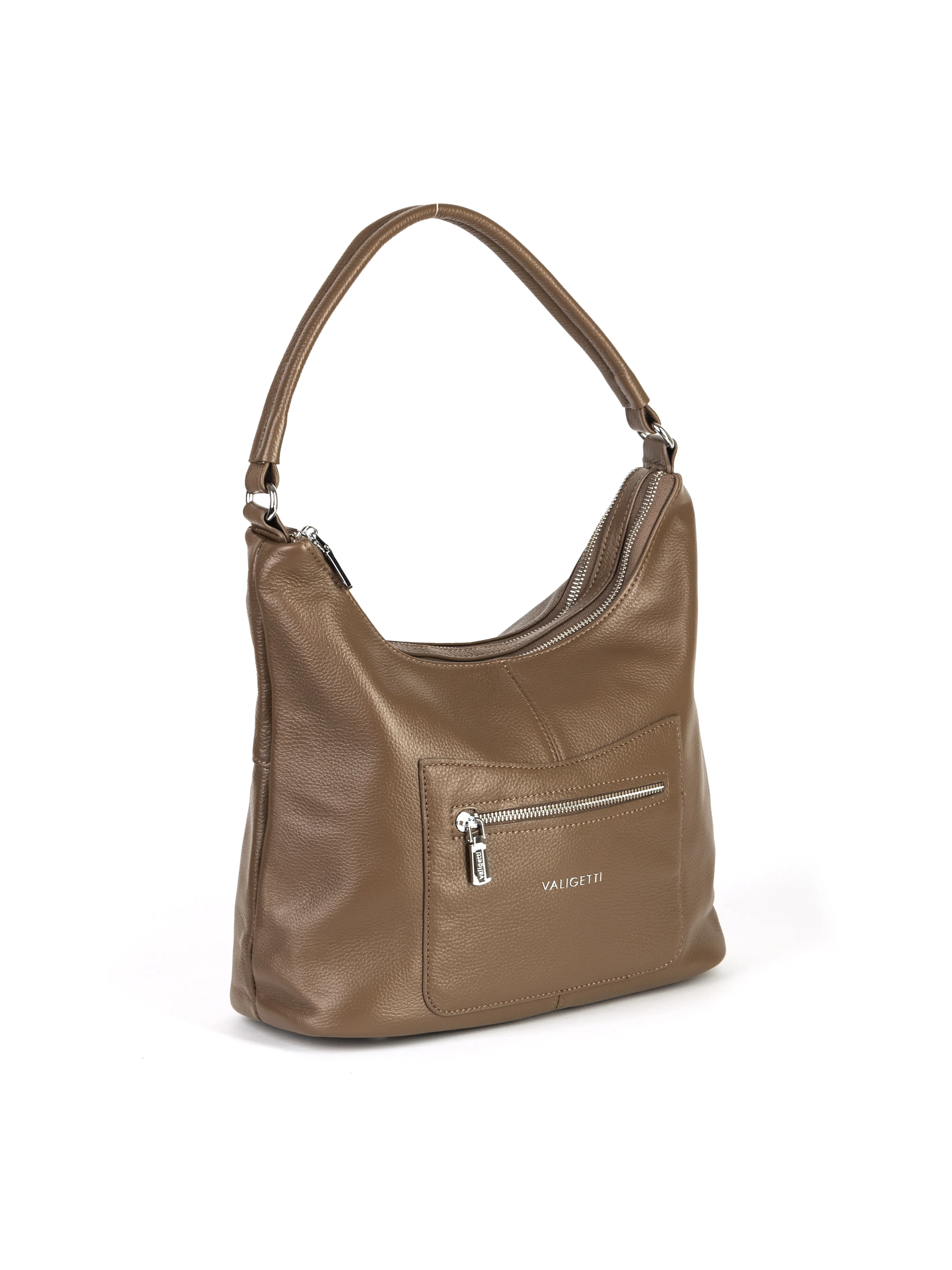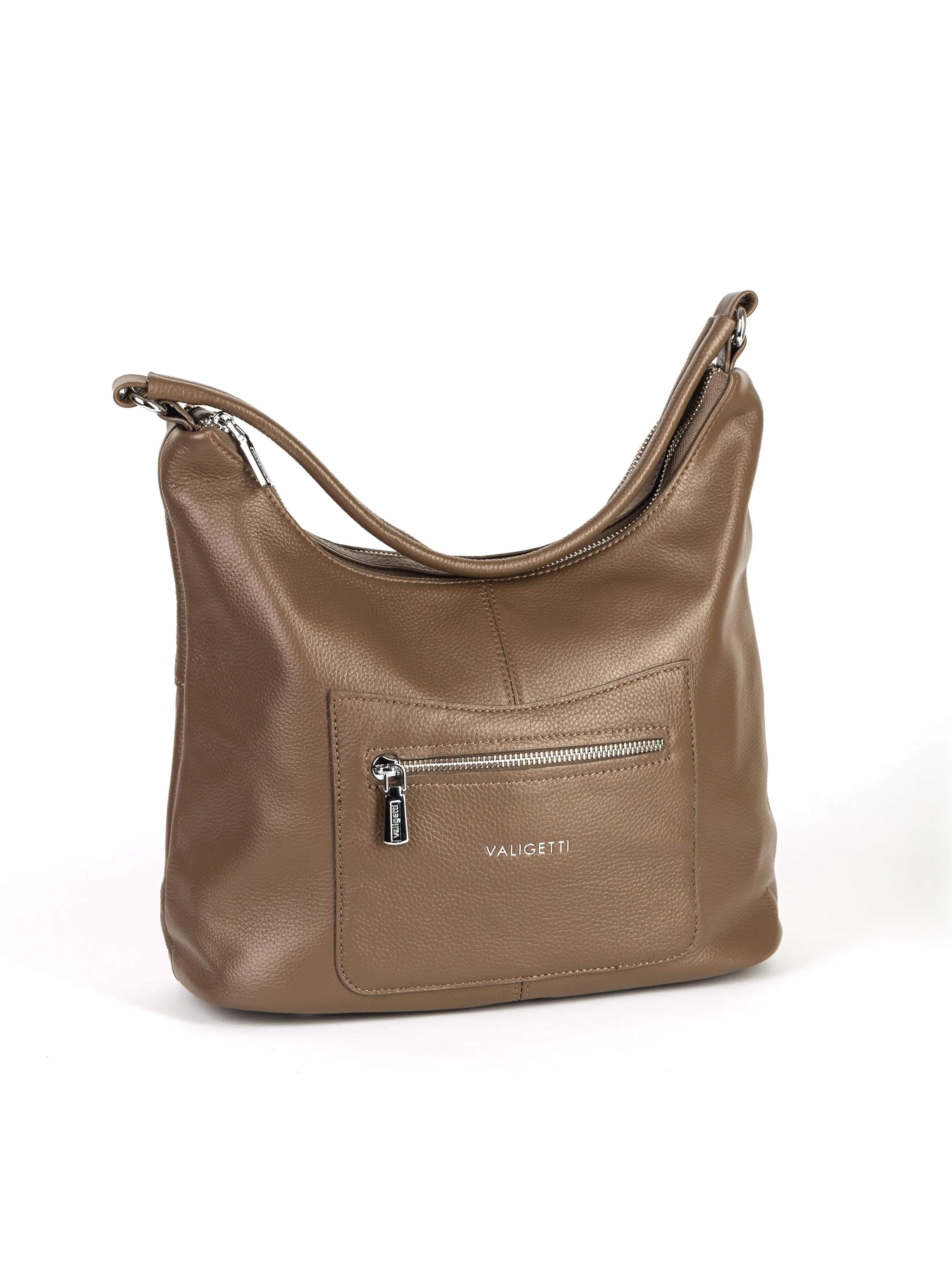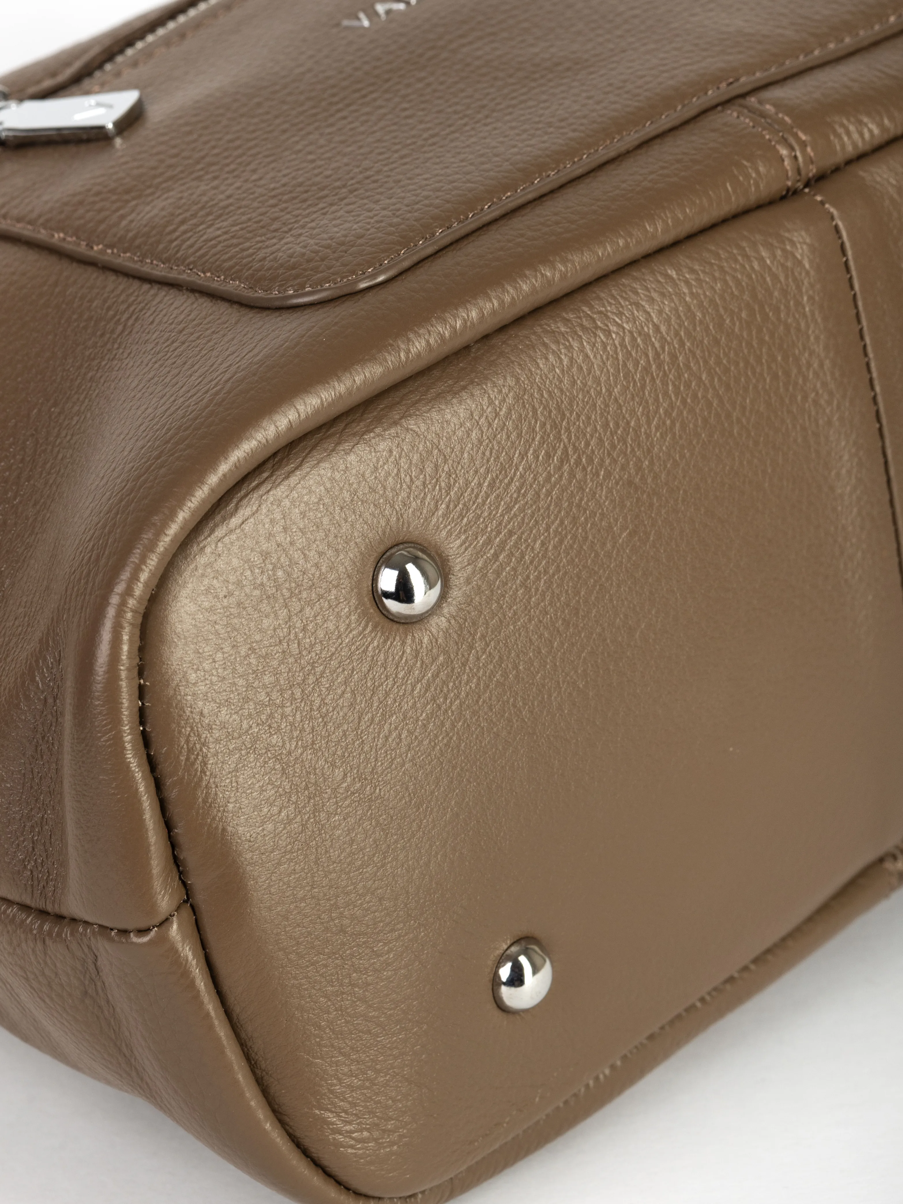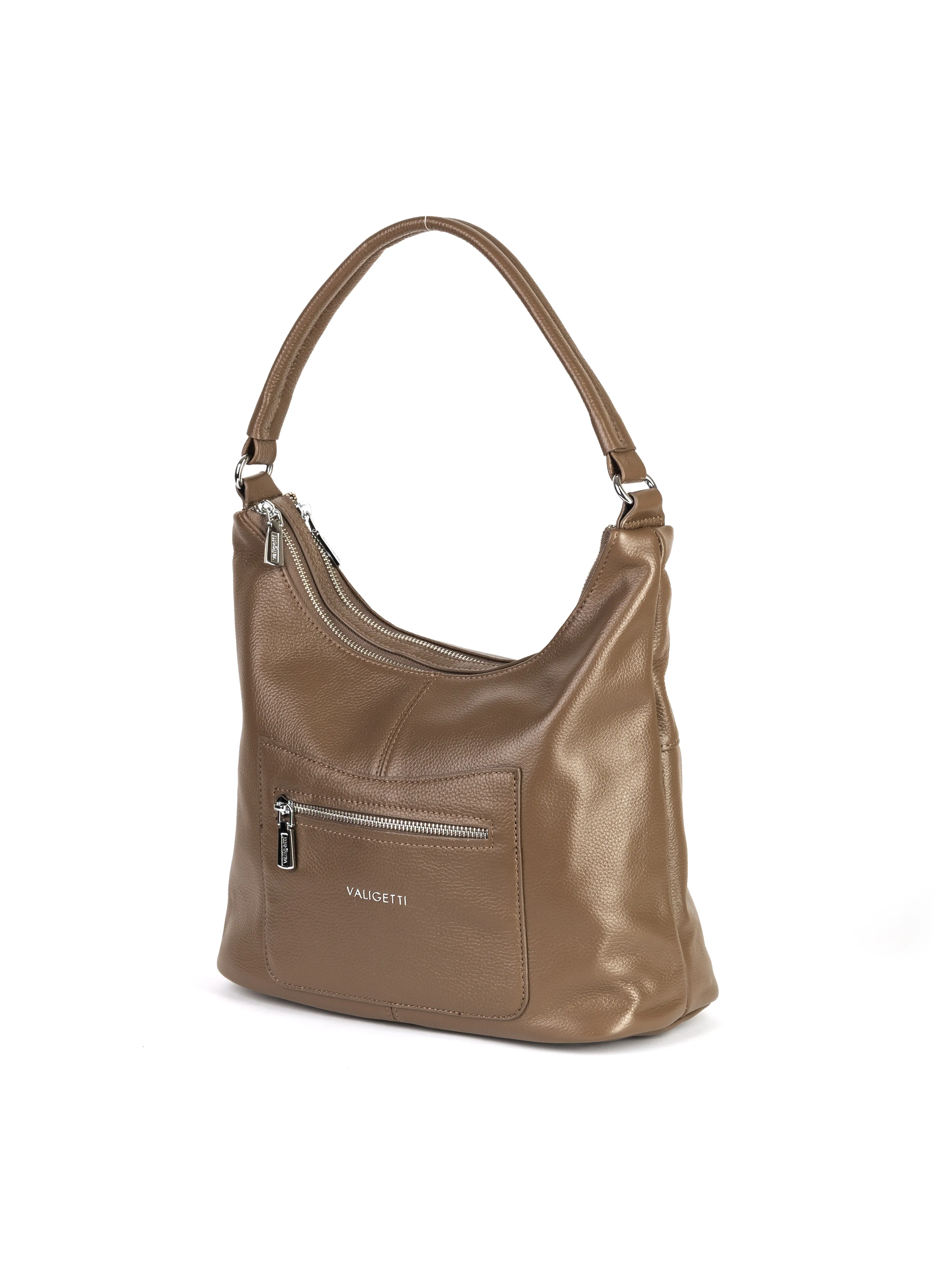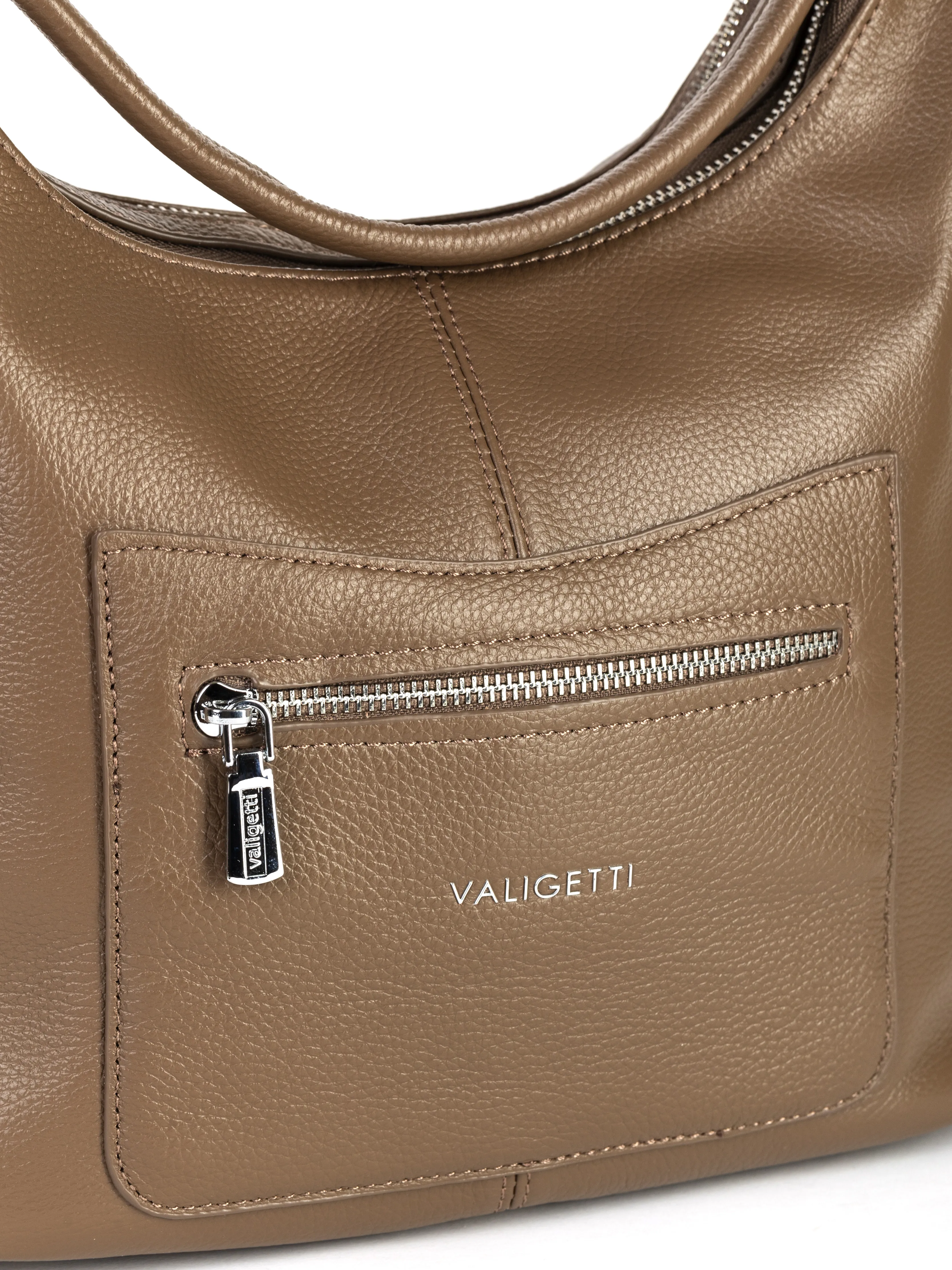 Женская сумка бренда Valigetti из натуральной кожи с зернистой структурой. Прошита фирменной подкладочной тканью. Имеет прицепную кожаную ручку. В наличии 2 отделения под молнией, внутри которых карман на молнии и кармашек для мелких вещей. На лицевой и задней сторонах по карману на молнии. Снизу есть металлические ножки, чтобы можно было поставить сумку на твердую поверхность