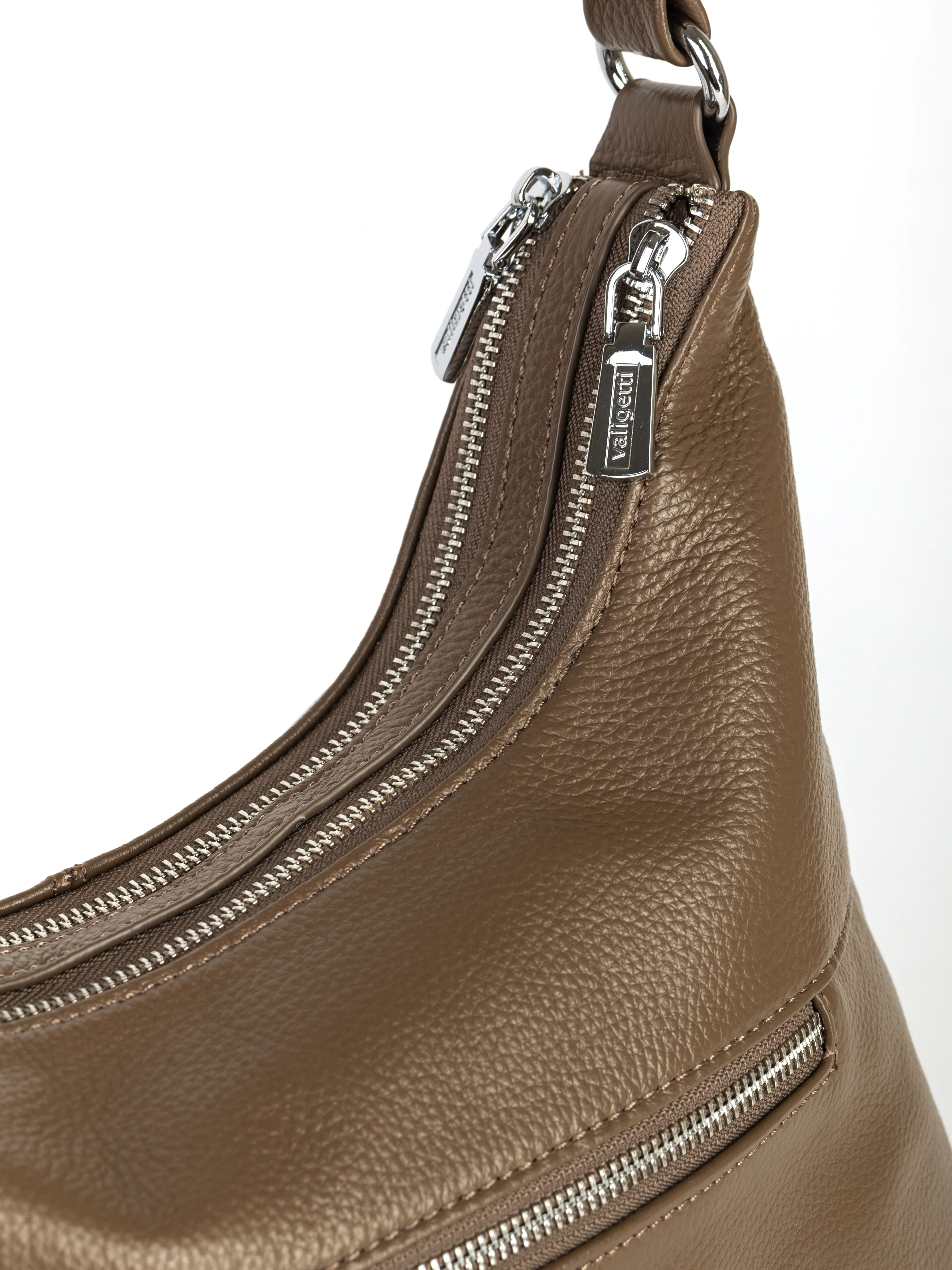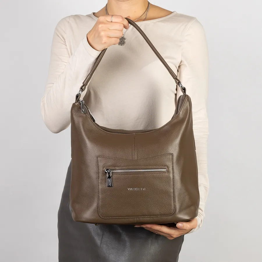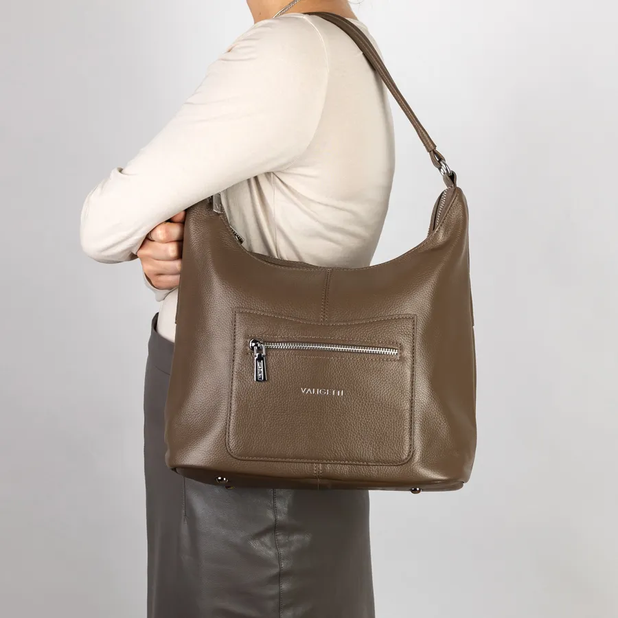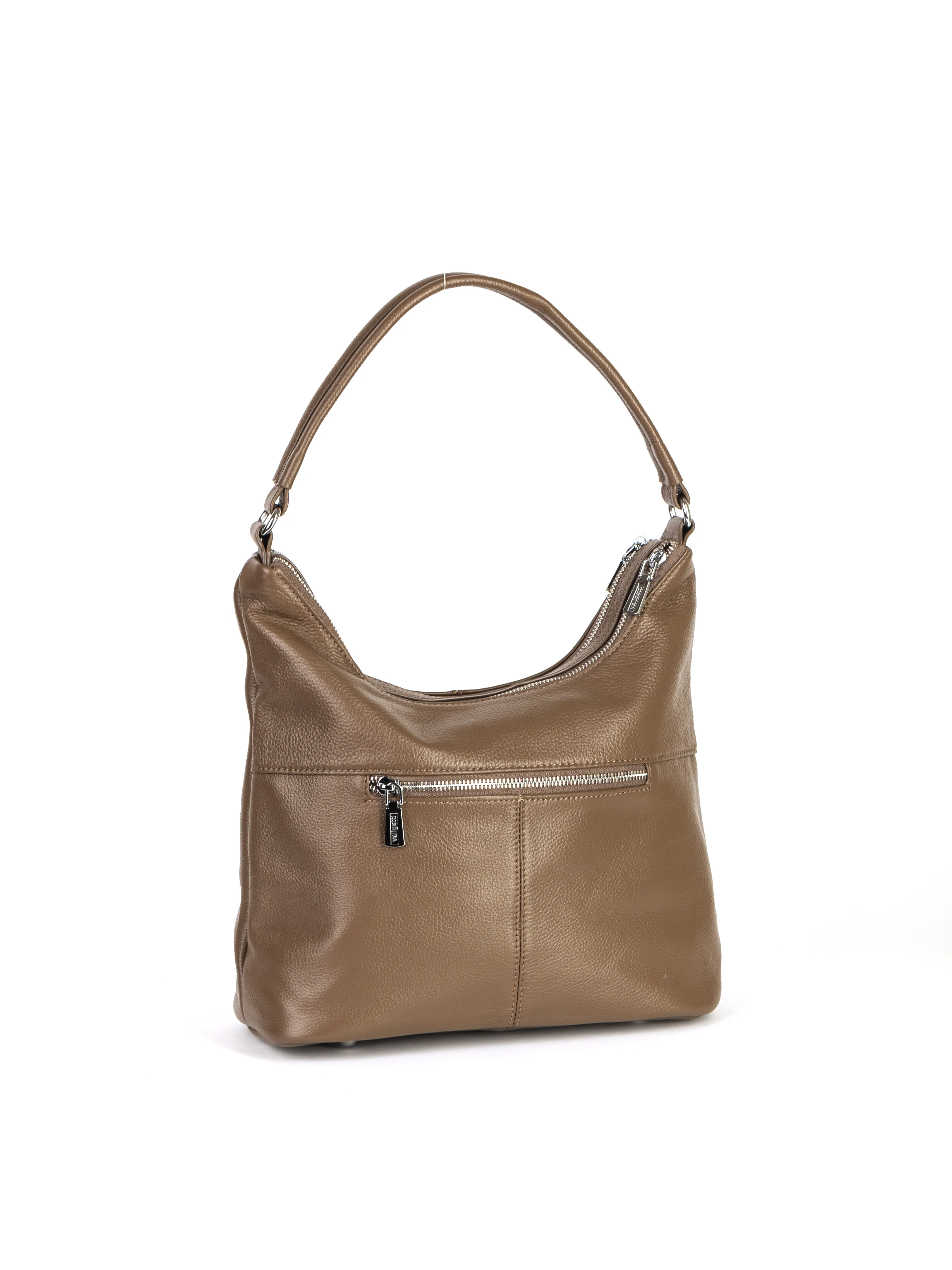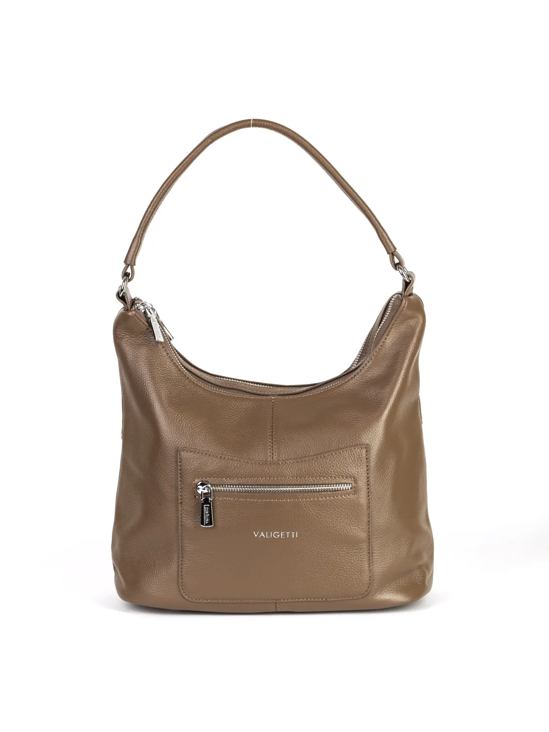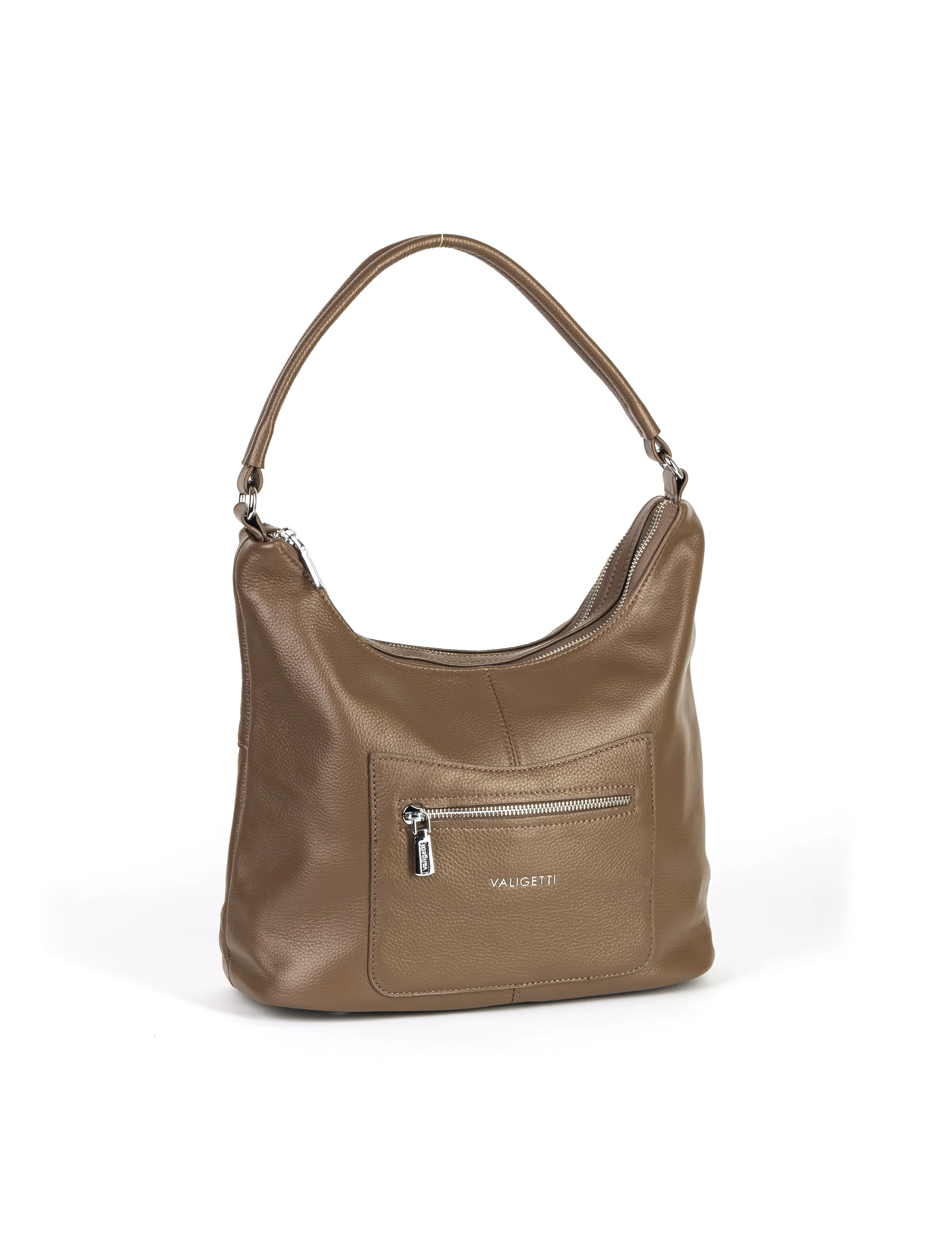 Женская сумка бренда Valigetti из натуральной кожи с зернистой структурой. Прошита фирменной подкладочной тканью. Имеет прицепную кожаную ручку. В наличии 2 отделения под молнией, внутри которых карман на молнии и кармашек для мелких вещей. На лицевой и задней сторонах по карману на молнии. Снизу есть металлические ножки, чтобы можно было поставить сумку на твердую поверхность