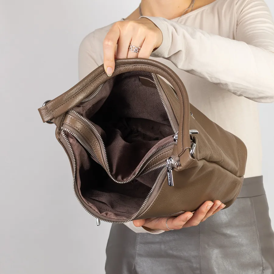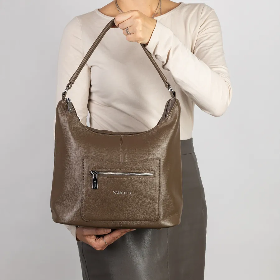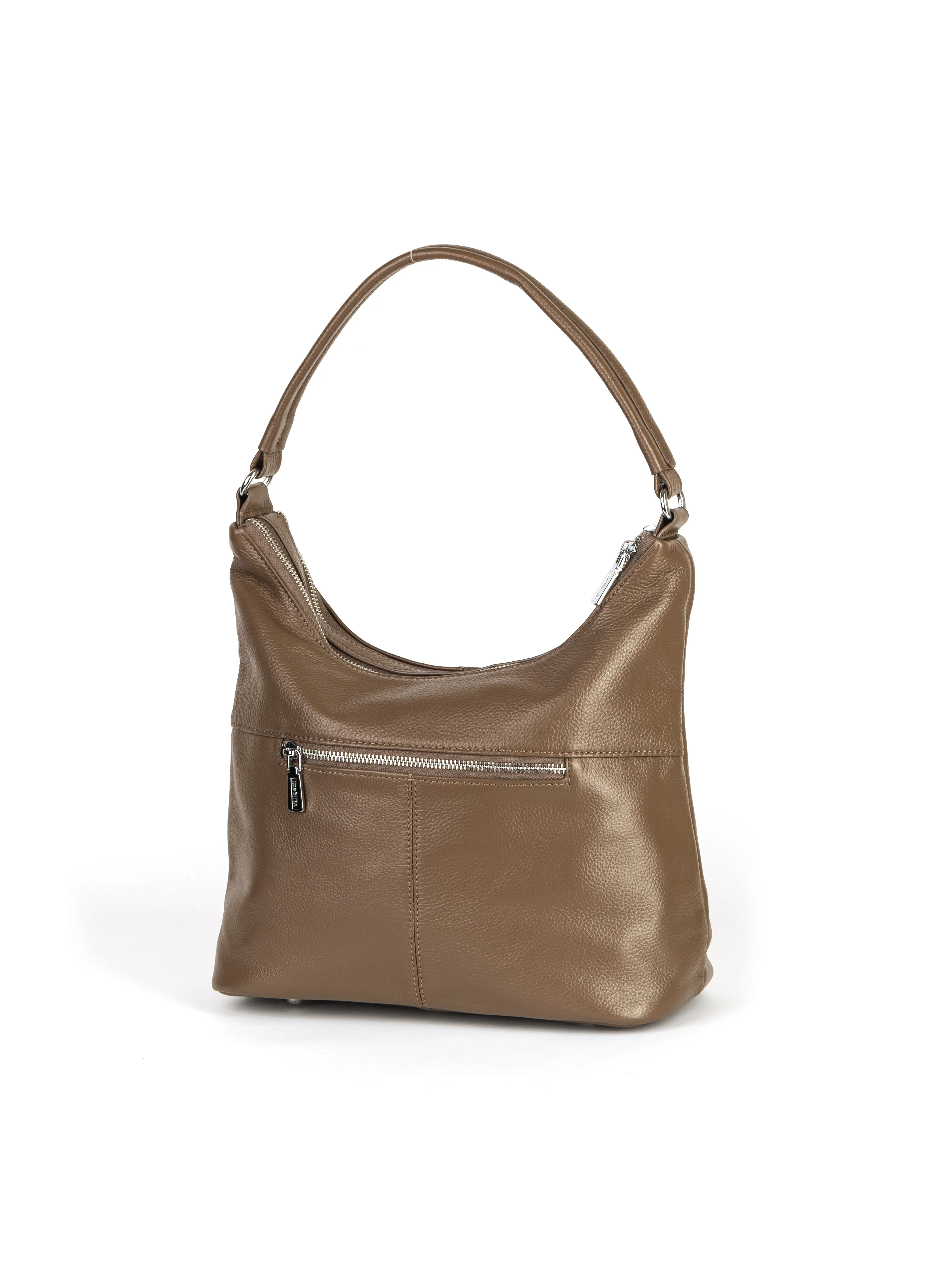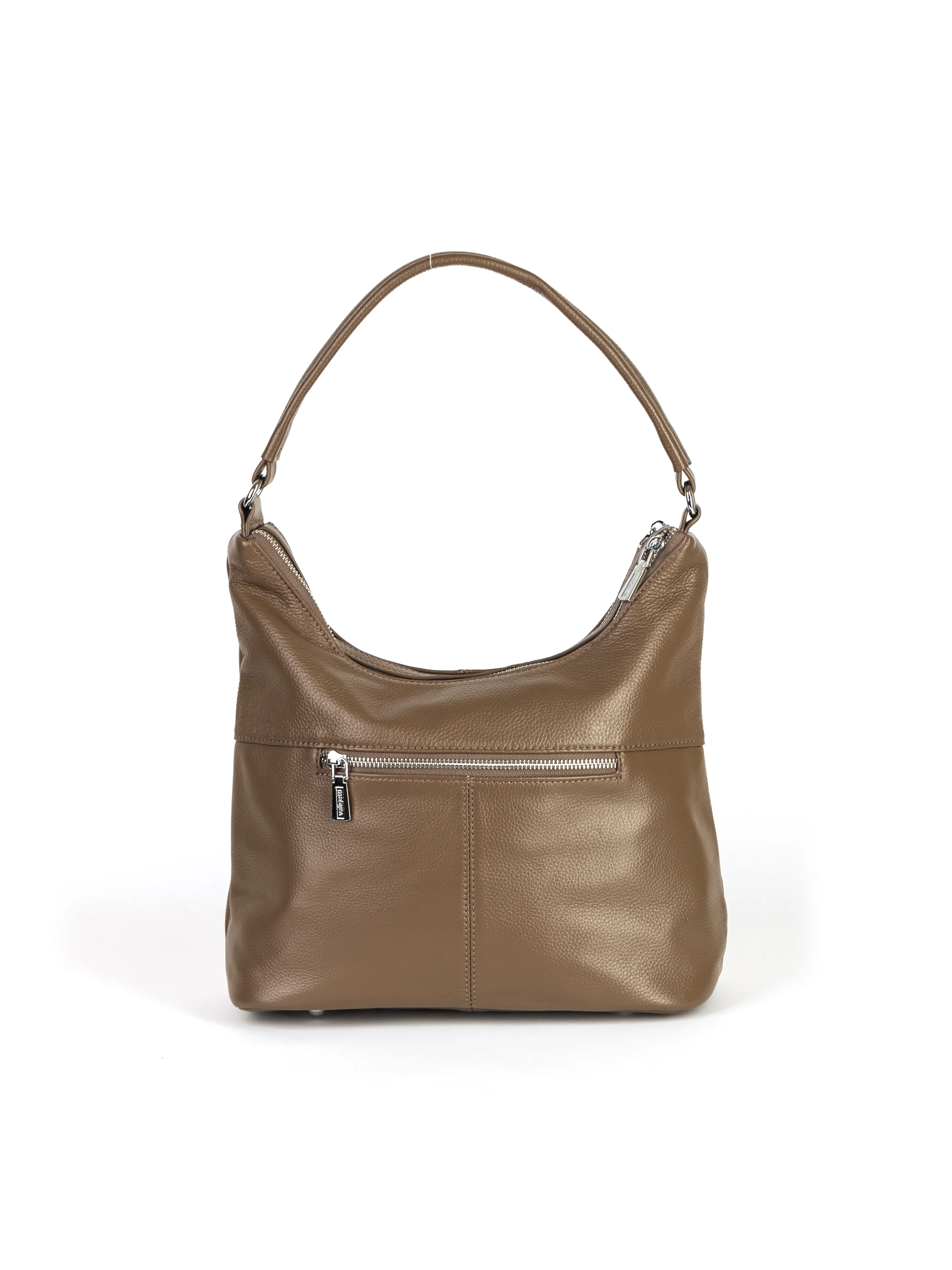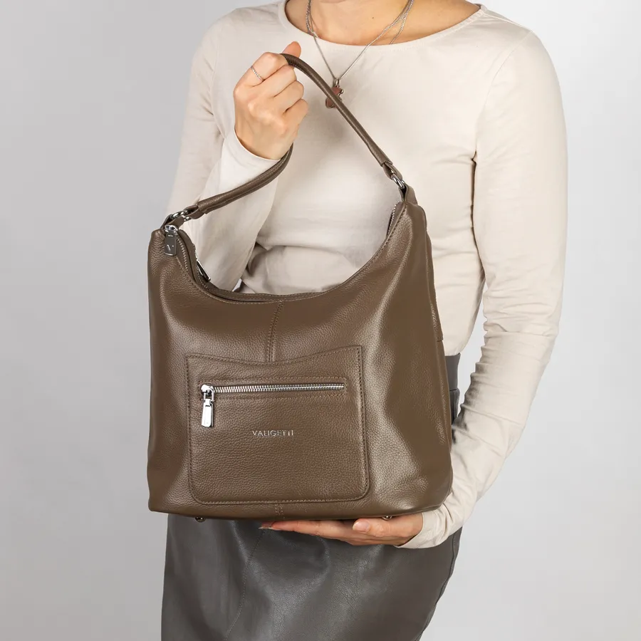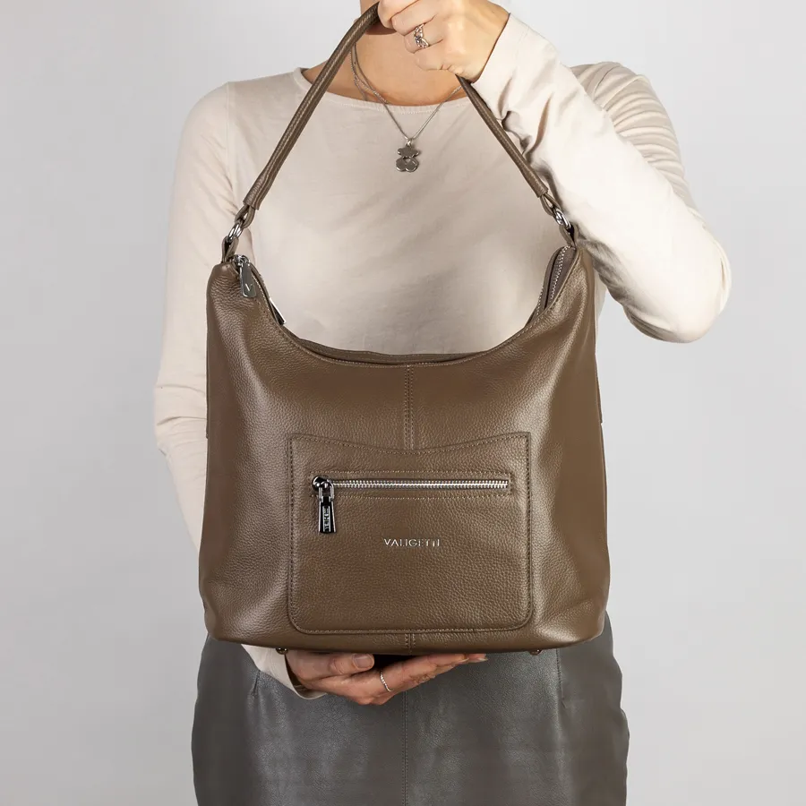 Женская сумка бренда Valigetti из натуральной кожи с зернистой структурой. Прошита фирменной подкладочной тканью. Имеет прицепную кожаную ручку. В наличии 2 отделения под молнией, внутри которых карман на молнии и кармашек для мелких вещей. На лицевой и задней сторонах по карману на молнии. Снизу есть металлические ножки, чтобы можно было поставить сумку на твердую поверхность
