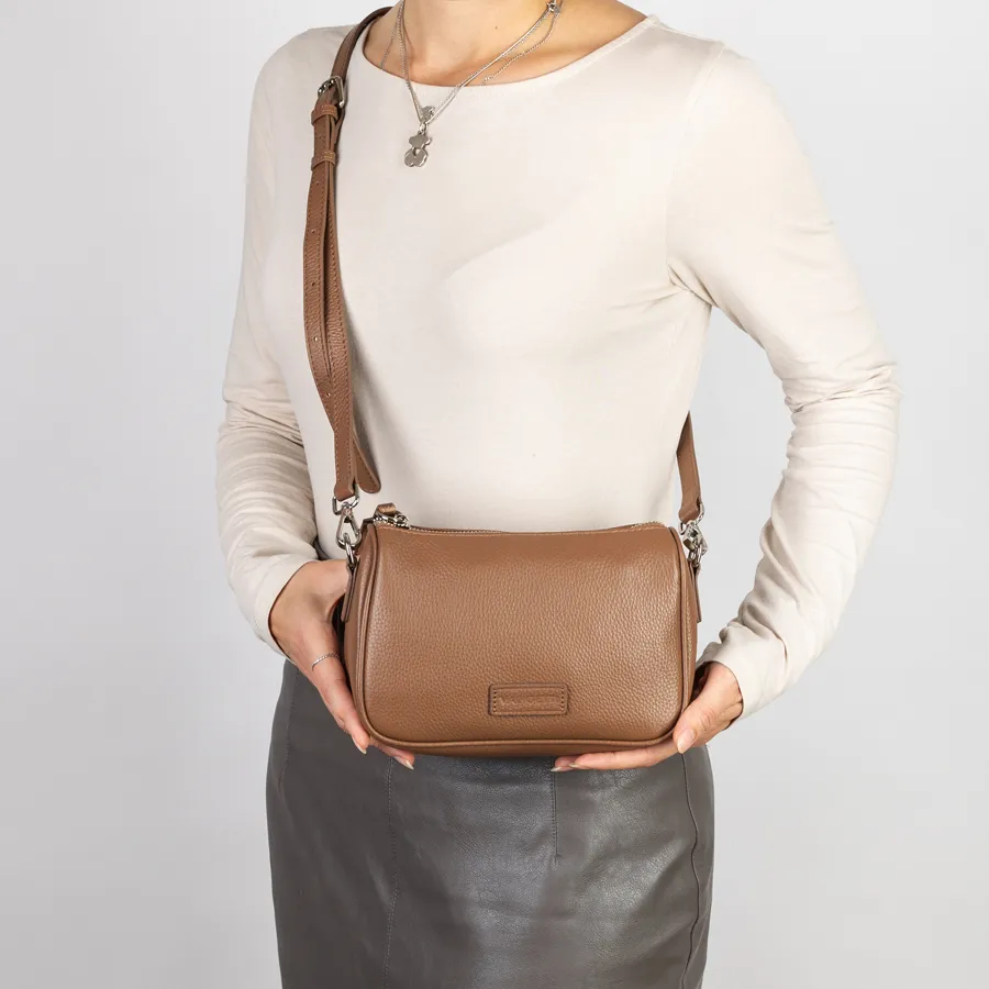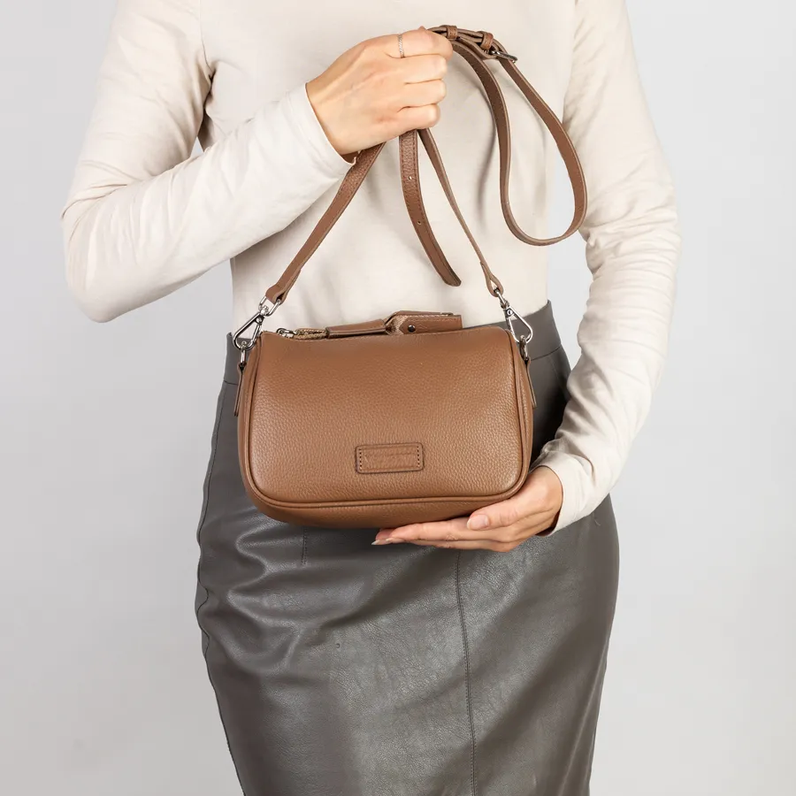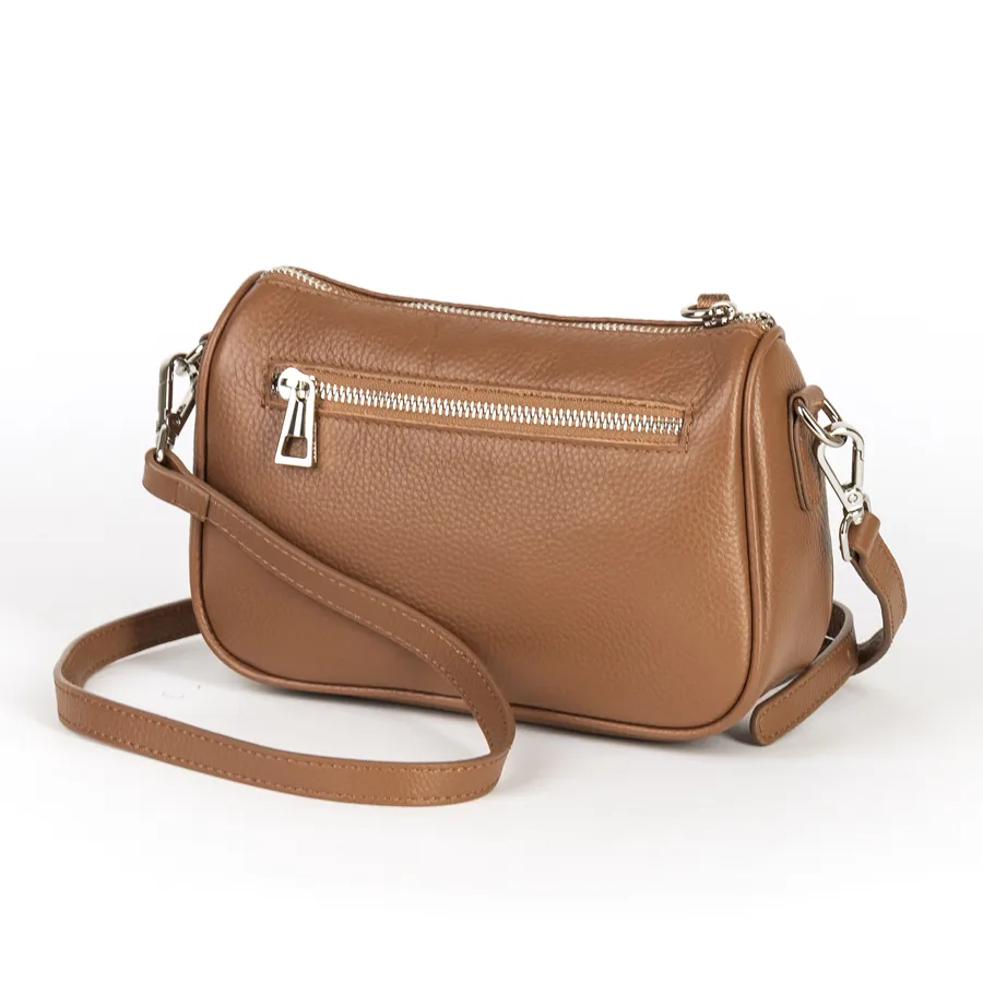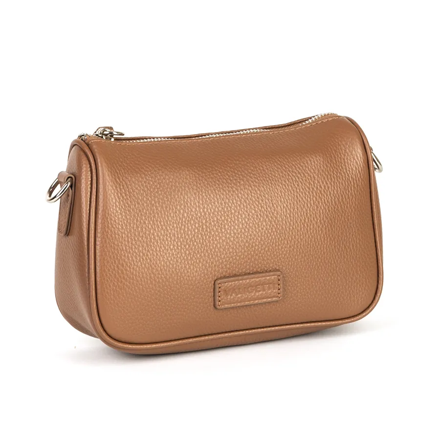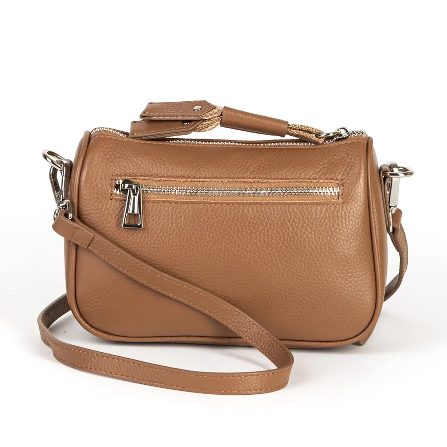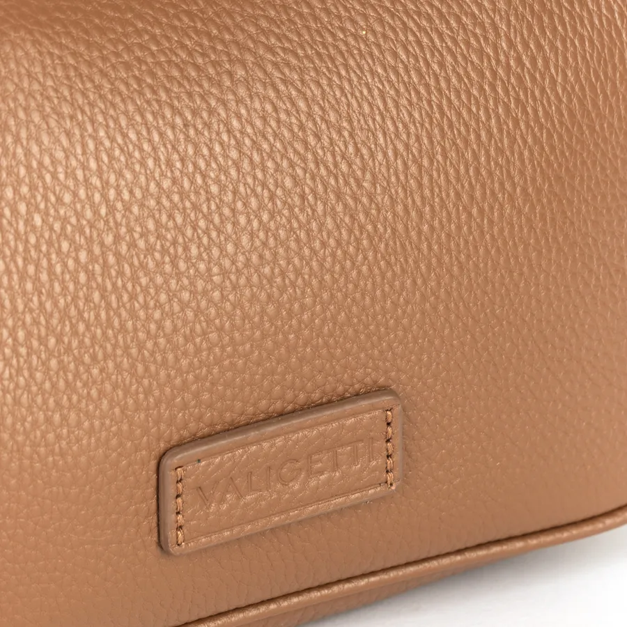 Женская сумка бренда Valigetti из натуральной кожи с зернистой структурой. Прошита фирменной подкладочной тканью. Имеет прицепную кожаную ручку на карабинах. Сумка защищена металлической молнией со стильным кожаным хвостиком на замке для удобства открытия. Внутри одно отделение и средник на молнии, отделяющий кармашек для мелких вещей. На задней стороне есть карман на молнии