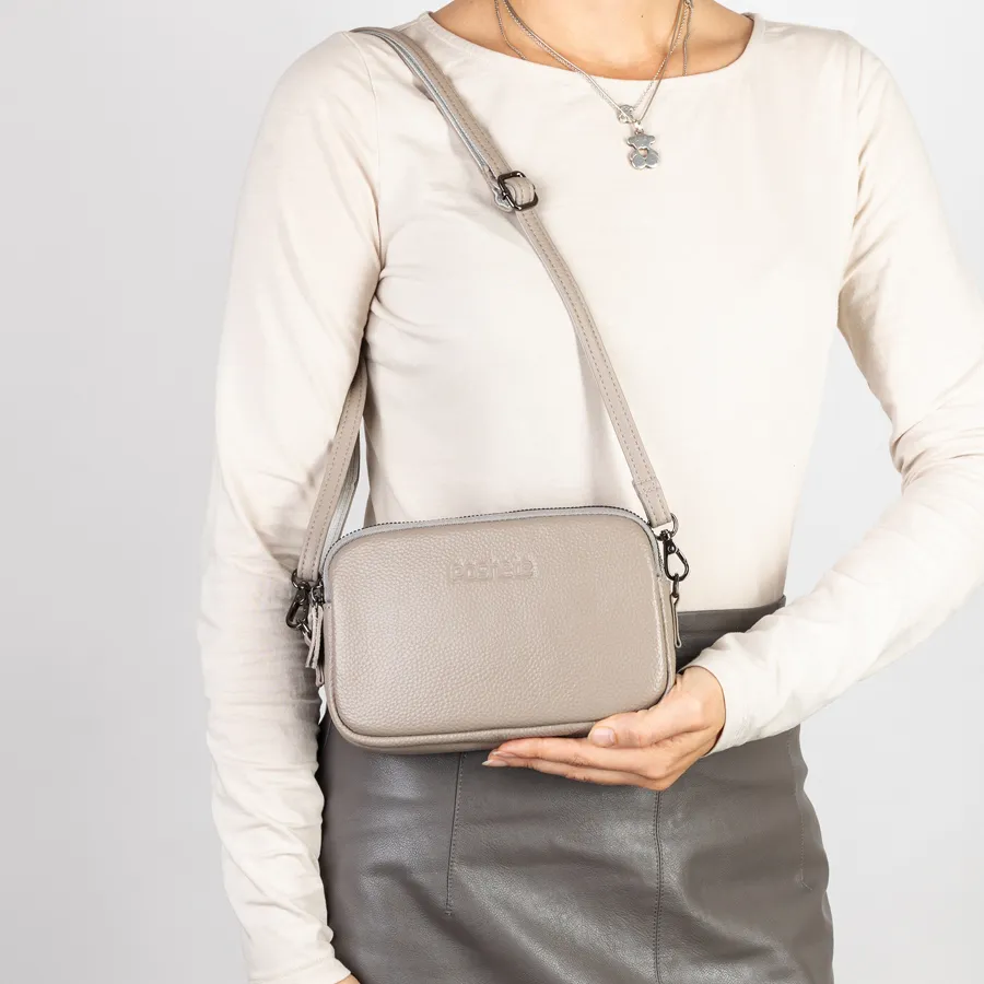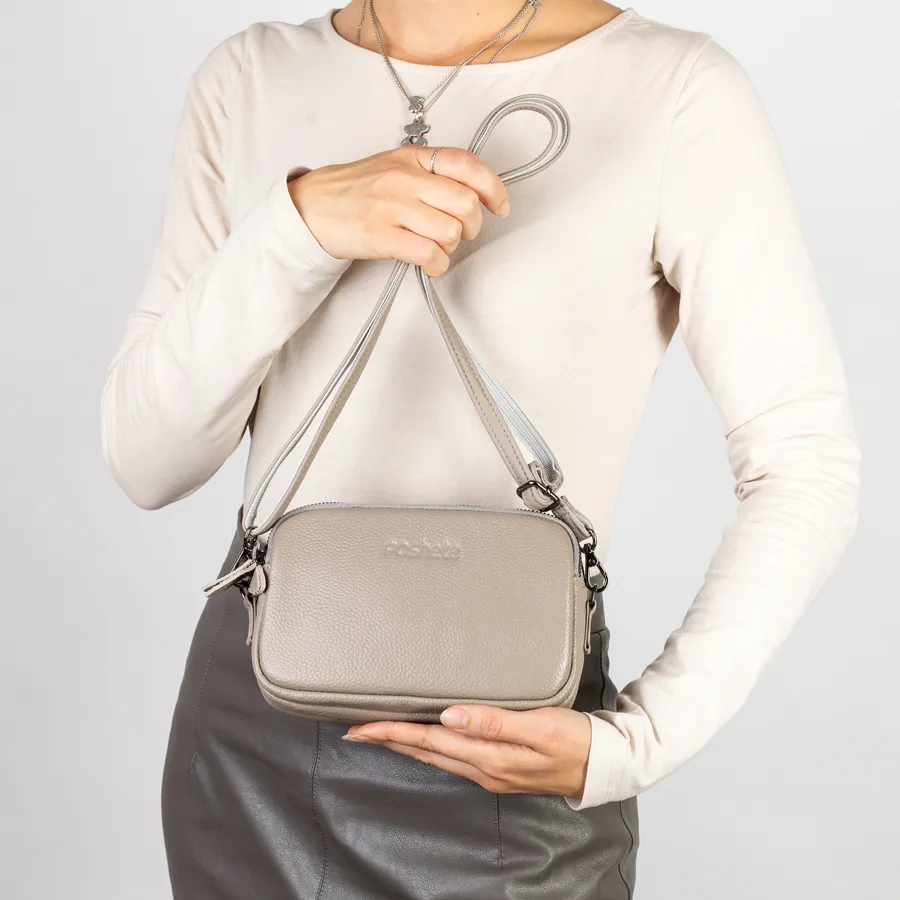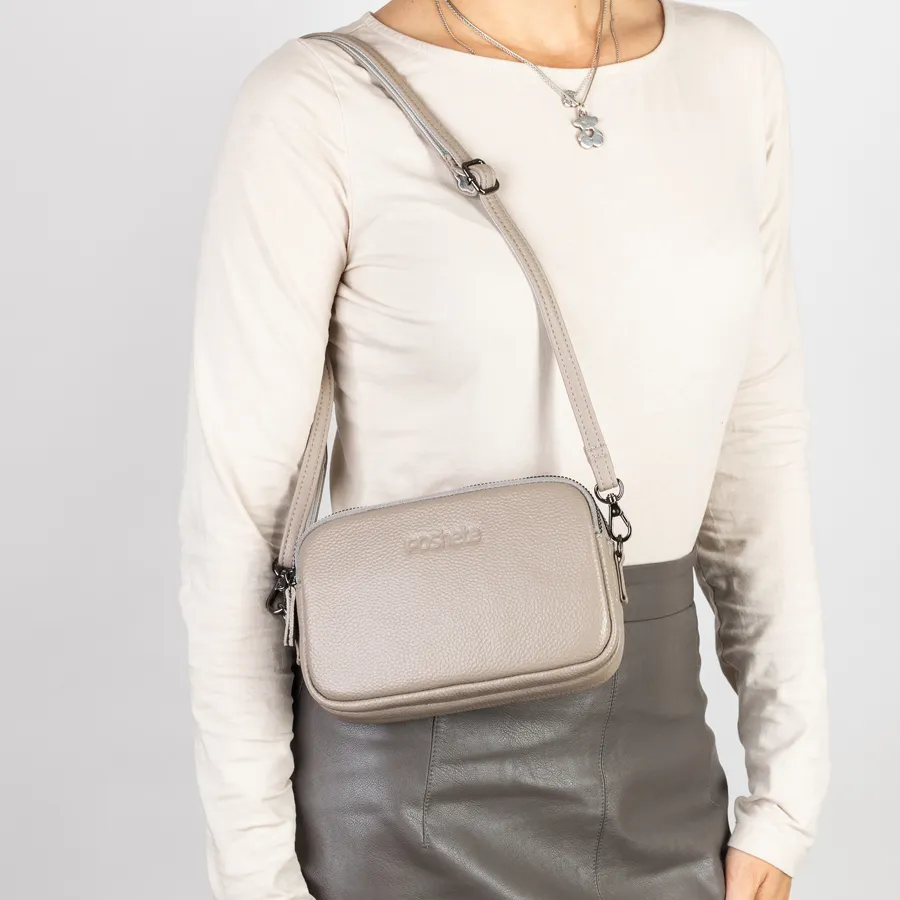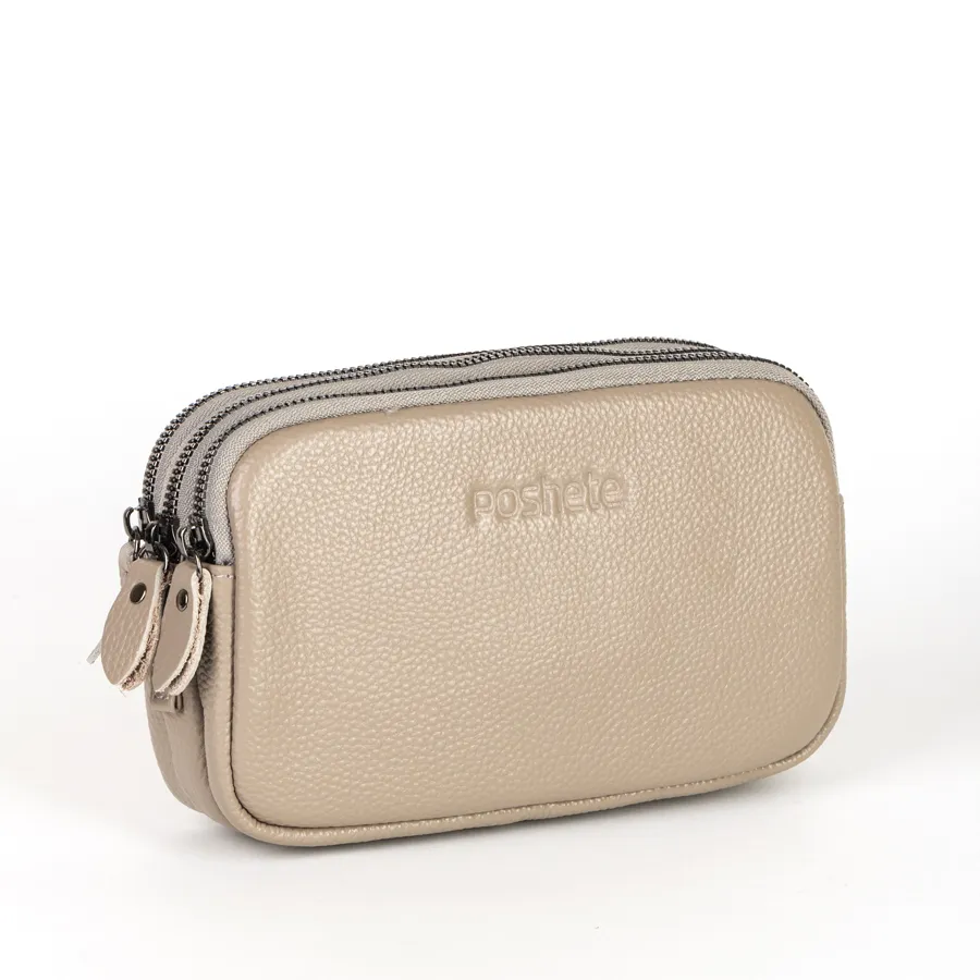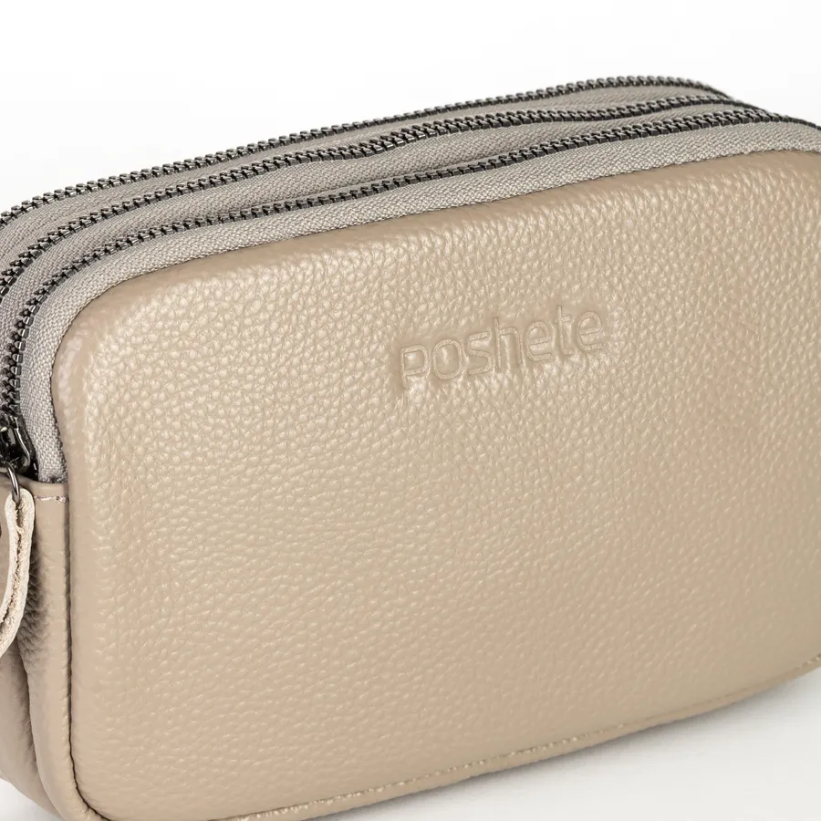 Женская сумка бренда Poshette из натуральной кожи с зернистой структурой. Прошита фирменной подкладочной тканью. Имеет прицепную кожаную ручку на карабинах. Внутри 3 отделения