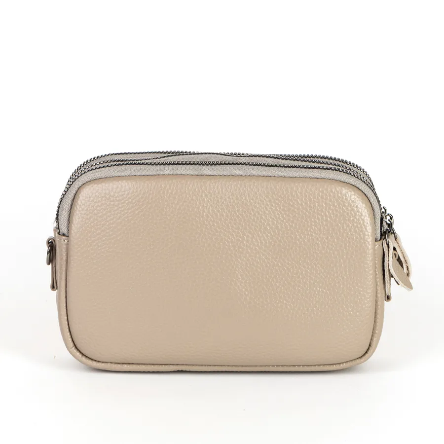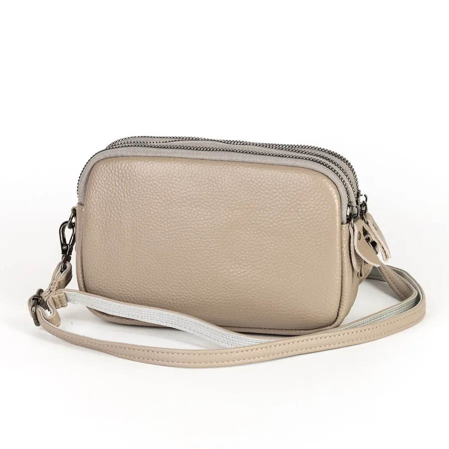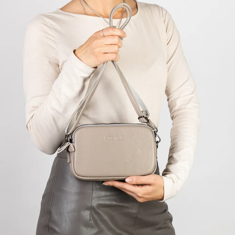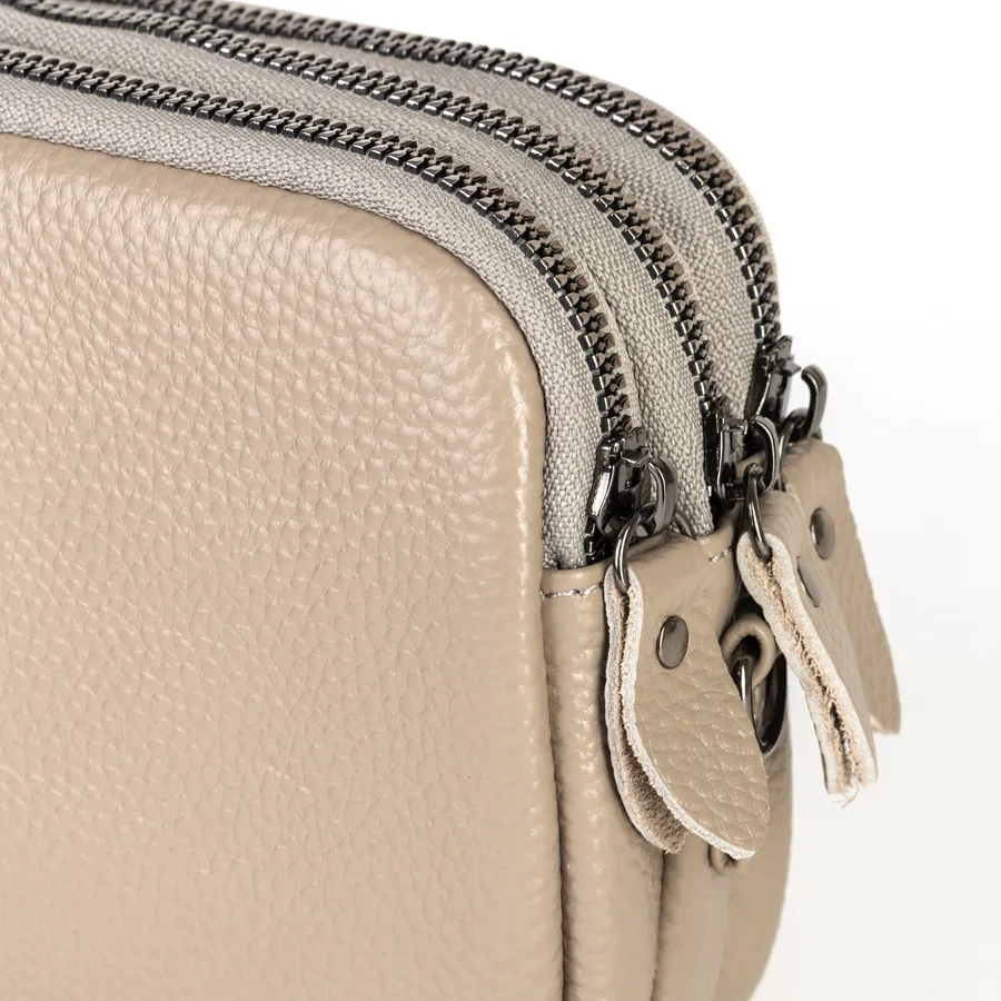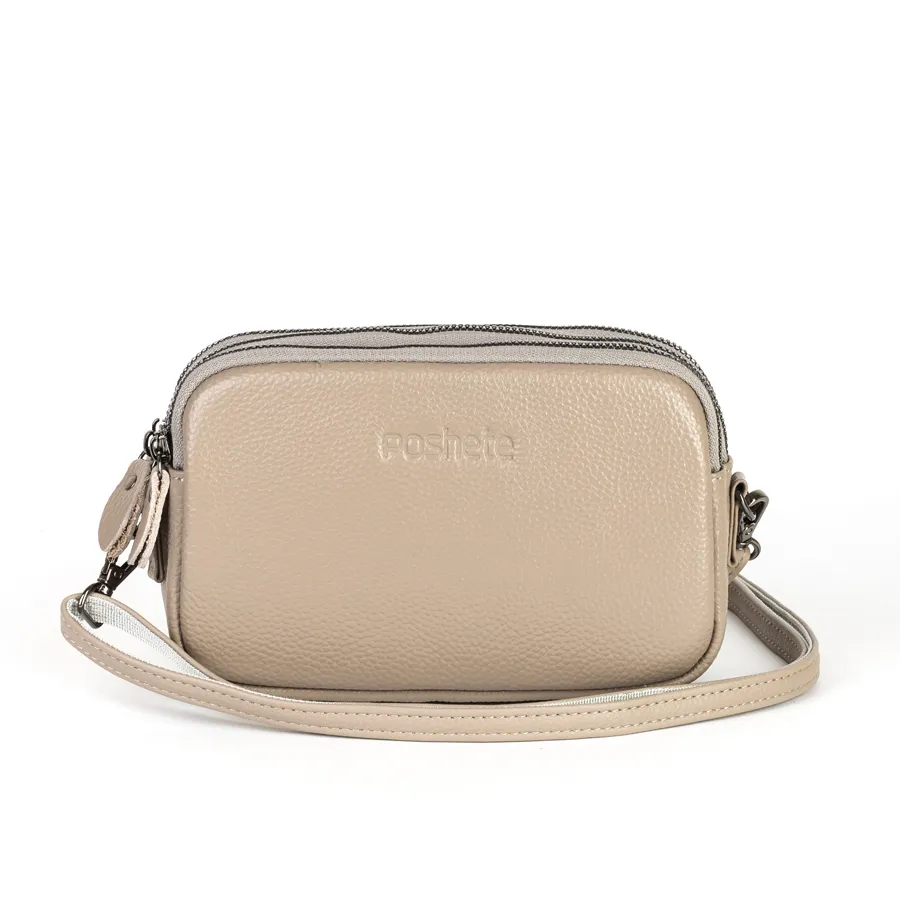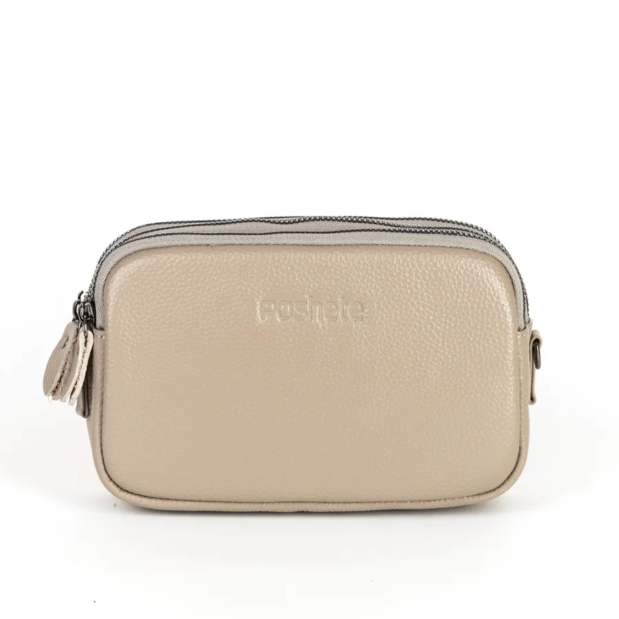 Женская сумка бренда Poshette из натуральной кожи с зернистой структурой. Прошита фирменной подкладочной тканью. Имеет прицепную кожаную ручку на карабинах. Внутри 3 отделения