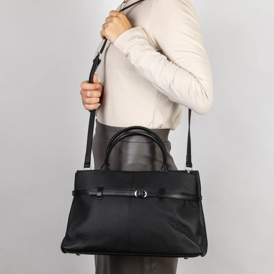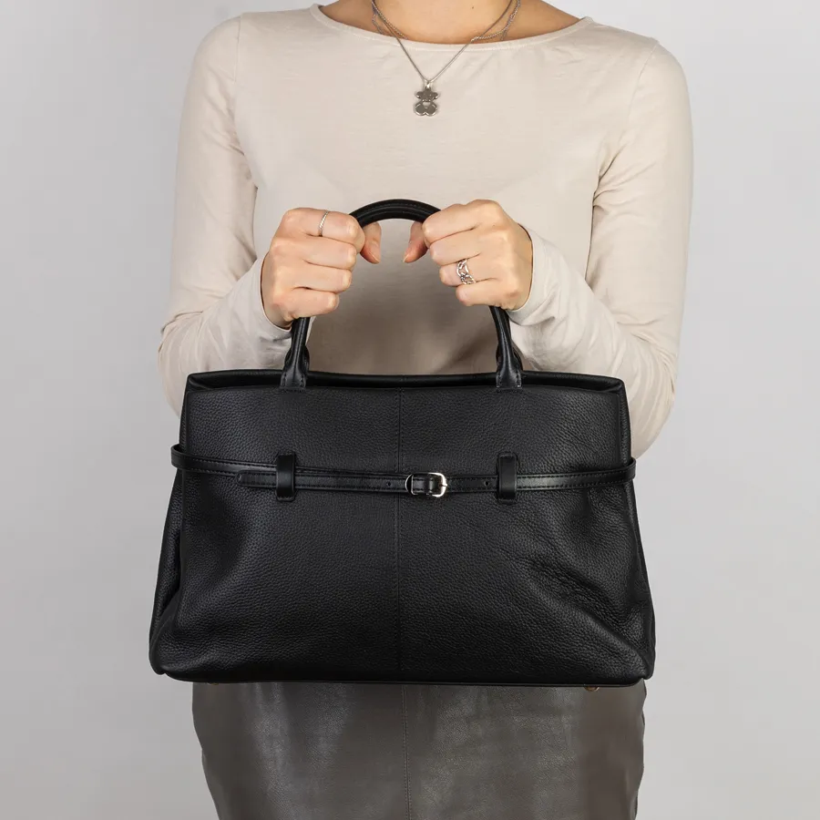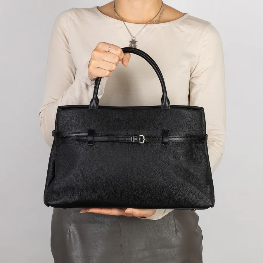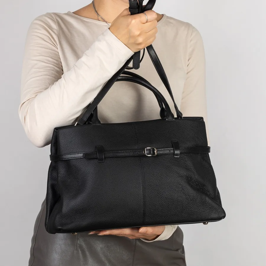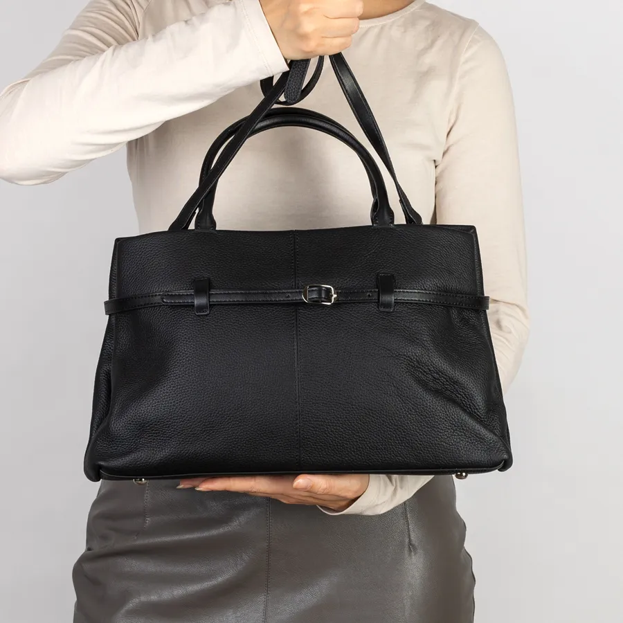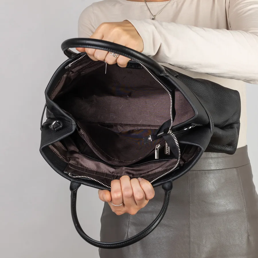 Сумка от торговой марки Poshetei из натуральной кожи зернистой структуры кожи черного цвета. Держит форму. Есть 2 вшитые кожаные ручки. Основное отделение на металлической молнии. Прошита фирменной подкладочной тканью.. Внутри 2 отделения, средник на молнии, карман на молнии и кармашек для мелких вещей. На внешней стороне вокруг сумки протянут ремень, регулирующий объем сумки. В комплект входит прицепной плечевой ремень. Снизу есть металлические ножки, чтобы можно было поставить сумку на твердую поверхность