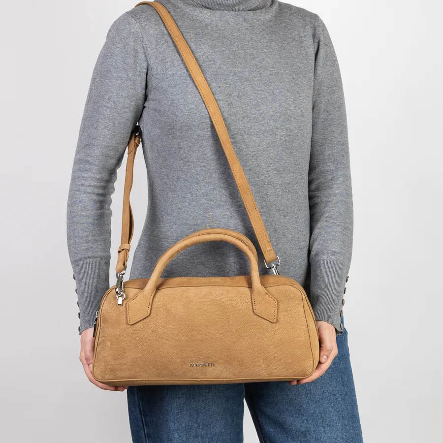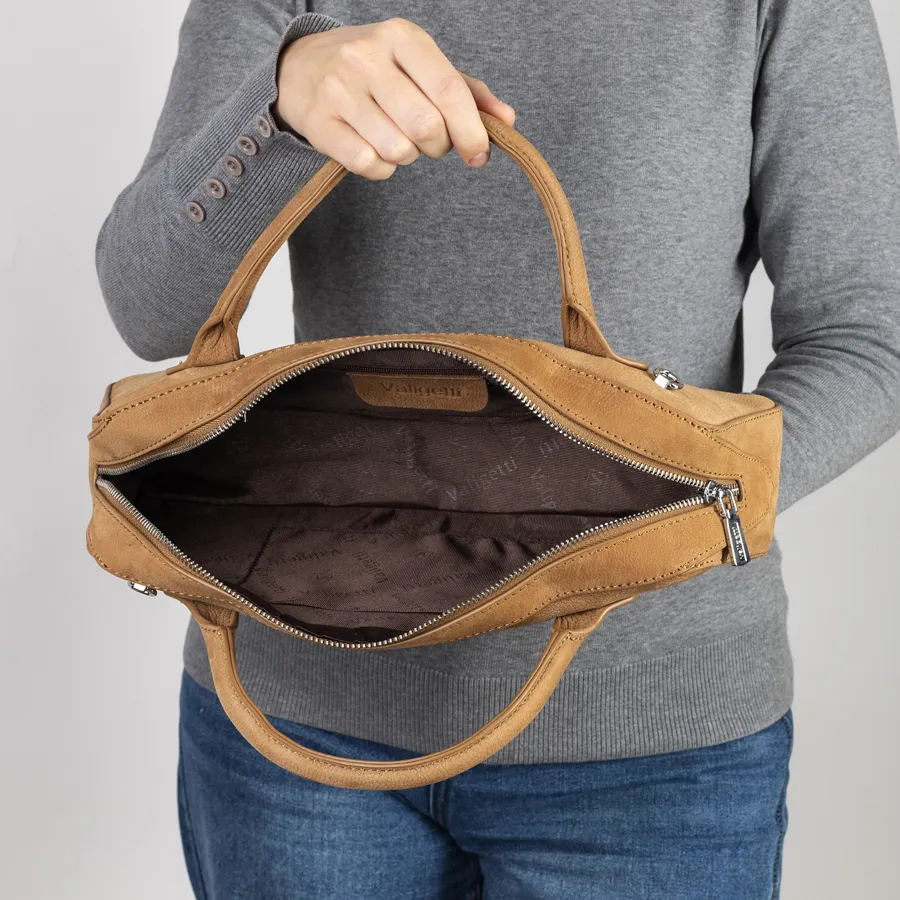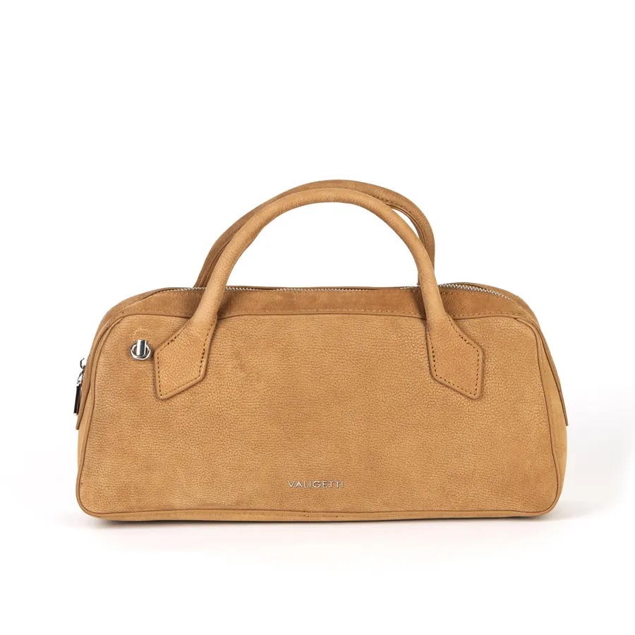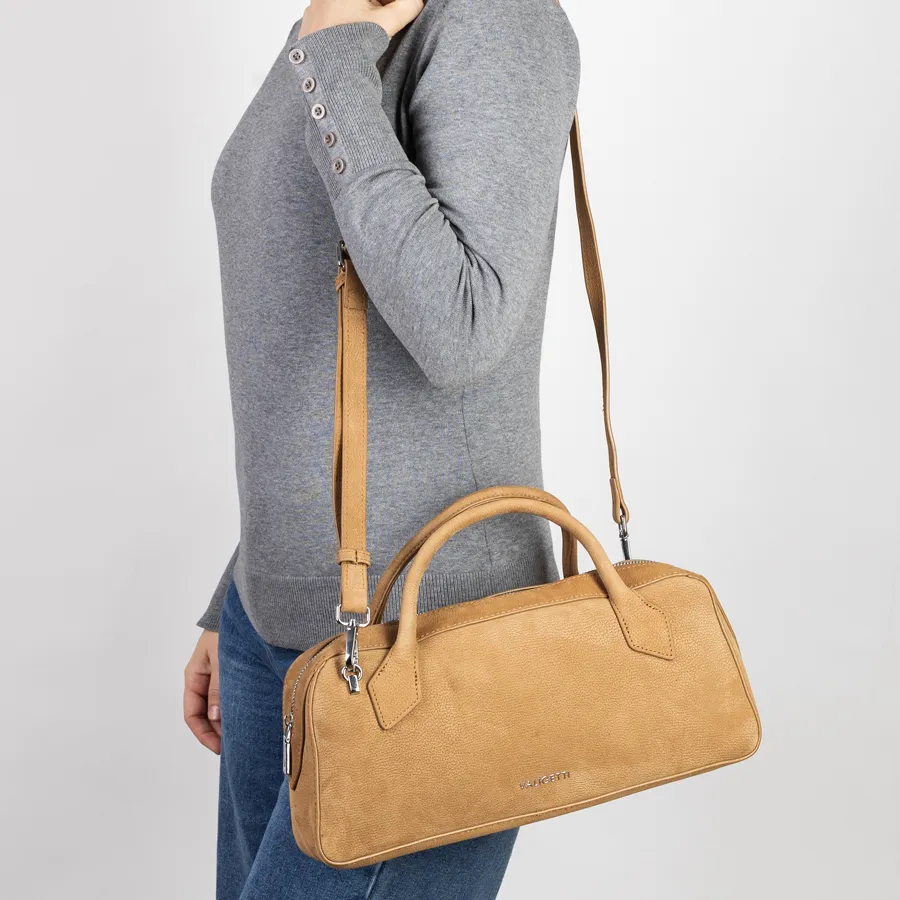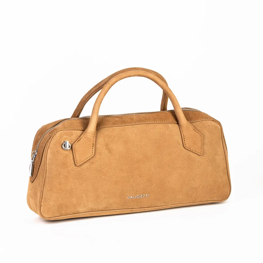 Стильная женская сумка-багет фирмы Valigetti из натуральной кожи мелко зернистой структуры. Прошита фирменной подкладочной тканью. Имеет вшитые кожаные ручки. Внутри одно под молнией, карман на молнии и кармашек для мелких вещей. В комплект входит прицепной плечевой ремень