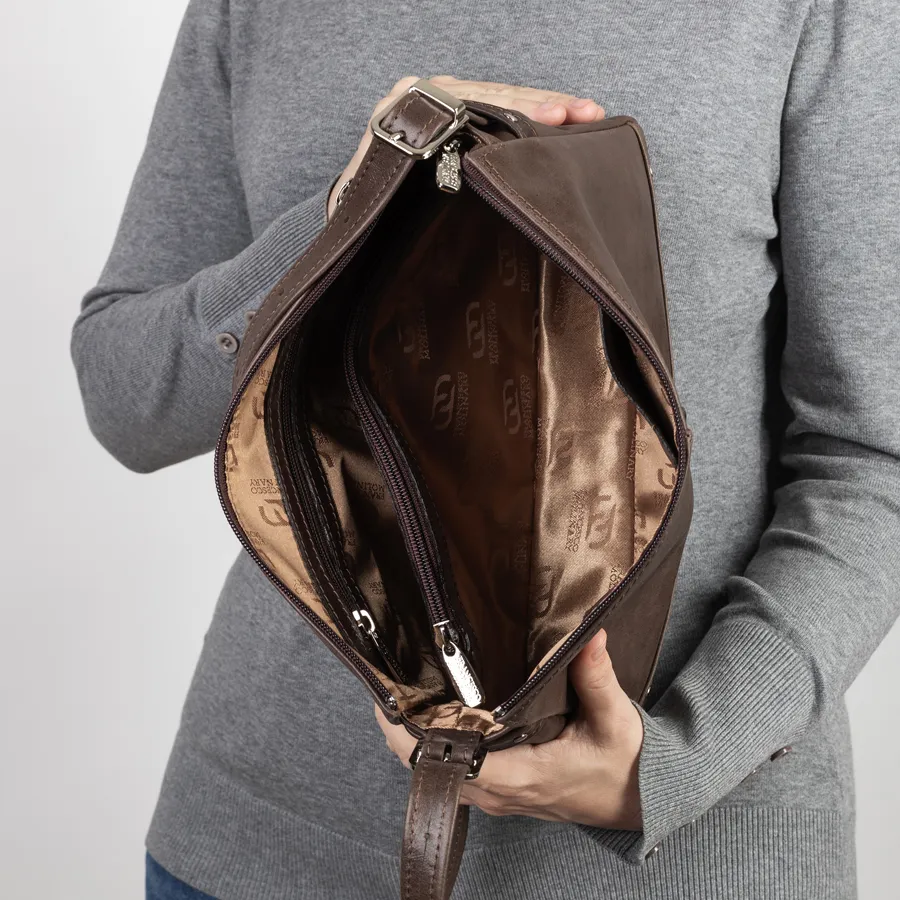 Сумка в деловом стиле от торговой марки Francesco Molinary выполнена из натуральной кожи коричневого цвета. Модель с одной удлиненной ручкой. Одно отделение с фирменной подкладкой. Основное отделение на молнии, внутри: карман на молнии. На задней стороне – карман на молнии.