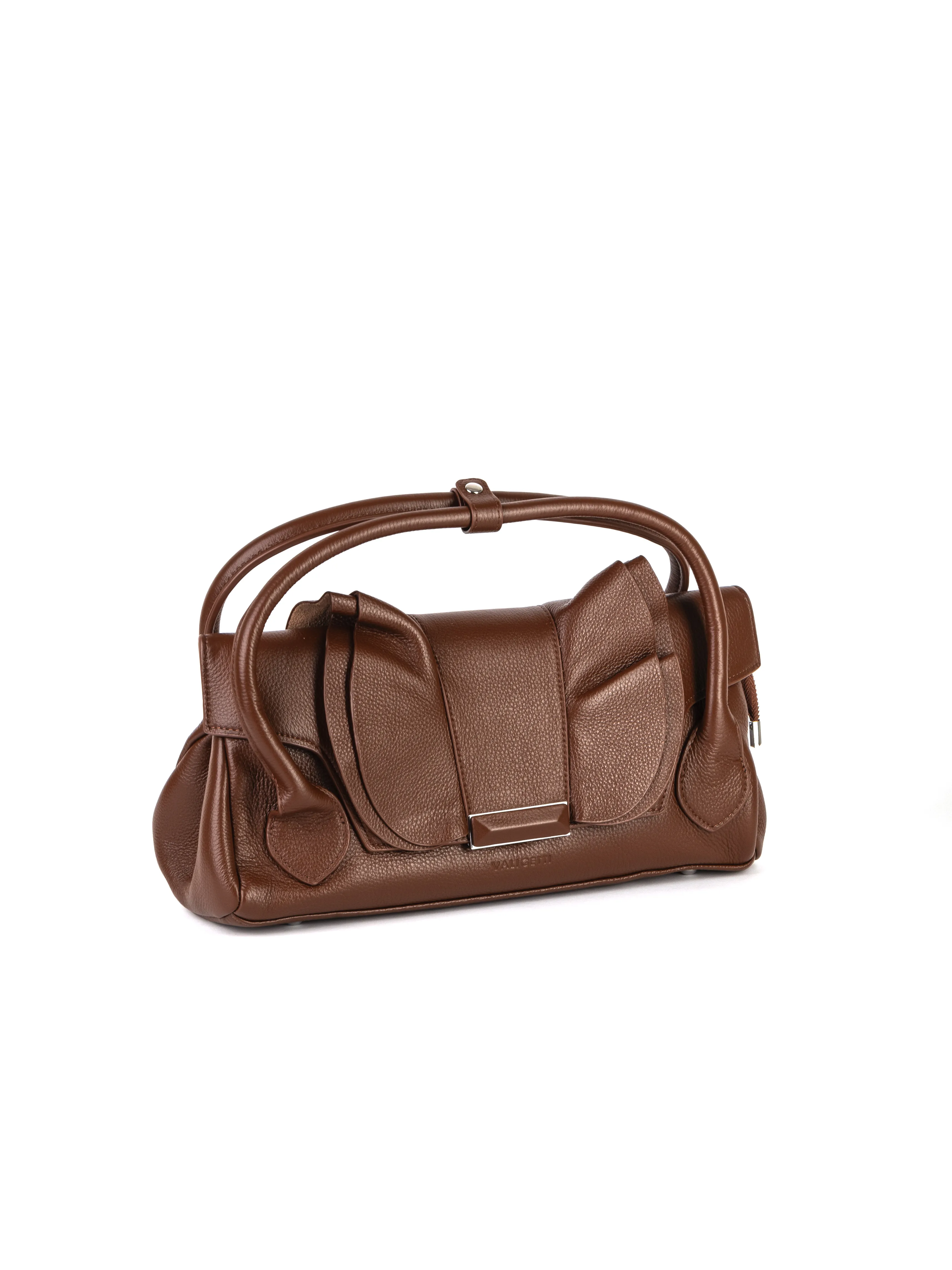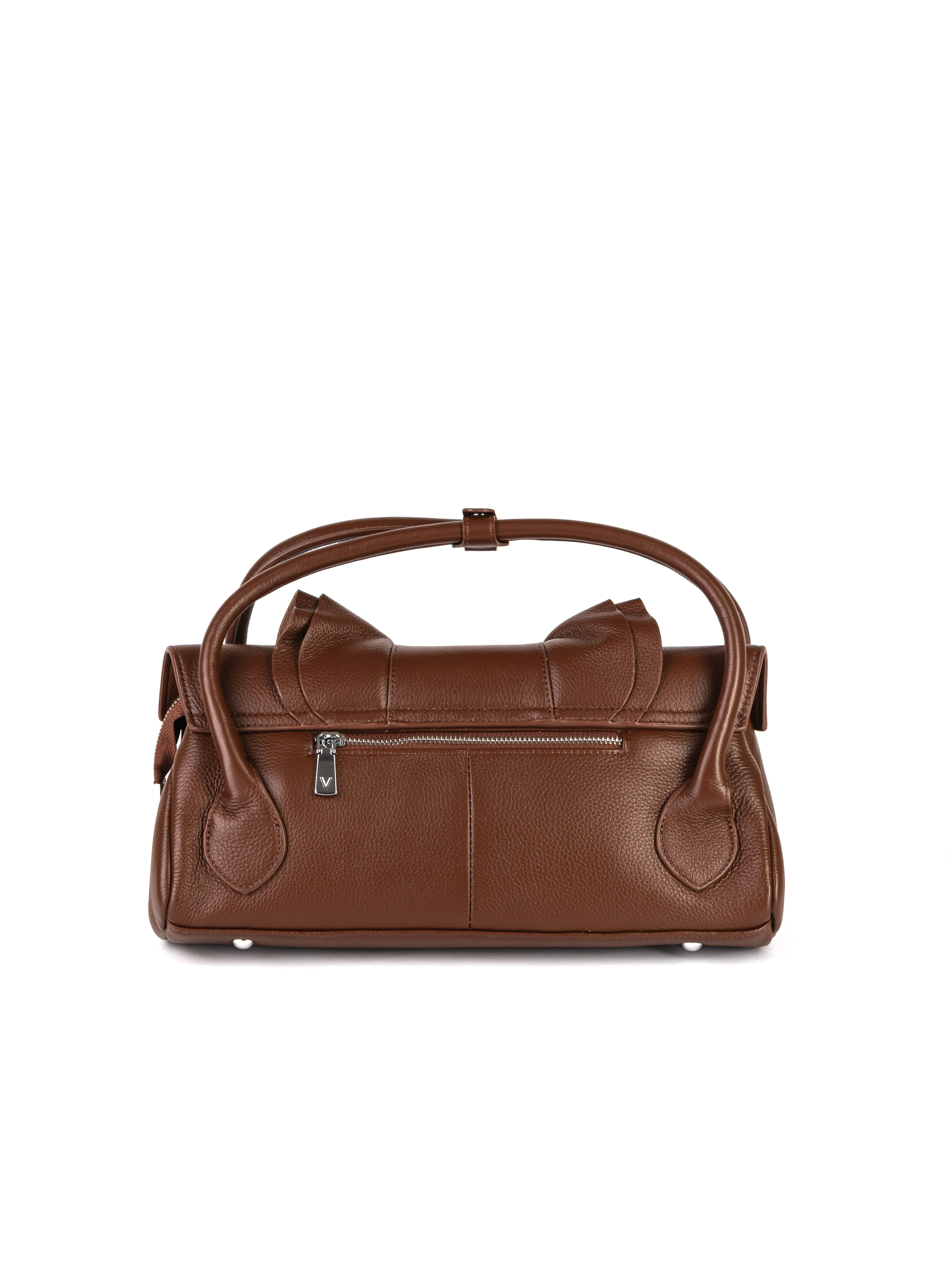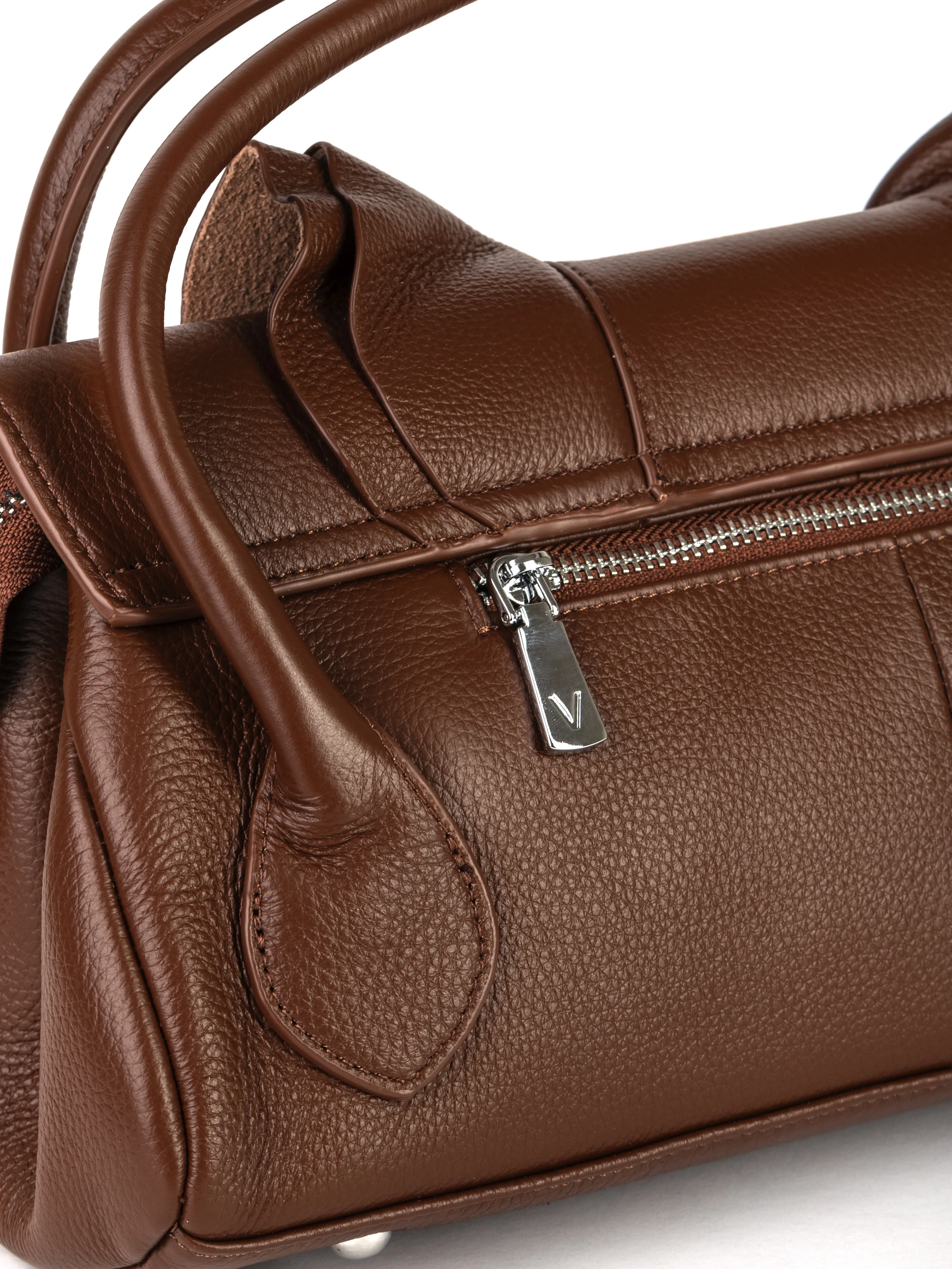 Сумка кросс-боди от торговой марки Valigetti из натуральной зернистой кожи коричнево цвета. Компактная модель, отделение на молнии. Внутри: фирменная подкладка, карман на молнии, накладной карман. На задней стороне – карман на молнии.