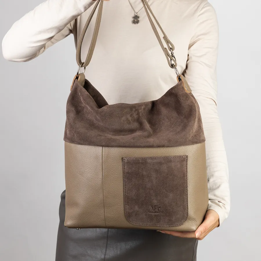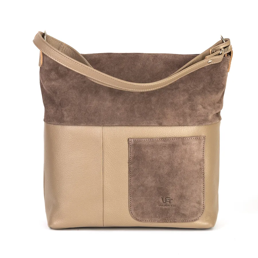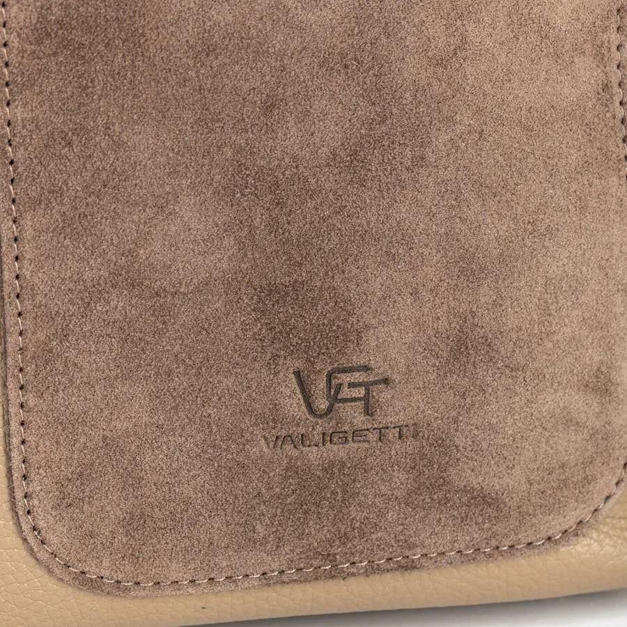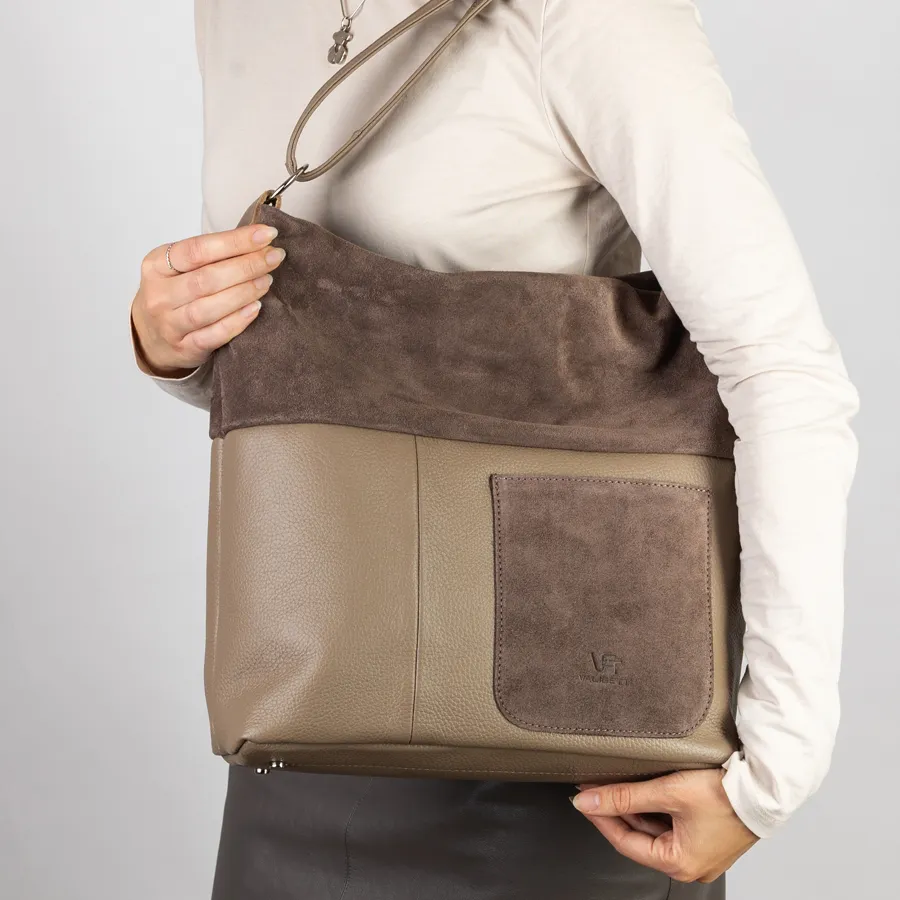 Сумка от торговой марки Valigetti из натуральной кожи светло-серого цвета. Модель с длинной ручкой. Отделение на молнии. Внутри: фирменная подкладка, карман и средник на молнии, накладной карман. С лицевой стороны один накладной карман без застежки. На задней стороне - карман на молнии. Дно оснащено металлическими ножками для защиты от износа.