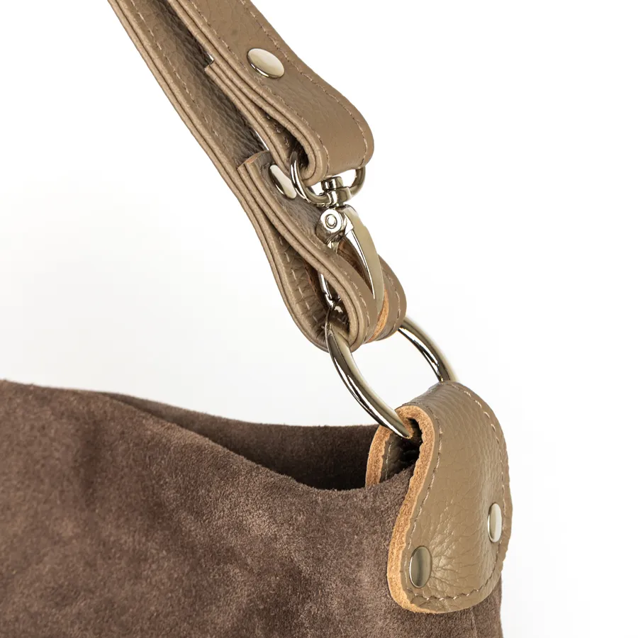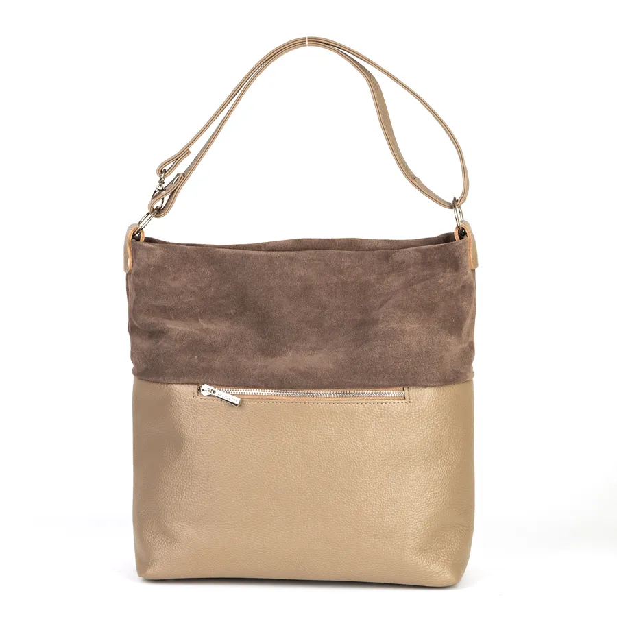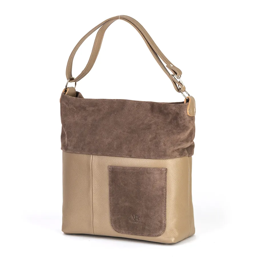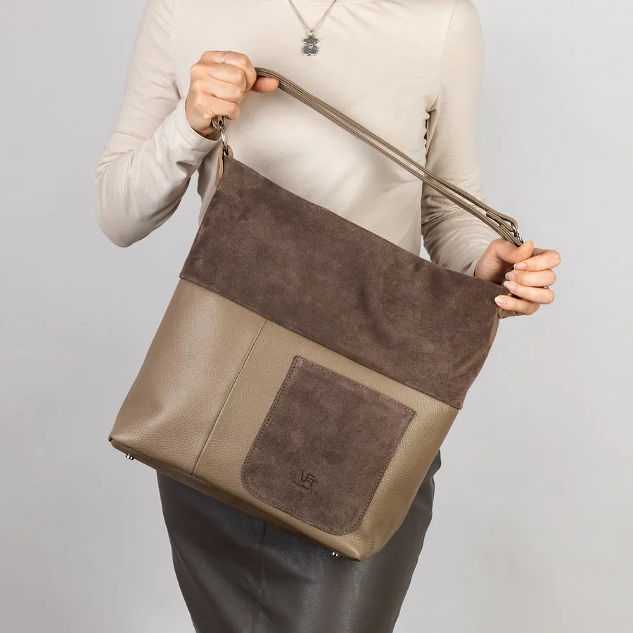 Сумка от торговой марки Valigetti из натуральной кожи светло-серого цвета. Модель с длинной ручкой. Отделение на молнии. Внутри: фирменная подкладка, карман и средник на молнии, накладной карман. С лицевой стороны один накладной карман без застежки. На задней стороне - карман на молнии. Дно оснащено металлическими ножками для защиты от износа.