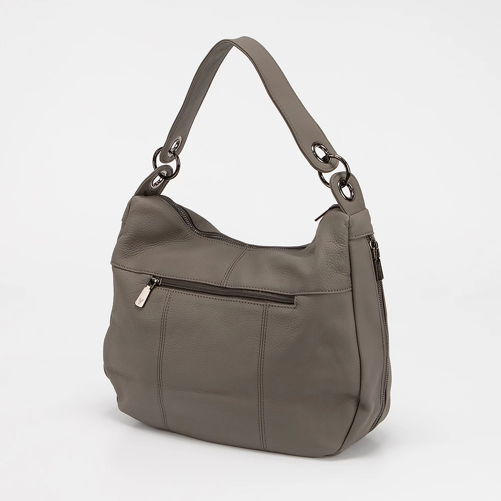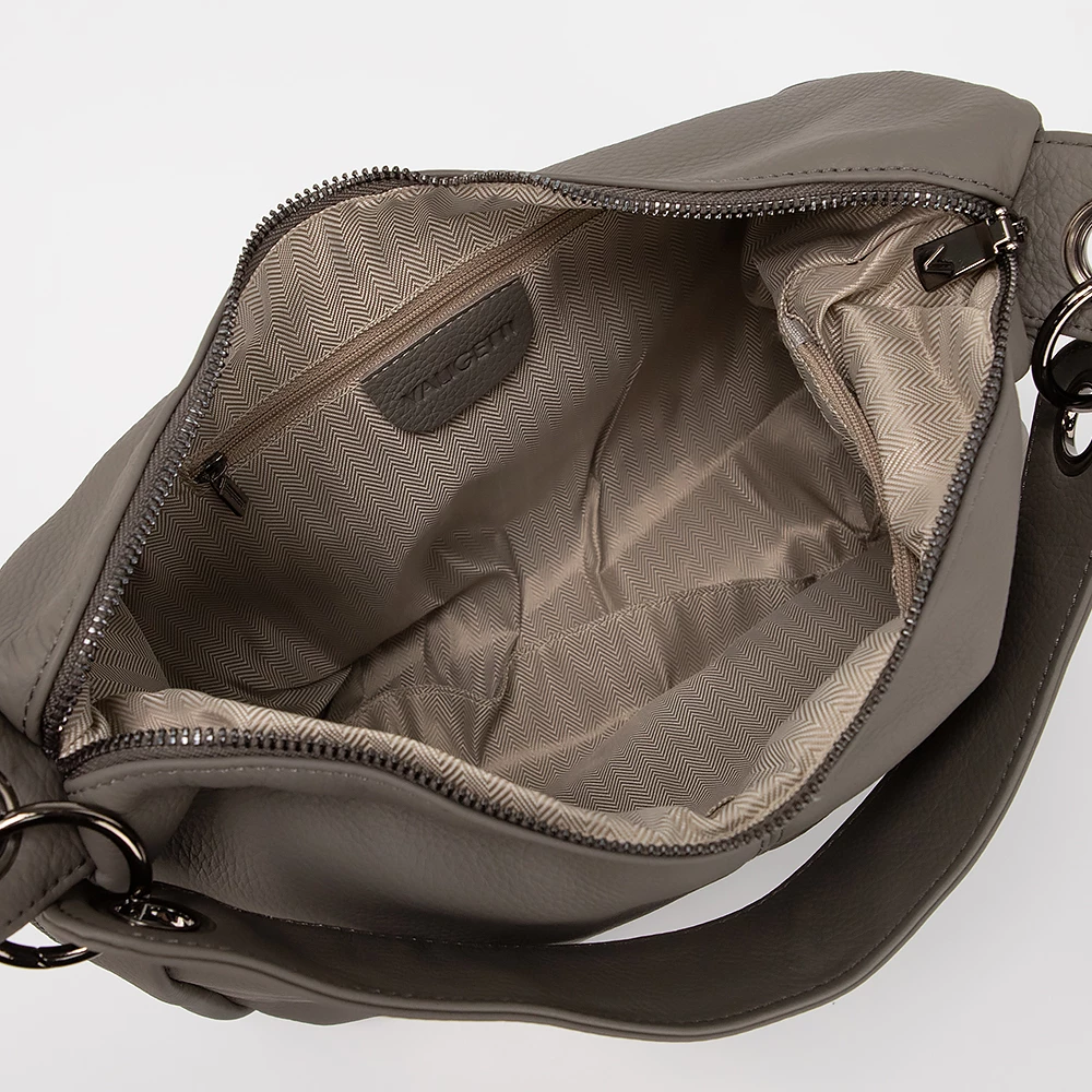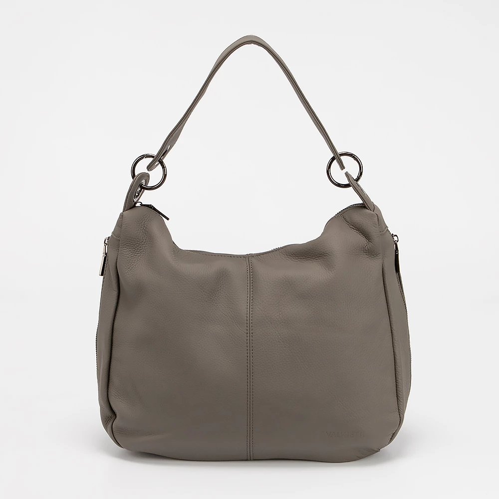 Сумка от бренда Valigetti выполнена из натуральной кожи серого цвета. Модель с удлиненной ручкой. Отделение на молнии. Внутри: текстильная подкладка, два кармана на молнии, накладной карман. По бокам — вертикальные карманы на молнии. С задней стороны — карман на молнии.