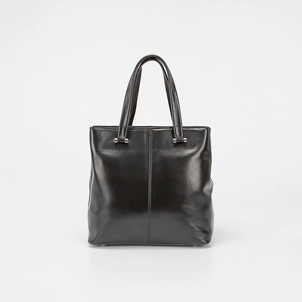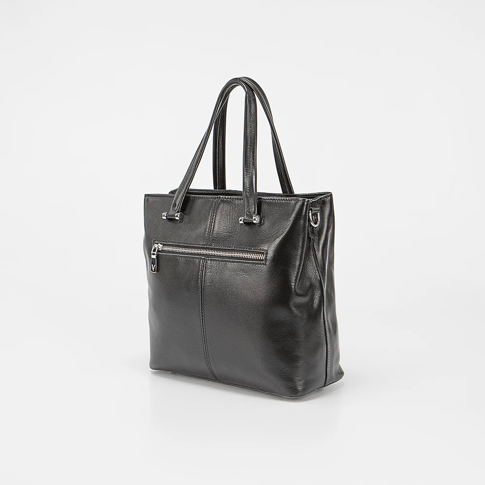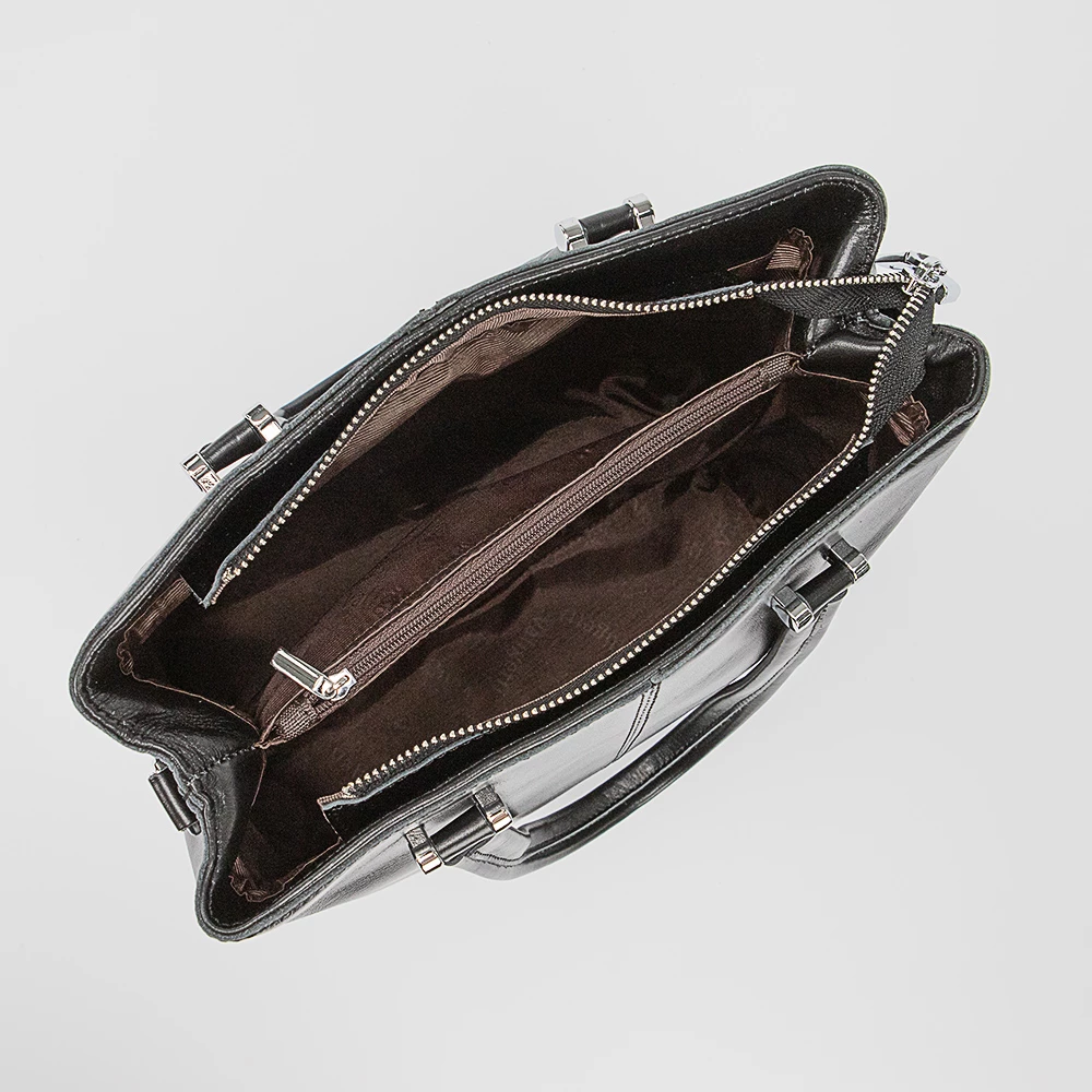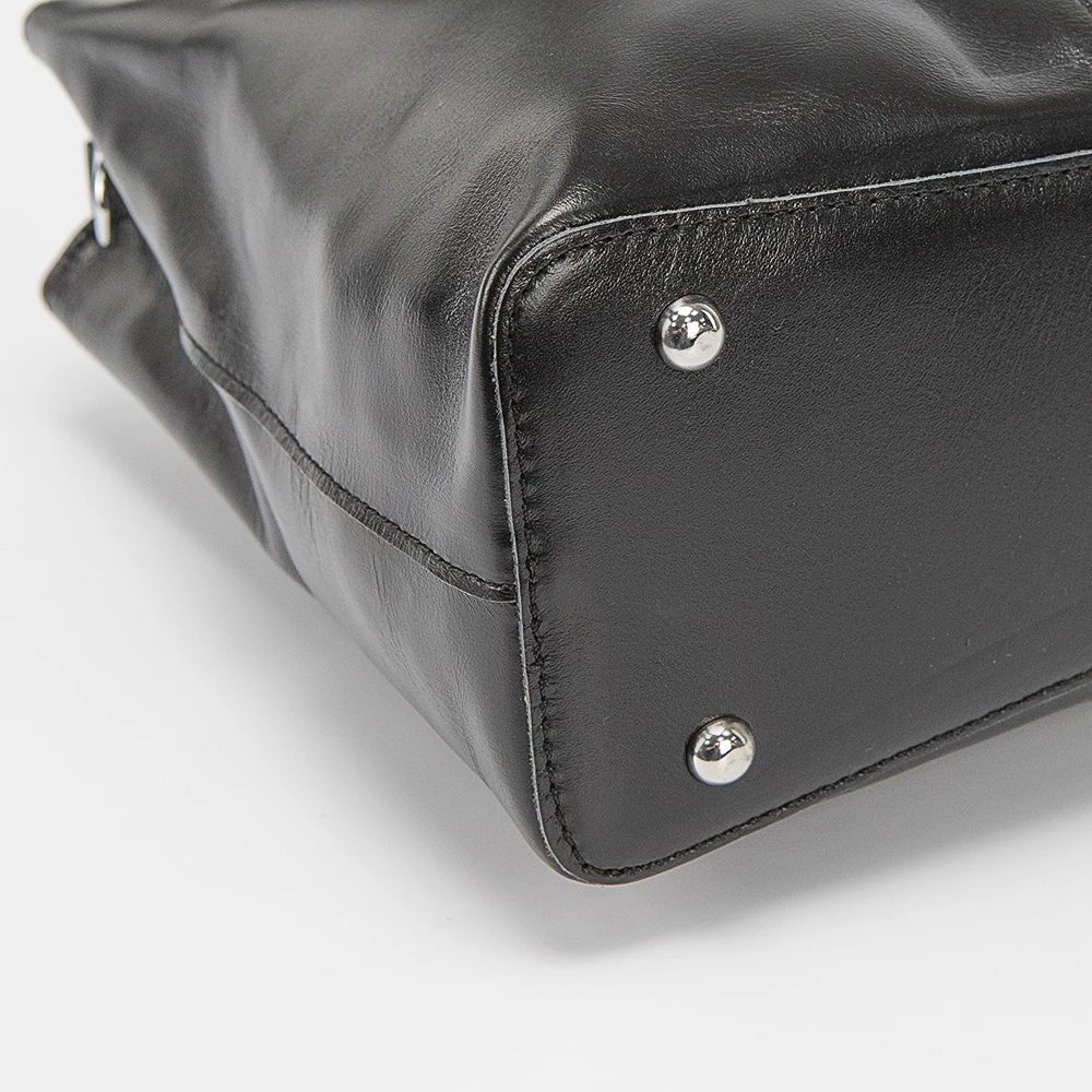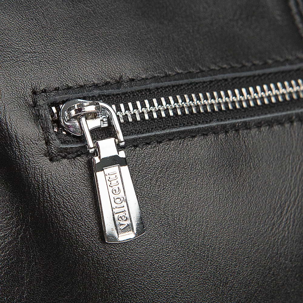Черная сумка 26x10x25 Valigetti из натуральной кожи. Модель с двумя длинными ручками и съемным регулируемым ремнем через плечо. Есть основное отделение на молнии. Внутри: фирменная подкладка и плотный карман с молнией. На задней стороне сумки – дополнительный карман с молнией. Дно защищено металлическими ножками.